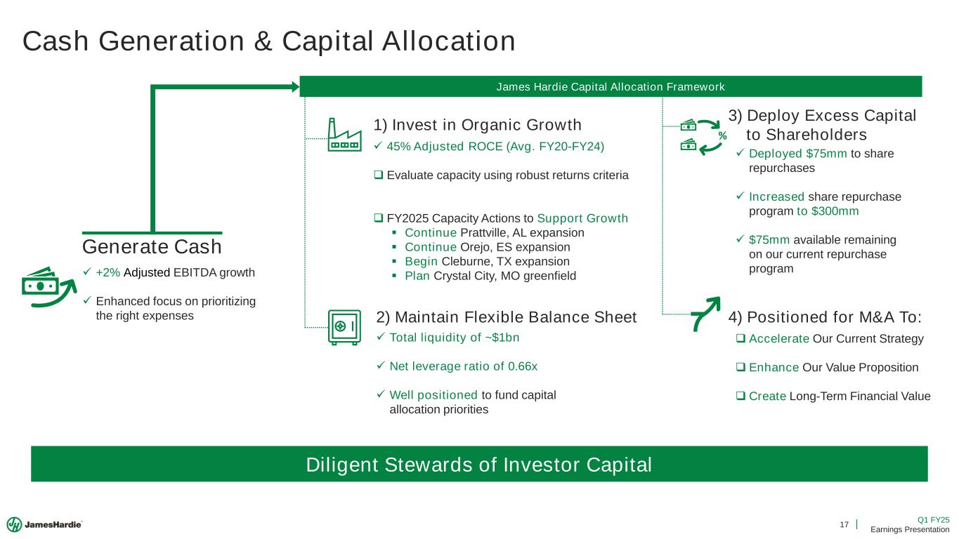 16 Q1 FY25 Earnings Presentation Guidance FY25Q2 FY25 North America Volume North America EBIT Margin Total Adjusted Net Income Reaffirming Our Full Year FY25 Guidance 705 – 735 mmsf Down (MSD%) to (HSD%) 2,950 – 3,150 mmsf +/- LSD% (unchanged) 29% – 31% (unchanged) $630 – 700mm (unchanged) 27.5% – 29.5% $135 – 155mm Note: Total Adjusted Net income guidance for the full year FY25 assumes $25mm to 29mm of adjusted net interest expense and a 23.0% to 24.5% adjusted effective tax rate. Capital Expenditures $500 – 550mm (unchanged)