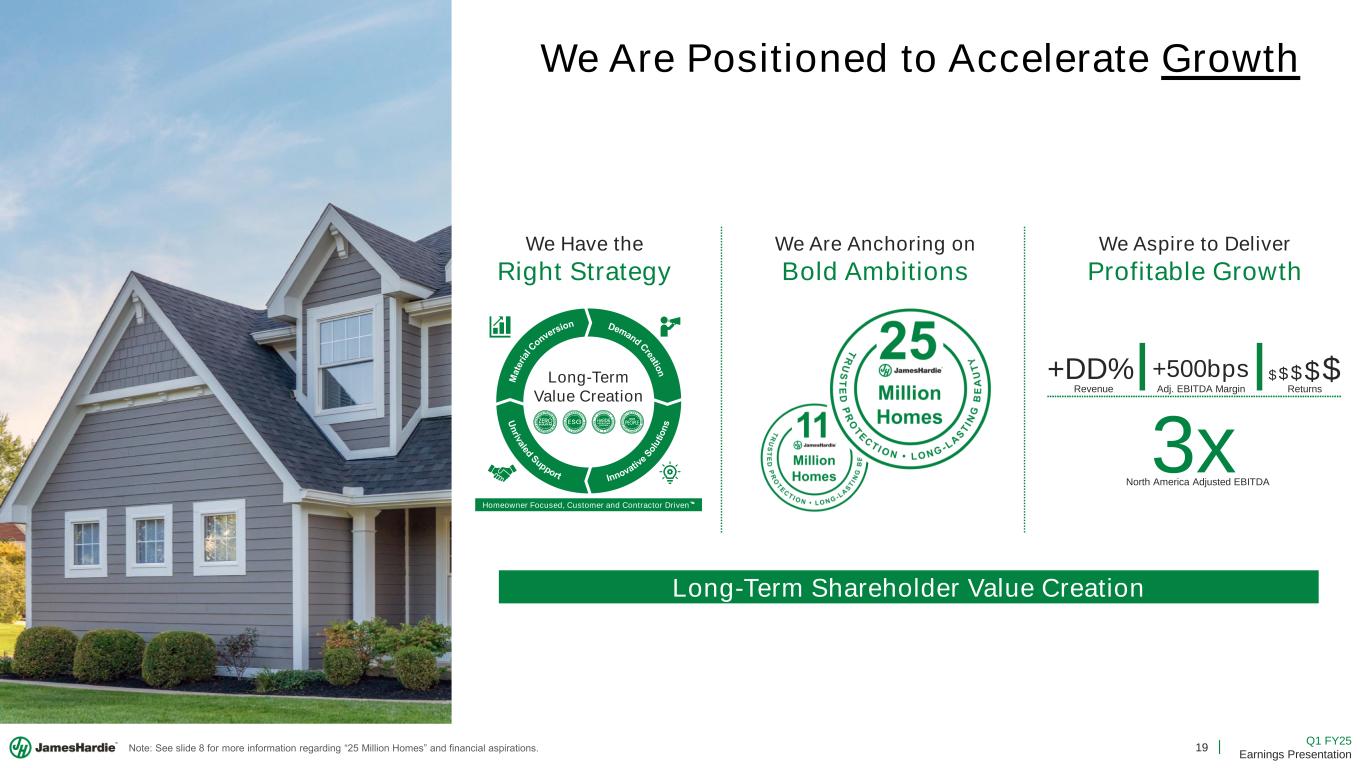 18 Q1 FY25 Earnings Presentation A History of Growth Established A Track Record of Growth Net Sales 10-Year CAGR FY24 +10% Adjusted ROCE 5-Year Average FY24 45% Adjusted Net Income 10-Year CAGR FY24 +14% Operating Cash Flow 3-Year Avg. FY24 vs. FY14 3x Foundations & Moats Superior Product Offering Customer & Contractor Focused Lean Operating Models Note: Net Sales and Adjusted Net Income CAGR each represent the period from FY14 to FY24. Operating cash flow compares the annual average for the periods FY22-FY24 and FY12-FY14.