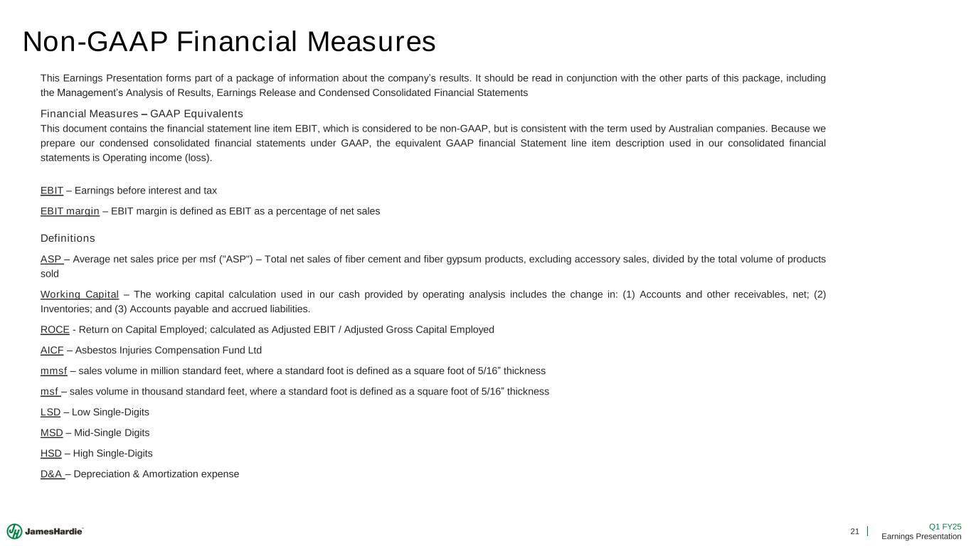 21 Q1 FY25 Earnings Presentation Non-GAAP Financial Measures This Earnings Presentation forms part of a package of information about the company’s results. It should be read in conjunction with the other parts of this package, including the Management’s Analysis of Results, Earnings Release and Condensed Consolidated Financial Statements Financial Measures – GAAP Equivalents This document contains the financial statement line item EBIT, which is considered to be non-GAAP, but is consistent with the term used by Australian companies. Because we prepare our condensed consolidated financial statements under GAAP, the equivalent GAAP financial Statement line item description used in our consolidated financial statements is Operating income (loss). EBIT – Earnings before interest and tax EBIT margin – EBIT margin is defined as EBIT as a percentage of net sales Definitions ASP – Average net sales price per msf ("ASP") – Total net sales of fiber cement and fiber gypsum products, excluding accessory sales, divided by the total volume of products sold Working Capital – The working capital calculation used in our cash provided by operating analysis includes the change in: (1) Accounts and other receivables, net; (2) Inventories; and (3) Accounts payable and accrued liabilities. ROCE - Return on Capital Employed; calculated as Adjusted EBIT / Adjusted Gross Capital Employed AICF – Asbestos Injuries Compensation Fund Ltd mmsf – sales volume in million standard feet, where a standard foot is defined as a square foot of 5/16” thickness msf – sales volume in thousand standard feet, where a standard foot is defined as a square foot of 5/16” thickness LSD – Low Single-Digits MSD – Mid-Single Digits HSD – High Single-Digits D&A – Depreciation & Amortization expense