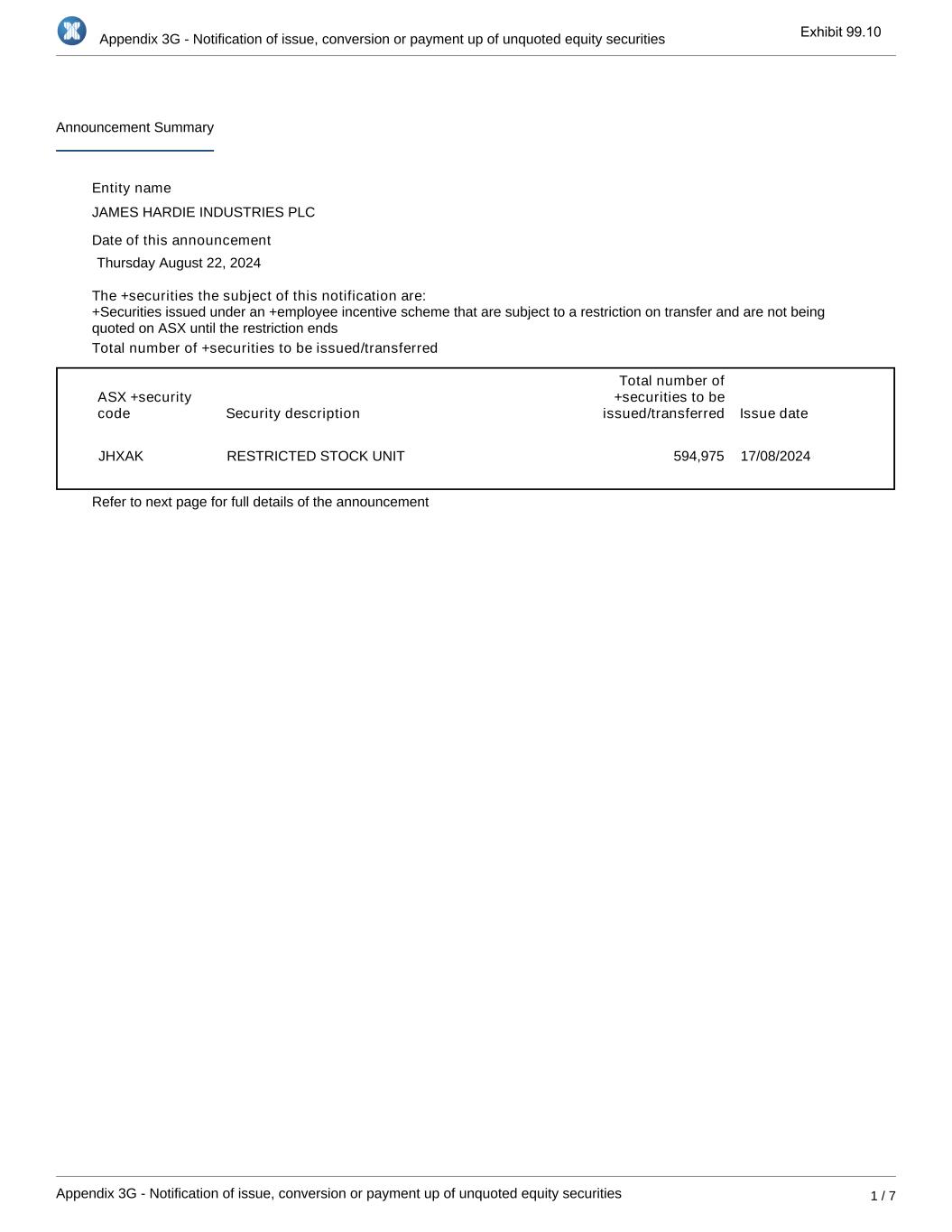 Appendix 3G - Notification of issue, conversion or payment up of unquoted equity securities Appendix 3G - Notification of issue, conversion or payment up of unquoted equity securities 1 / 7 Announcement Summary Entity name JAMES HARDIE INDUSTRIES PLC Date of this announcement Thursday August 22, 2024 The +securities the subject of this notification are: Total number of +securities to be issued/transferred ASX +security code Security description Total number of +securities to be issued/transferred Issue date JHXAK RESTRICTED STOCK UNIT 594,975 17/08/2024 Refer to next page for full details of the announcement +Securities issued under an +employee incentive scheme that are subject to a restriction on transfer and are not being quoted on ASX until the restriction ends Exhibit 99.10
