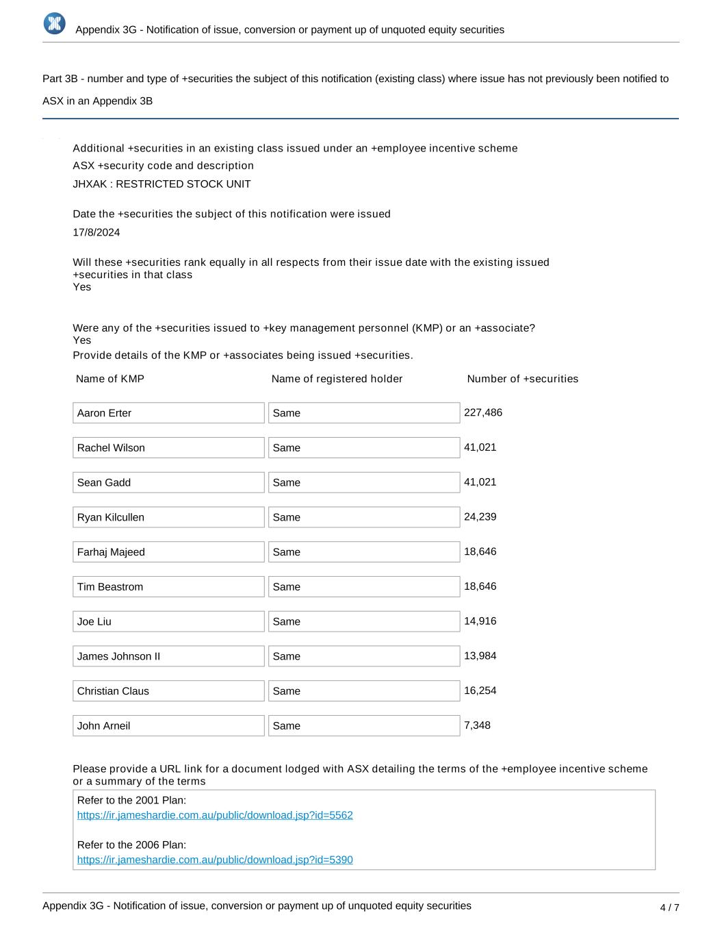 Appendix 3G - Notification of issue, conversion or payment up of unquoted equity securities Appendix 3G - Notification of issue, conversion or payment up of unquoted equity securities 4 / 7 Part 3B - number and type of +securities the subject of this notification (existing class) where issue has not previously been notified to ASX in an Appendix 3B Additional +securities in an existing class issued under an +employee incentive scheme ASX +security code and description JHXAK : RESTRICTED STOCK UNIT Date the +securities the subject of this notification were issued 17/8/2024 Will these +securities rank equally in all respects from their issue date with the existing issued +securities in that class Were any of the +securities issued to +key management personnel (KMP) or an +associate? Provide details of the KMP or +associates being issued +securities. Name of KMP Name of registered holder Number of +securities Aaron Erter Same 227,486 Rachel Wilson Same 41,021 Sean Gadd Same 41,021 Ryan Kilcullen Same 24,239 Farhaj Majeed Same 18,646 Tim Beastrom Same 18,646 Joe Liu Same 14,916 James Johnson II Same 13,984 Christian Claus Same 16,254 John Arneil Same 7,348 Please provide a URL link for a document lodged with ASX detailing the terms of the +employee incentive scheme or a summary of the terms Refer to the 2001 Plan: https://ir.jameshardie.com.au/public/download.jsp?id=5562 Refer to the 2006 Plan: https://ir.jameshardie.com.au/public/download.jsp?id=5390 Any other information the entity wishes to provide about the +securities the subject of this notification Yes Yes
