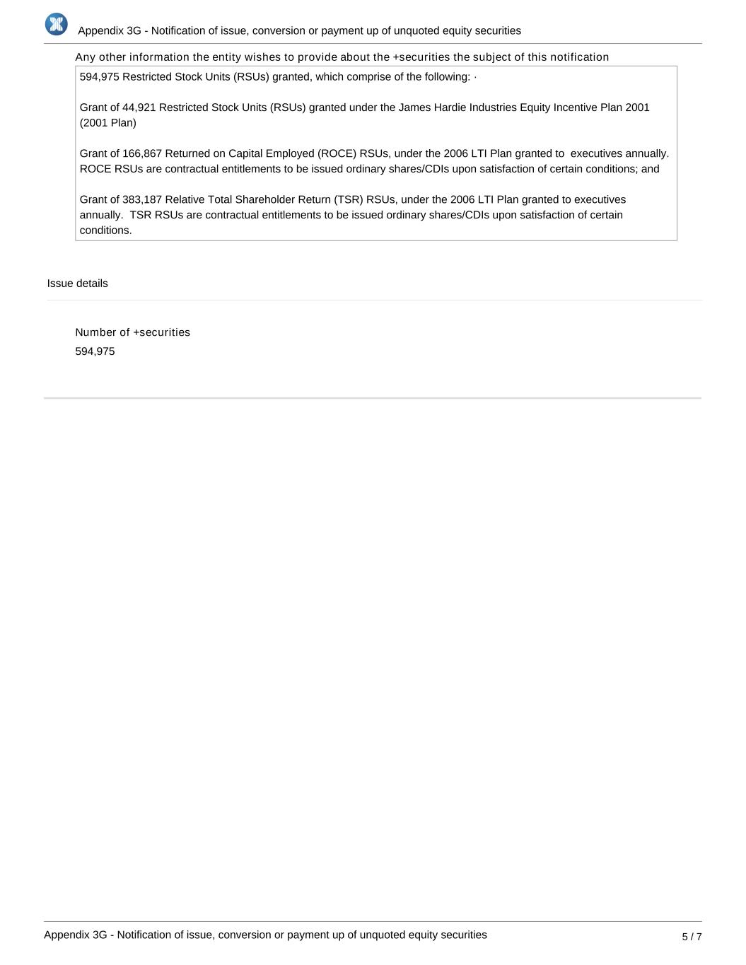 Appendix 3G - Notification of issue, conversion or payment up of unquoted equity securities Appendix 3G - Notification of issue, conversion or payment up of unquoted equity securities 5 / 7 Any other information the entity wishes to provide about the +securities the subject of this notification 594,975 Restricted Stock Units (RSUs) granted, which comprise of the following: ·  Grant of 44,921 Restricted Stock Units (RSUs) granted under the James Hardie Industries Equity Incentive Plan 2001 (2001 Plan)        Grant of 166,867 Returned on Capital Employed (ROCE) RSUs, under the 2006 LTI Plan granted to executives annually. ROCE RSUs are contractual entitlements to be issued ordinary shares/CDIs upon satisfaction of certain conditions; and Grant of 383,187 Relative Total Shareholder Return (TSR) RSUs, under the 2006 LTI Plan granted to executives annually. TSR RSUs are contractual entitlements to be issued ordinary shares/CDIs upon satisfaction of certain conditions. Issue details Number of +securities 594,975