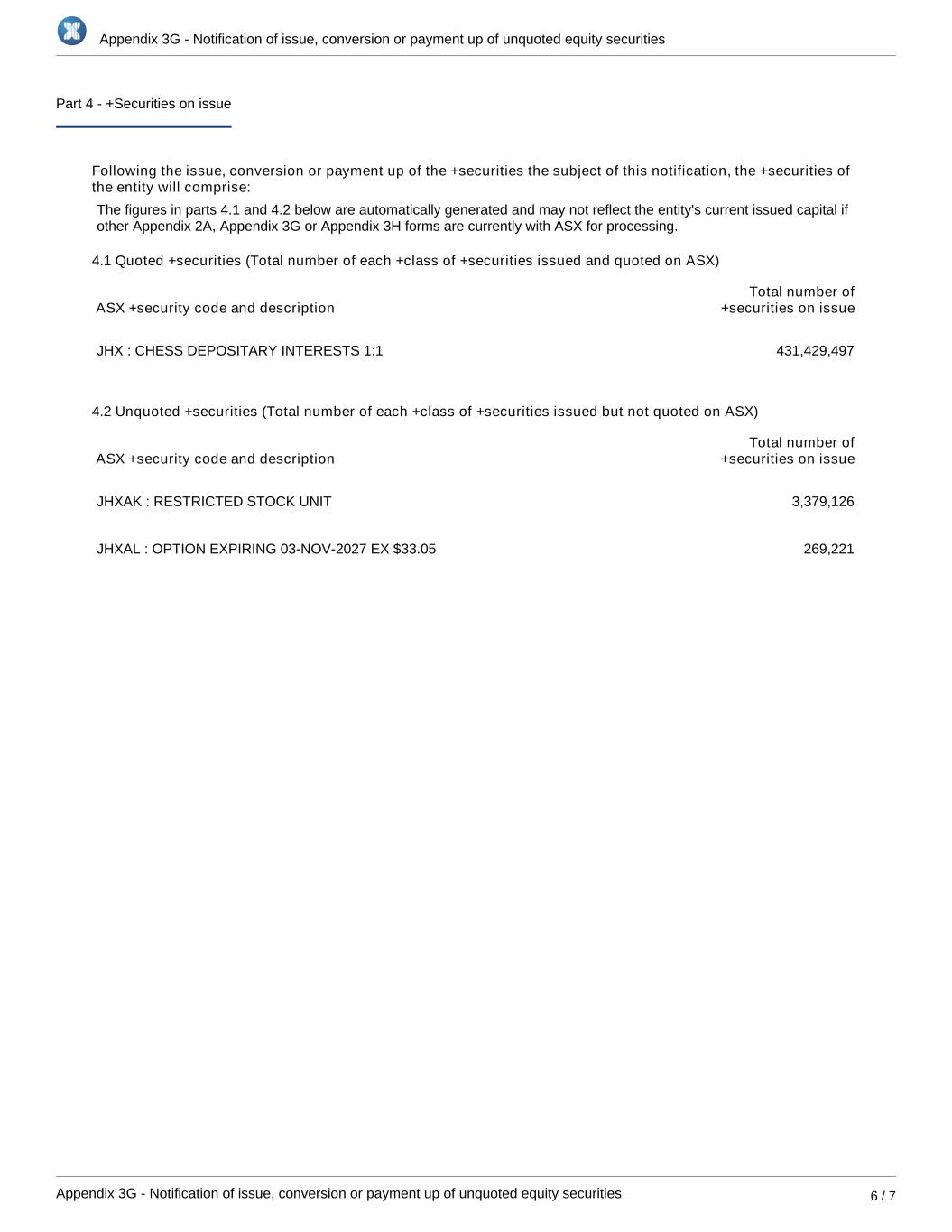 Appendix 3G - Notification of issue, conversion or payment up of unquoted equity securities Appendix 3G - Notification of issue, conversion or payment up of unquoted equity securities 6 / 7 Part 4 - +Securities on issue Following the issue, conversion or payment up of the +securities the subject of this notification, the +securities of the entity will comprise: The figures in parts 4.1 and 4.2 below are automatically generated and may not reflect the entity's current issued capital if other Appendix 2A, Appendix 3G or Appendix 3H forms are currently with ASX for processing. 4.1 Quoted +securities (Total number of each +class of +securities issued and quoted on ASX) ASX +security code and description Total number of +securities on issue JHX : CHESS DEPOSITARY INTERESTS 1:1 431,429,497 4.2 Unquoted +securities (Total number of each +class of +securities issued but not quoted on ASX) ASX +security code and description Total number of +securities on issue JHXAK : RESTRICTED STOCK UNIT 3,379,126 JHXAL : OPTION EXPIRING 03-NOV-2027 EX $33.05 269,221