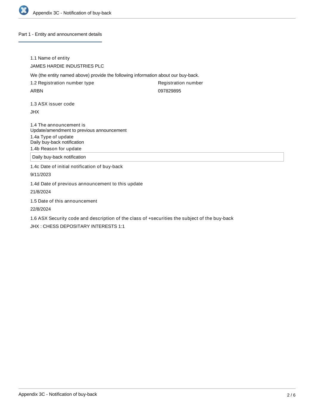 Appendix 3C - Notification of buy-back Appendix 3C - Notification of buy-back 2 / 6 Part 1 - Entity and announcement details 1.1 Name of entity JAMES HARDIE INDUSTRIES PLC We (the entity named above) provide the following information about our buy-back. 1.2 Registration number type ARBN Registration number 097829895 1.3 ASX issuer code JHX 1.4 The announcement is 1.4a Type of update 1.4b Reason for update Daily buy-back notification 1.4c Date of initial notification of buy-back 9/11/2023 1.4d Date of previous announcement to this update 21/8/2024 1.5 Date of this announcement 22/8/2024 1.6 ASX Security code and description of the class of +securities the subject of the buy-back JHX : CHESS DEPOSITARY INTERESTS 1:1 Daily buy-back notification Update/amendment to previous announcement