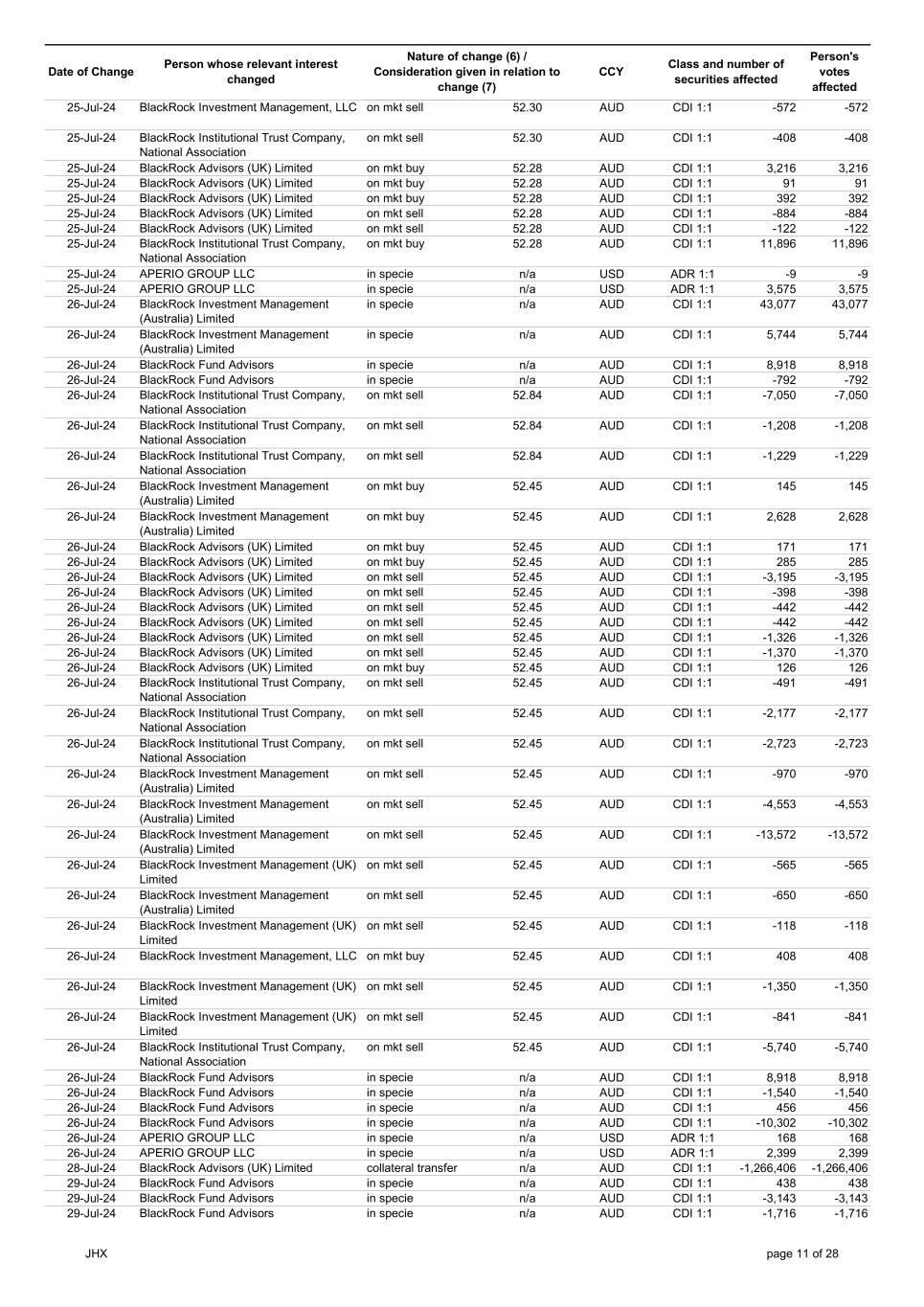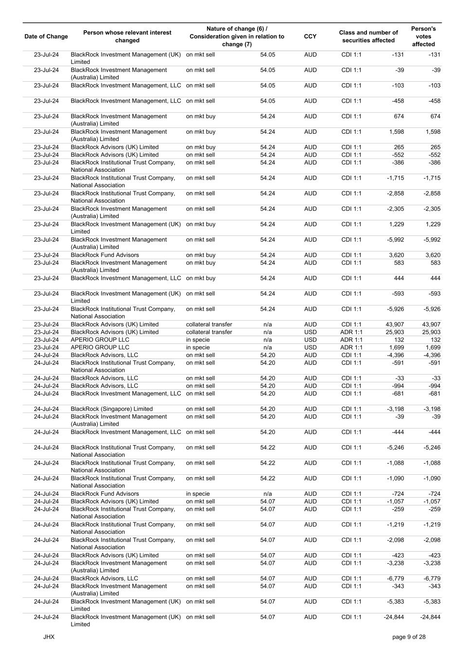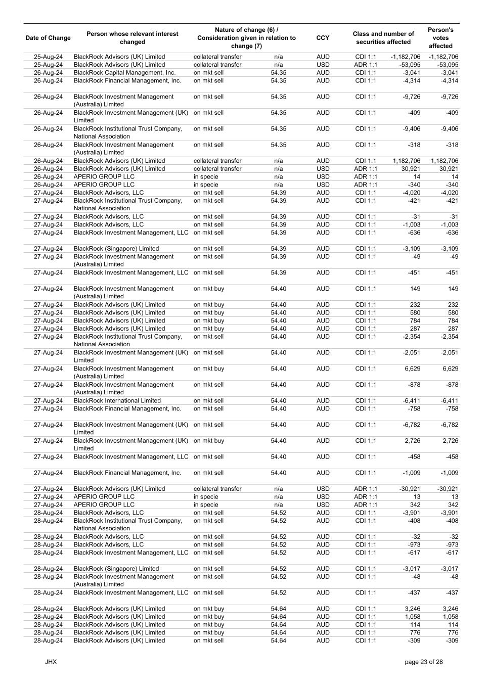Date of Change Person whose relevant interest changed Nature of change (6) / Consideration given in relation to change (7) Class and number of securities affected Person's votes affected CCY 24-Jul-24 BlackRock Asset Management Canada Limited on mkt sell 54.07 AUD CDI 1:1 -1,428 -1,428 24-Jul-24 BlackRock Investment Management, LLC on mkt sell 54.07 AUD CDI 1:1 -354 -354 24-Jul-24 BlackRock Advisors (UK) Limited collateral transfer n/a AUD CDI 1:1 -975,545 -975,545 24-Jul-24 BlackRock Advisors (UK) Limited collateral transfer n/a USD ADR 1:1 -25,903 -25,903 24-Jul-24 APERIO GROUP LLC in specie n/a USD ADR 1:1 -46 -46 24-Jul-24 APERIO GROUP LLC in specie n/a USD ADR 1:1 -220 -220 25-Jul-24 BlackRock Fund Advisors in specie n/a AUD CDI 1:1 -178 -178 25-Jul-24 BlackRock Advisors, LLC on mkt sell 52.72 AUD CDI 1:1 -4,396 -4,396 25-Jul-24 BlackRock Institutional Trust Company, National Association on mkt sell 52.72 AUD CDI 1:1 -592 -592 25-Jul-24 BlackRock Advisors, LLC on mkt sell 52.72 AUD CDI 1:1 -33 -33 25-Jul-24 BlackRock Advisors, LLC on mkt sell 52.72 AUD CDI 1:1 -994 -994 25-Jul-24 BlackRock Investment Management, LLC on mkt sell 52.72 AUD CDI 1:1 -681 -681 25-Jul-24 BlackRock (Singapore) Limited on mkt sell 52.72 AUD CDI 1:1 -3,198 -3,198 25-Jul-24 BlackRock Investment Management (Australia) Limited on mkt sell 52.72 AUD CDI 1:1 -38 -38 25-Jul-24 BlackRock Investment Management, LLC on mkt sell 52.72 AUD CDI 1:1 -444 -444 25-Jul-24 BlackRock Fund Advisors on mkt sell 52.31 AUD CDI 1:1 -3,723 -3,723 25-Jul-24 BlackRock Investment Management (UK) Limited on mkt sell 52.31 AUD CDI 1:1 -631 -631 25-Jul-24 BlackRock Advisors, LLC on mkt sell 52.31 AUD CDI 1:1 -4,844 -4,844 25-Jul-24 BlackRock Institutional Trust Company, National Association on mkt sell 52.31 AUD CDI 1:1 -3,769 -3,769 25-Jul-24 BlackRock Institutional Trust Company, National Association on mkt sell 52.31 AUD CDI 1:1 -1,622 -1,622 25-Jul-24 BlackRock Advisors, LLC on mkt sell 52.31 AUD CDI 1:1 -910 -910 25-Jul-24 BlackRock Advisors (UK) Limited on mkt sell 52.31 AUD CDI 1:1 -465 -465 25-Jul-24 BlackRock International Limited on mkt sell 52.31 AUD CDI 1:1 -751 -751 25-Jul-24 BlackRock Investment Management, LLC on mkt sell 52.31 AUD CDI 1:1 -612 -612 25-Jul-24 BlackRock Institutional Trust Company, National Association on mkt sell 52.30 AUD CDI 1:1 -1,476 -1,476 25-Jul-24 BlackRock Institutional Trust Company, National Association on mkt sell 52.30 AUD CDI 1:1 -1,742 -1,742 25-Jul-24 BlackRock Capital Management, Inc. on mkt sell 52.30 AUD CDI 1:1 -1,897 -1,897 25-Jul-24 BlackRock Japan Co., Ltd. on mkt sell 52.30 AUD CDI 1:1 -16,930 -16,930 25-Jul-24 BlackRock Japan Co., Ltd. on mkt sell 52.30 AUD CDI 1:1 -7,129 -7,129 25-Jul-24 BlackRock Japan Co., Ltd. on mkt sell 52.30 AUD CDI 1:1 -1,076 -1,076 25-Jul-24 BlackRock Japan Co., Ltd. on mkt sell 52.30 AUD CDI 1:1 -1,185 -1,185 25-Jul-24 BlackRock Japan Co., Ltd. on mkt sell 52.30 AUD CDI 1:1 -1,392 -1,392 25-Jul-24 BlackRock Japan Co., Ltd. on mkt sell 52.30 AUD CDI 1:1 -901 -901 25-Jul-24 BlackRock Advisors, LLC on mkt sell 52.30 AUD CDI 1:1 -2,660 -2,660 25-Jul-24 BlackRock Financial Management, Inc. on mkt sell 52.30 AUD CDI 1:1 -2,810 -2,810 25-Jul-24 BlackRock Financial Management, Inc. on mkt sell 52.30 AUD CDI 1:1 -1,579 -1,579 25-Jul-24 BlackRock Investment Management (UK) Limited on mkt sell 52.30 AUD CDI 1:1 -2,906 -2,906 25-Jul-24 BlackRock Investment Management, LLC on mkt sell 52.30 AUD CDI 1:1 -3,834 -3,834 25-Jul-24 BlackRock Investment Management (Australia) Limited on mkt sell 52.30 AUD CDI 1:1 -10,540 -10,540 25-Jul-24 BlackRock Investment Management (Australia) Limited on mkt sell 52.30 AUD CDI 1:1 -11,824 -11,824 25-Jul-24 BlackRock Institutional Trust Company, National Association on mkt sell 52.30 AUD CDI 1:1 -326 -326 25-Jul-24 BlackRock Investment Management, LLC on mkt sell 52.30 AUD CDI 1:1 -494 -494 25-Jul-24 BlackRock Institutional Trust Company, National Association on mkt sell 52.30 AUD CDI 1:1 -292 -292 25-Jul-24 BlackRock Advisors (UK) Limited on mkt sell 52.30 AUD CDI 1:1 -369 -369 25-Jul-24 BlackRock Advisors, LLC on mkt sell 52.30 AUD CDI 1:1 -442 -442 25-Jul-24 BlackRock Japan Co., Ltd. on mkt sell 52.30 AUD CDI 1:1 -554 -554 25-Jul-24 BlackRock Advisors, LLC on mkt sell 52.30 AUD CDI 1:1 -9 -9 25-Jul-24 BlackRock Advisors, LLC on mkt sell 52.30 AUD CDI 1:1 -218 -218 25-Jul-24 BlackRock Investment Management (UK) Limited on mkt sell 52.30 AUD CDI 1:1 -391 -391 25-Jul-24 BlackRock Investment Management (UK) Limited on mkt sell 52.30 AUD CDI 1:1 -322 -322 25-Jul-24 BlackRock Institutional Trust Company, National Association on mkt sell 52.30 AUD CDI 1:1 -164 -164 JHX page 10 of 28