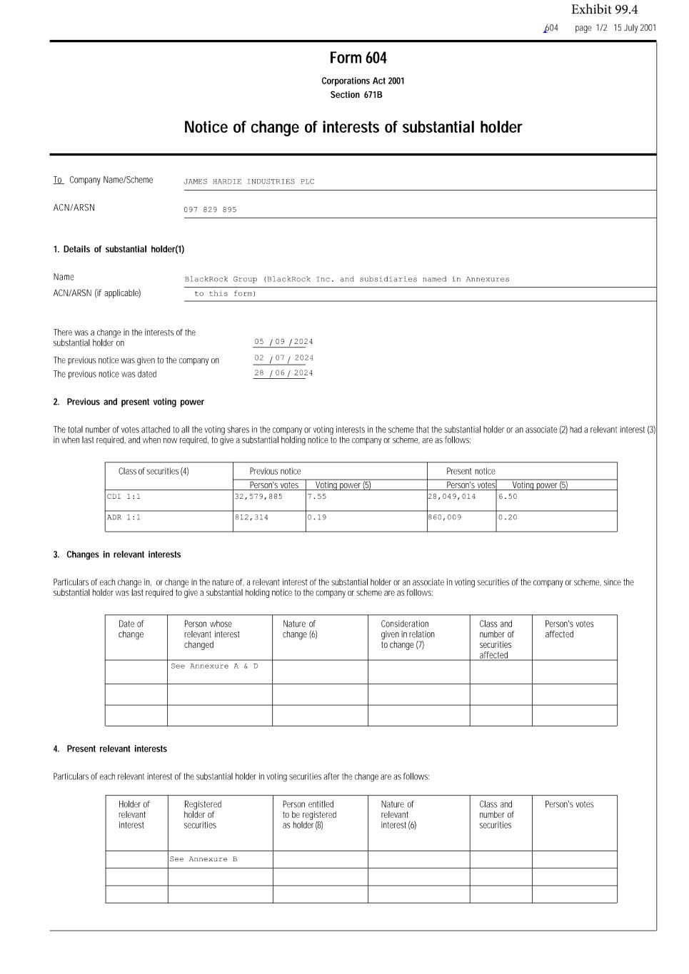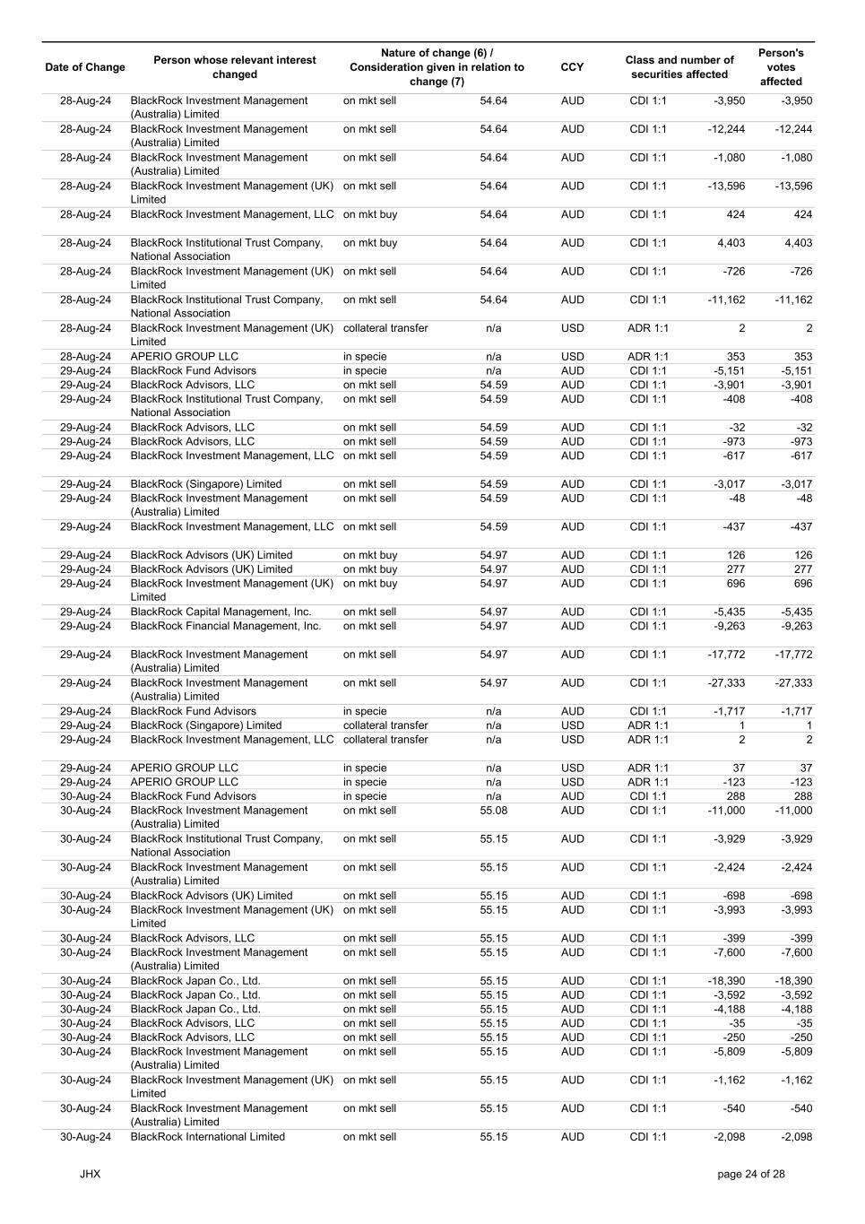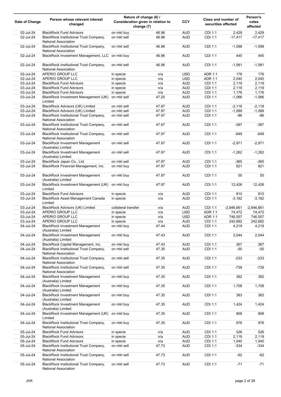 Date of Change Person whose relevant interest changed Nature of change (6) / Consideration given in relation to change (7) Class and number of securities affected Person's votes affected CCY 24-Jul-24 BlackRock Asset Management Canada Limited on mkt sell 54.07 AUD CDI 1:1 -1,428 -1,428 24-Jul-24 BlackRock Investment Management, LLC on mkt sell 54.07 AUD CDI 1:1 -354 -354 24-Jul-24 BlackRock Advisors (UK) Limited collateral transfer n/a AUD CDI 1:1 -975,545 -975,545 24-Jul-24 BlackRock Advisors (UK) Limited collateral transfer n/a USD ADR 1:1 -25,903 -25,903 24-Jul-24 APERIO GROUP LLC in specie n/a USD ADR 1:1 -46 -46 24-Jul-24 APERIO GROUP LLC in specie n/a USD ADR 1:1 -220 -220 25-Jul-24 BlackRock Fund Advisors in specie n/a AUD CDI 1:1 -178 -178 25-Jul-24 BlackRock Advisors, LLC on mkt sell 52.72 AUD CDI 1:1 -4,396 -4,396 25-Jul-24 BlackRock Institutional Trust Company, National Association on mkt sell 52.72 AUD CDI 1:1 -592 -592 25-Jul-24 BlackRock Advisors, LLC on mkt sell 52.72 AUD CDI 1:1 -33 -33 25-Jul-24 BlackRock Advisors, LLC on mkt sell 52.72 AUD CDI 1:1 -994 -994 25-Jul-24 BlackRock Investment Management, LLC on mkt sell 52.72 AUD CDI 1:1 -681 -681 25-Jul-24 BlackRock (Singapore) Limited on mkt sell 52.72 AUD CDI 1:1 -3,198 -3,198 25-Jul-24 BlackRock Investment Management (Australia) Limited on mkt sell 52.72 AUD CDI 1:1 -38 -38 25-Jul-24 BlackRock Investment Management, LLC on mkt sell 52.72 AUD CDI 1:1 -444 -444 25-Jul-24 BlackRock Fund Advisors on mkt sell 52.31 AUD CDI 1:1 -3,723 -3,723 25-Jul-24 BlackRock Investment Management (UK) Limited on mkt sell 52.31 AUD CDI 1:1 -631 -631 25-Jul-24 BlackRock Advisors, LLC on mkt sell 52.31 AUD CDI 1:1 -4,844 -4,844 25-Jul-24 BlackRock Institutional Trust Company, National Association on mkt sell 52.31 AUD CDI 1:1 -3,769 -3,769 25-Jul-24 BlackRock Institutional Trust Company, National Association on mkt sell 52.31 AUD CDI 1:1 -1,622 -1,622 25-Jul-24 BlackRock Advisors, LLC on mkt sell 52.31 AUD CDI 1:1 -910 -910 25-Jul-24 BlackRock Advisors (UK) Limited on mkt sell 52.31 AUD CDI 1:1 -465 -465 25-Jul-24 BlackRock International Limited on mkt sell 52.31 AUD CDI 1:1 -751 -751 25-Jul-24 BlackRock Investment Management, LLC on mkt sell 52.31 AUD CDI 1:1 -612 -612 25-Jul-24 BlackRock Institutional Trust Company, National Association on mkt sell 52.30 AUD CDI 1:1 -1,476 -1,476 25-Jul-24 BlackRock Institutional Trust Company, National Association on mkt sell 52.30 AUD CDI 1:1 -1,742 -1,742 25-Jul-24 BlackRock Capital Management, Inc. on mkt sell 52.30 AUD CDI 1:1 -1,897 -1,897 25-Jul-24 BlackRock Japan Co., Ltd. on mkt sell 52.30 AUD CDI 1:1 -16,930 -16,930 25-Jul-24 BlackRock Japan Co., Ltd. on mkt sell 52.30 AUD CDI 1:1 -7,129 -7,129 25-Jul-24 BlackRock Japan Co., Ltd. on mkt sell 52.30 AUD CDI 1:1 -1,076 -1,076 25-Jul-24 BlackRock Japan Co., Ltd. on mkt sell 52.30 AUD CDI 1:1 -1,185 -1,185 25-Jul-24 BlackRock Japan Co., Ltd. on mkt sell 52.30 AUD CDI 1:1 -1,392 -1,392 25-Jul-24 BlackRock Japan Co., Ltd. on mkt sell 52.30 AUD CDI 1:1 -901 -901 25-Jul-24 BlackRock Advisors, LLC on mkt sell 52.30 AUD CDI 1:1 -2,660 -2,660 25-Jul-24 BlackRock Financial Management, Inc. on mkt sell 52.30 AUD CDI 1:1 -2,810 -2,810 25-Jul-24 BlackRock Financial Management, Inc. on mkt sell 52.30 AUD CDI 1:1 -1,579 -1,579 25-Jul-24 BlackRock Investment Management (UK) Limited on mkt sell 52.30 AUD CDI 1:1 -2,906 -2,906 25-Jul-24 BlackRock Investment Management, LLC on mkt sell 52.30 AUD CDI 1:1 -3,834 -3,834 25-Jul-24 BlackRock Investment Management (Australia) Limited on mkt sell 52.30 AUD CDI 1:1 -10,540 -10,540 25-Jul-24 BlackRock Investment Management (Australia) Limited on mkt sell 52.30 AUD CDI 1:1 -11,824 -11,824 25-Jul-24 BlackRock Institutional Trust Company, National Association on mkt sell 52.30 AUD CDI 1:1 -326 -326 25-Jul-24 BlackRock Investment Management, LLC on mkt sell 52.30 AUD CDI 1:1 -494 -494 25-Jul-24 BlackRock Institutional Trust Company, National Association on mkt sell 52.30 AUD CDI 1:1 -292 -292 25-Jul-24 BlackRock Advisors (UK) Limited on mkt sell 52.30 AUD CDI 1:1 -369 -369 25-Jul-24 BlackRock Advisors, LLC on mkt sell 52.30 AUD CDI 1:1 -442 -442 25-Jul-24 BlackRock Japan Co., Ltd. on mkt sell 52.30 AUD CDI 1:1 -554 -554 25-Jul-24 BlackRock Advisors, LLC on mkt sell 52.30 AUD CDI 1:1 -9 -9 25-Jul-24 BlackRock Advisors, LLC on mkt sell 52.30 AUD CDI 1:1 -218 -218 25-Jul-24 BlackRock Investment Management (UK) Limited on mkt sell 52.30 AUD CDI 1:1 -391 -391 25-Jul-24 BlackRock Investment Management (UK) Limited on mkt sell 52.30 AUD CDI 1:1 -322 -322 25-Jul-24 BlackRock Institutional Trust Company, National Association on mkt sell 52.30 AUD CDI 1:1 -164 -164 JHX page 10 of 28