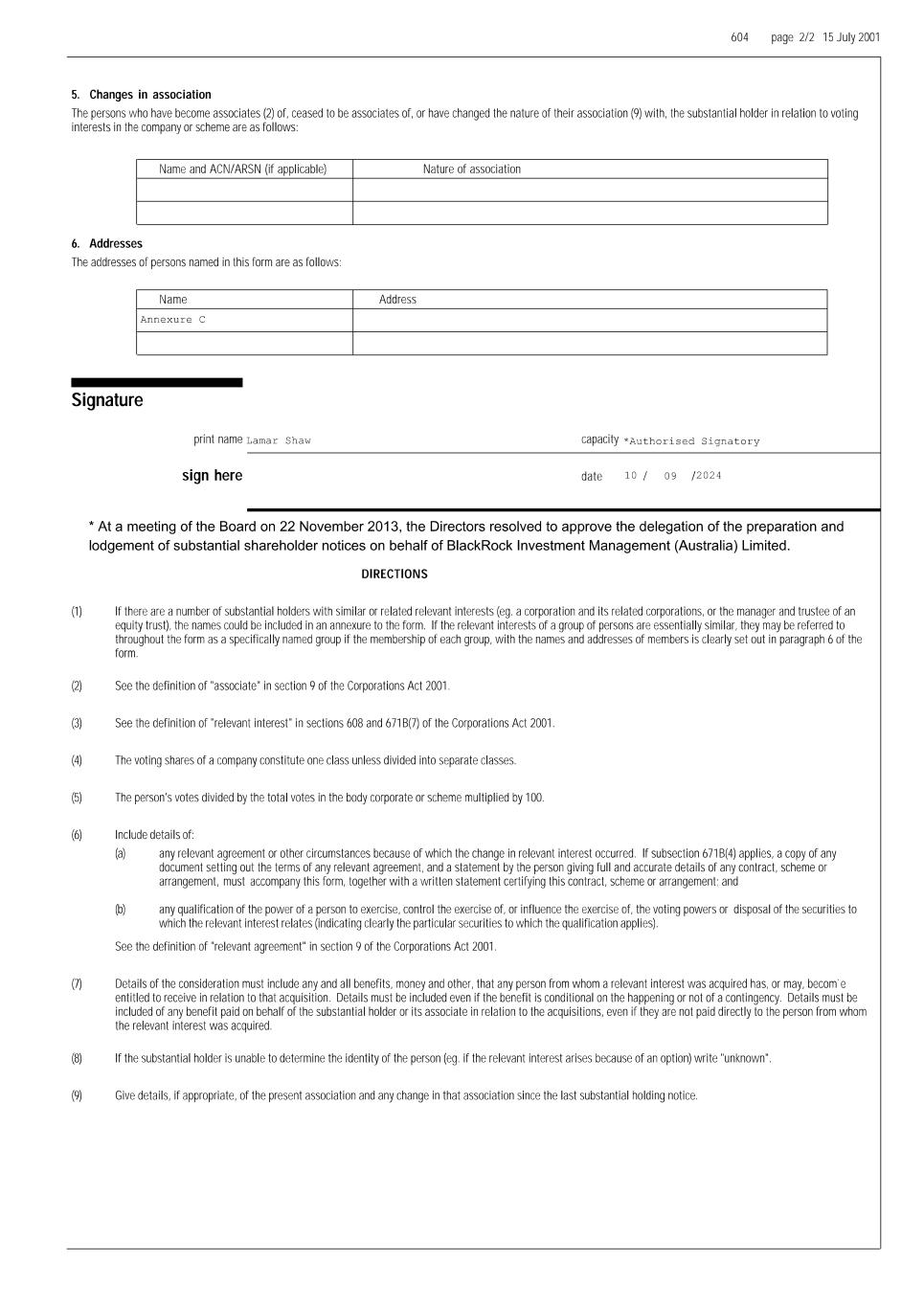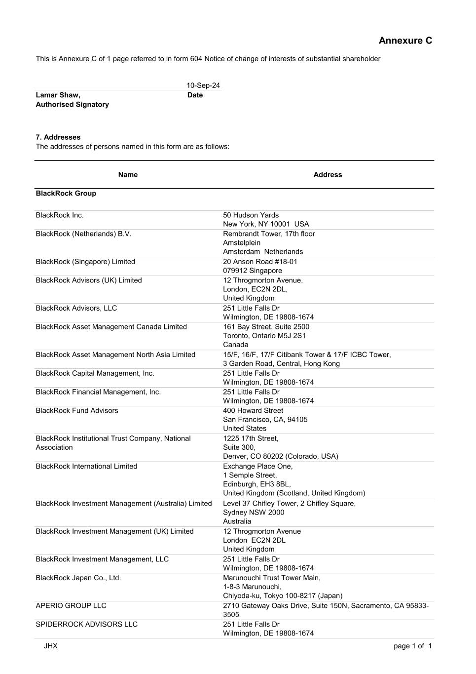 Annexure C This is Annexure C of 1 page referred to in form 604 Notice of change of interests of substantial shareholder 10-Sep-24 Lamar Shaw, Date Authorised Signatory 7. Addresses The addresses of persons named in this form are as follows: Name Address BlackRock Group BlackRock Inc. 50 Hudson Yards New York, NY 10001 USA BlackRock (Netherlands) B.V. Rembrandt Tower, 17th floor Amstelplein Amsterdam Netherlands BlackRock (Singapore) Limited 20 Anson Road #18-01 079912 Singapore BlackRock Advisors (UK) Limited 12 Throgmorton Avenue. London, EC2N 2DL, United Kingdom BlackRock Advisors, LLC 251 Little Falls Dr Wilmington, DE 19808-1674 BlackRock Asset Management Canada Limited 161 Bay Street, Suite 2500 Toronto, Ontario M5J 2S1 Canada BlackRock Asset Management North Asia Limited 15/F, 16/F, 17/F Citibank Tower & 17/F ICBC Tower, 3 Garden Road, Central, Hong Kong BlackRock Capital Management, Inc. 251 Little Falls Dr Wilmington, DE 19808-1674 BlackRock Financial Management, Inc. 251 Little Falls Dr Wilmington, DE 19808-1674 BlackRock Fund Advisors 400 Howard Street San Francisco, CA, 94105 United States BlackRock Institutional Trust Company, National Association 1225 17th Street, Suite 300, Denver, CO 80202 (Colorado, USA) BlackRock International Limited Exchange Place One, 1 Semple Street, Edinburgh, EH3 8BL, United Kingdom (Scotland, United Kingdom) BlackRock Investment Management (Australia) Limited Level 37 Chifley Tower, 2 Chifley Square, Sydney NSW 2000 Australia BlackRock Investment Management (UK) Limited 12 Throgmorton Avenue London EC2N 2DL United Kingdom BlackRock Investment Management, LLC 251 Little Falls Dr Wilmington, DE 19808-1674 BlackRock Japan Co., Ltd. Marunouchi Trust Tower Main, 1-8-3 Marunouchi, Chiyoda-ku, Tokyo 100-8217 (Japan) APERIO GROUP LLC 2710 Gateway Oaks Drive, Suite 150N, Sacramento, CA 95833- 3505 SPIDERROCK ADVISORS LLC 251 Little Falls Dr Wilmington, DE 19808-1674 JHX page 1 of 1