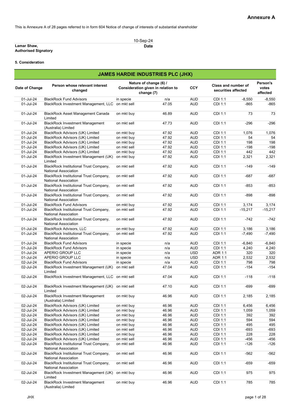 Annexure A This is Annexure A of 28 pages referred to in form 604 Notice of change of interests of substantial shareholder 10-Sep-24 Date 5. Consideration 01-Jul-24 BlackRock Fund Advisors in specie n/a AUD CDI 1:1 -8,550 -8,550 01-Jul-24 BlackRock Investment Management, LLC on mkt sell 47.05 AUD CDI 1:1 -865 -865 01-Jul-24 BlackRock Asset Management Canada Limited on mkt buy 46.89 AUD CDI 1:1 73 73 01-Jul-24 BlackRock Investment Management (Australia) Limited on mkt sell 47.73 AUD CDI 1:1 -296 -296 01-Jul-24 BlackRock Advisors (UK) Limited on mkt buy 47.92 AUD CDI 1:1 1,076 1,076 01-Jul-24 BlackRock Advisors (UK) Limited on mkt buy 47.92 AUD CDI 1:1 54 54 01-Jul-24 BlackRock Advisors (UK) Limited on mkt buy 47.92 AUD CDI 1:1 198 198 01-Jul-24 BlackRock Advisors (UK) Limited on mkt sell 47.92 AUD CDI 1:1 -198 -198 01-Jul-24 BlackRock Advisors (UK) Limited on mkt buy 47.92 AUD CDI 1:1 442 442 01-Jul-24 BlackRock Investment Management (UK) Limited on mkt buy 47.92 AUD CDI 1:1 2,321 2,321 01-Jul-24 BlackRock Institutional Trust Company, National Association on mkt sell 47.92 AUD CDI 1:1 -149 -149 01-Jul-24 BlackRock Institutional Trust Company, National Association on mkt sell 47.92 AUD CDI 1:1 -687 -687 01-Jul-24 BlackRock Institutional Trust Company, National Association on mkt sell 47.92 AUD CDI 1:1 -853 -853 01-Jul-24 BlackRock Institutional Trust Company, National Association on mkt sell 47.92 AUD CDI 1:1 -898 -898 01-Jul-24 BlackRock Fund Advisors on mkt buy 47.92 AUD CDI 1:1 3,174 3,174 01-Jul-24 BlackRock Institutional Trust Company, National Association on mkt sell 47.92 AUD CDI 1:1 -15,217 -15,217 01-Jul-24 BlackRock Institutional Trust Company, National Association on mkt sell 47.92 AUD CDI 1:1 -742 -742 01-Jul-24 BlackRock Advisors, LLC on mkt buy 47.92 AUD CDI 1:1 3,186 3,186 01-Jul-24 BlackRock Institutional Trust Company, National Association on mkt sell 47.92 AUD CDI 1:1 -7,490 -7,490 01-Jul-24 BlackRock Fund Advisors in specie n/a AUD CDI 1:1 -6,840 -6,840 01-Jul-24 BlackRock Fund Advisors in specie n/a AUD CDI 1:1 4,240 4,240 01-Jul-24 APERIO GROUP LLC in specie n/a USD ADR 1:1 320 320 01-Jul-24 APERIO GROUP LLC in specie n/a USD ADR 1:1 2,532 2,532 02-Jul-24 BlackRock Fund Advisors in specie n/a AUD CDI 1:1 798 798 02-Jul-24 BlackRock Investment Management (UK) Limited on mkt sell 47.04 AUD CDI 1:1 -154 -154 02-Jul-24 BlackRock Investment Management, LLC on mkt sell 47.04 AUD CDI 1:1 -118 -118 02-Jul-24 BlackRock Investment Management (UK) Limited on mkt sell 47.10 AUD CDI 1:1 -699 -699 02-Jul-24 BlackRock Investment Management (Australia) Limited on mkt buy 46.96 AUD CDI 1:1 2,185 2,185 02-Jul-24 BlackRock Advisors (UK) Limited on mkt buy 46.96 AUD CDI 1:1 6,456 6,456 02-Jul-24 BlackRock Advisors (UK) Limited on mkt buy 46.96 AUD CDI 1:1 1,059 1,059 02-Jul-24 BlackRock Advisors (UK) Limited on mkt buy 46.96 AUD CDI 1:1 392 392 02-Jul-24 BlackRock Advisors (UK) Limited on mkt buy 46.96 AUD CDI 1:1 594 594 02-Jul-24 BlackRock Advisors (UK) Limited on mkt buy 46.96 AUD CDI 1:1 495 495 02-Jul-24 BlackRock Advisors (UK) Limited on mkt sell 46.96 AUD CDI 1:1 -693 -693 02-Jul-24 BlackRock Advisors (UK) Limited on mkt buy 46.96 AUD CDI 1:1 228 228 02-Jul-24 BlackRock Advisors (UK) Limited on mkt sell 46.96 AUD CDI 1:1 -456 -456 02-Jul-24 BlackRock Institutional Trust Company, National Association on mkt sell 46.96 AUD CDI 1:1 -126 -126 02-Jul-24 BlackRock Institutional Trust Company, National Association on mkt sell 46.96 AUD CDI 1:1 -562 -562 02-Jul-24 BlackRock Institutional Trust Company, National Association on mkt sell 46.96 AUD CDI 1:1 -659 -659 02-Jul-24 BlackRock Investment Management (UK) Limited on mkt buy 46.96 AUD CDI 1:1 975 975 02-Jul-24 BlackRock Investment Management (Australia) Limited on mkt buy 46.96 AUD CDI 1:1 785 785 Lamar Shaw, Authorised Signatory JAMES HARDIE INDUSTRIES PLC (JHX) Date of Change Person whose relevant interest changed Nature of change (6) / Consideration given in relation to change (7) Class and number of securities affected Person's votes affected CCY JHX page 1 of 28