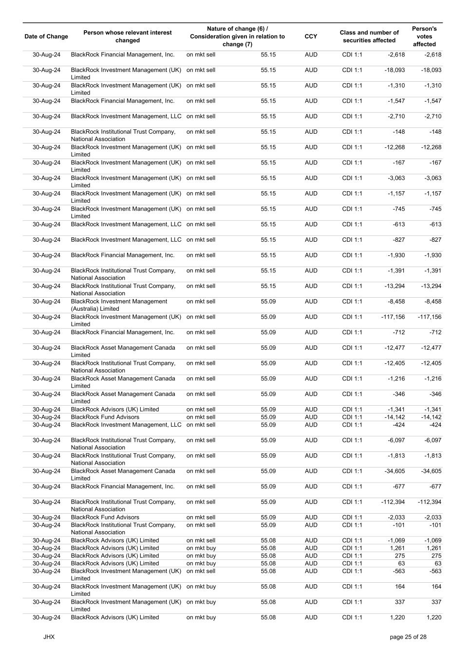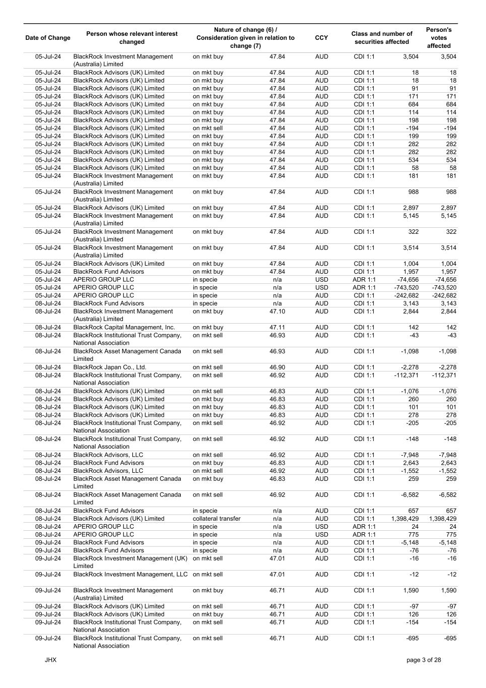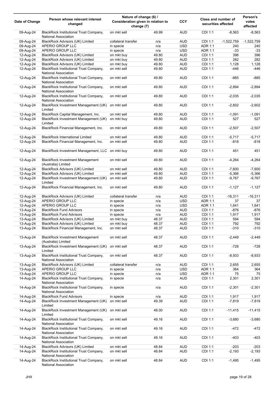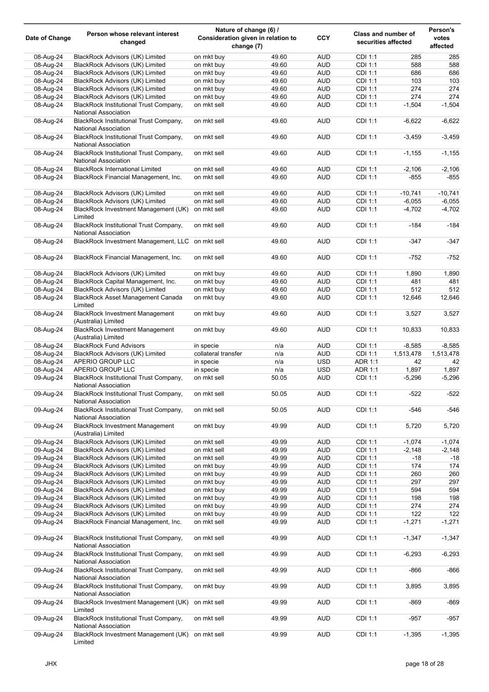 Date of Change Person whose relevant interest changed Nature of change (6) / Consideration given in relation to change (7) Class and number of securities affected Person's votes affected CCY 07-Aug-24 BlackRock Advisors (UK) Limited on mkt buy 50.29 AUD CDI 1:1 294 294 07-Aug-24 BlackRock Advisors (UK) Limited on mkt buy 50.29 AUD CDI 1:1 588 588 07-Aug-24 BlackRock Advisors (UK) Limited on mkt sell 50.29 AUD CDI 1:1 -1,326 -1,326 07-Aug-24 BlackRock Advisors (UK) Limited on mkt buy 50.29 AUD CDI 1:1 126 126 07-Aug-24 BlackRock Advisors (UK) Limited on mkt buy 50.29 AUD CDI 1:1 189 189 07-Aug-24 BlackRock Advisors (UK) Limited on mkt buy 50.29 AUD CDI 1:1 684 684 07-Aug-24 BlackRock Advisors (UK) Limited on mkt buy 50.29 AUD CDI 1:1 912 912 07-Aug-24 BlackRock Advisors (UK) Limited on mkt sell 50.29 AUD CDI 1:1 -684 -684 07-Aug-24 BlackRock Financial Management, Inc. on mkt sell 50.29 AUD CDI 1:1 -1,172 -1,172 07-Aug-24 BlackRock Institutional Trust Company, National Association on mkt sell 50.29 AUD CDI 1:1 -1,257 -1,257 07-Aug-24 BlackRock Institutional Trust Company, National Association on mkt sell 50.29 AUD CDI 1:1 -830 -830 07-Aug-24 BlackRock Institutional Trust Company, National Association on mkt sell 50.29 AUD CDI 1:1 -2,739 -2,739 07-Aug-24 BlackRock Institutional Trust Company, National Association on mkt sell 50.29 AUD CDI 1:1 -2,990 -2,990 07-Aug-24 BlackRock Asset Management Canada Limited on mkt sell 50.29 AUD CDI 1:1 -2,271 -2,271 07-Aug-24 BlackRock Investment Management (UK) Limited on mkt sell 50.29 AUD CDI 1:1 -486 -486 07-Aug-24 BlackRock Investment Management (UK) Limited on mkt sell 50.29 AUD CDI 1:1 -73 -73 07-Aug-24 BlackRock Investment Management (UK) Limited on mkt sell 50.29 AUD CDI 1:1 -33,243 -33,243 07-Aug-24 BlackRock Investment Management (UK) Limited on mkt sell 50.29 AUD CDI 1:1 -1,214 -1,214 07-Aug-24 BlackRock Investment Management (UK) Limited on mkt sell 50.29 AUD CDI 1:1 -925 -925 07-Aug-24 BlackRock Institutional Trust Company, National Association on mkt sell 50.29 AUD CDI 1:1 -10,407 -10,407 07-Aug-24 BlackRock Japan Co., Ltd. on mkt buy 50.29 AUD CDI 1:1 2,065 2,065 07-Aug-24 BlackRock Financial Management, Inc. on mkt sell 50.29 AUD CDI 1:1 -536 -536 07-Aug-24 BlackRock Investment Management (Australia) Limited on mkt buy 50.29 AUD CDI 1:1 308 308 07-Aug-24 BlackRock Investment Management (Australia) Limited on mkt buy 50.29 AUD CDI 1:1 2,183 2,183 07-Aug-24 BlackRock Advisors (UK) Limited on mkt buy 50.29 AUD CDI 1:1 592 592 07-Aug-24 BlackRock Investment Management (Australia) Limited on mkt buy 50.29 AUD CDI 1:1 203 203 07-Aug-24 BlackRock Investment Management (UK) Limited on mkt sell 50.29 AUD CDI 1:1 -34 -34 07-Aug-24 BlackRock Investment Management (UK) Limited on mkt sell 50.29 AUD CDI 1:1 -15,220 -15,220 07-Aug-24 BlackRock Investment Management, LLC on mkt buy 50.29 AUD CDI 1:1 483 483 07-Aug-24 BlackRock Investment Management (UK) Limited on mkt buy 50.29 AUD CDI 1:1 12,444 12,444 07-Aug-24 BlackRock Investment Management (UK) Limited on mkt sell 50.29 AUD CDI 1:1 -423 -423 07-Aug-24 BlackRock Fund Advisors in specie n/a AUD CDI 1:1 1,064 1,064 07-Aug-24 BlackRock Investment Management (UK) Limited on mkt buy 50.29 AUD CDI 1:1 29,002 29,002 07-Aug-24 BlackRock Advisors (UK) Limited collateral transfer n/a AUD CDI 1:1 -1,104,288 -1,104,288 07-Aug-24 APERIO GROUP LLC in specie n/a USD ADR 1:1 701 701 07-Aug-24 APERIO GROUP LLC in specie n/a USD ADR 1:1 1,965 1,965 07-Aug-24 APERIO GROUP LLC in specie n/a AUD CDI 1:1 7,932 7,932 08-Aug-24 BlackRock Fund Advisors in specie n/a AUD CDI 1:1 -315 -315 08-Aug-24 BlackRock Fund Advisors in specie n/a AUD CDI 1:1 -105 -105 08-Aug-24 BlackRock Advisors, LLC on mkt sell 49.59 AUD CDI 1:1 -2,186 -2,186 08-Aug-24 BlackRock Institutional Trust Company, National Association on mkt sell 49.59 AUD CDI 1:1 -221 -221 08-Aug-24 BlackRock Advisors, LLC on mkt sell 49.59 AUD CDI 1:1 -569 -569 08-Aug-24 BlackRock Investment Management, LLC on mkt sell 49.59 AUD CDI 1:1 -377 -377 08-Aug-24 BlackRock (Singapore) Limited on mkt sell 49.59 AUD CDI 1:1 -1,653 -1,653 08-Aug-24 BlackRock Investment Management (Australia) Limited on mkt sell 49.59 AUD CDI 1:1 -48 -48 08-Aug-24 BlackRock Investment Management, LLC on mkt sell 49.59 AUD CDI 1:1 -267 -267 08-Aug-24 BlackRock Financial Management, Inc. on mkt sell 49.04 AUD CDI 1:1 -2,606 -2,606 08-Aug-24 BlackRock Advisors (UK) Limited on mkt buy 49.60 AUD CDI 1:1 114 114 JHX page 17 of 28