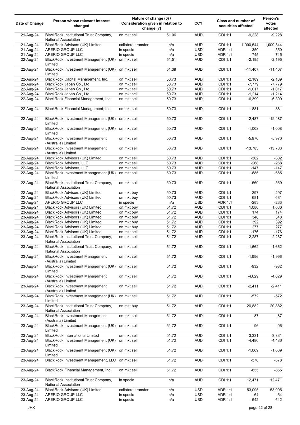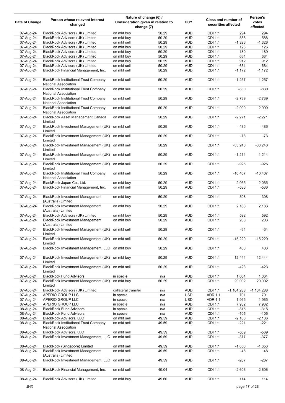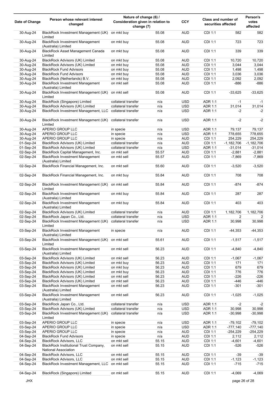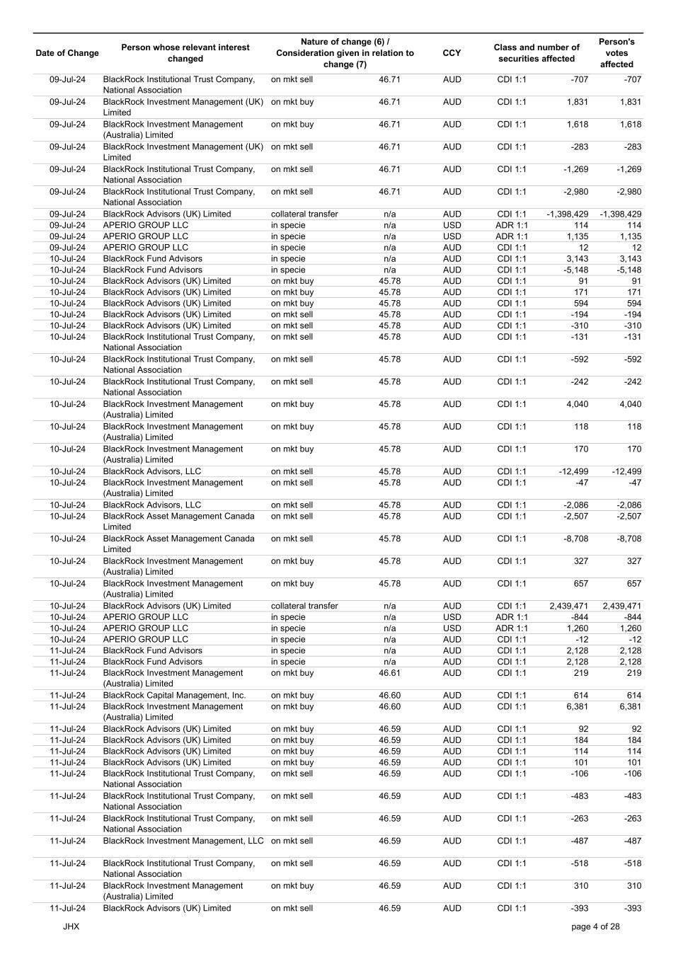 Date of Change Person whose relevant interest changed Nature of change (6) / Consideration given in relation to change (7) Class and number of securities affected Person's votes affected CCY 07-Aug-24 BlackRock Advisors (UK) Limited on mkt buy 50.29 AUD CDI 1:1 294 294 07-Aug-24 BlackRock Advisors (UK) Limited on mkt buy 50.29 AUD CDI 1:1 588 588 07-Aug-24 BlackRock Advisors (UK) Limited on mkt sell 50.29 AUD CDI 1:1 -1,326 -1,326 07-Aug-24 BlackRock Advisors (UK) Limited on mkt buy 50.29 AUD CDI 1:1 126 126 07-Aug-24 BlackRock Advisors (UK) Limited on mkt buy 50.29 AUD CDI 1:1 189 189 07-Aug-24 BlackRock Advisors (UK) Limited on mkt buy 50.29 AUD CDI 1:1 684 684 07-Aug-24 BlackRock Advisors (UK) Limited on mkt buy 50.29 AUD CDI 1:1 912 912 07-Aug-24 BlackRock Advisors (UK) Limited on mkt sell 50.29 AUD CDI 1:1 -684 -684 07-Aug-24 BlackRock Financial Management, Inc. on mkt sell 50.29 AUD CDI 1:1 -1,172 -1,172 07-Aug-24 BlackRock Institutional Trust Company, National Association on mkt sell 50.29 AUD CDI 1:1 -1,257 -1,257 07-Aug-24 BlackRock Institutional Trust Company, National Association on mkt sell 50.29 AUD CDI 1:1 -830 -830 07-Aug-24 BlackRock Institutional Trust Company, National Association on mkt sell 50.29 AUD CDI 1:1 -2,739 -2,739 07-Aug-24 BlackRock Institutional Trust Company, National Association on mkt sell 50.29 AUD CDI 1:1 -2,990 -2,990 07-Aug-24 BlackRock Asset Management Canada Limited on mkt sell 50.29 AUD CDI 1:1 -2,271 -2,271 07-Aug-24 BlackRock Investment Management (UK) Limited on mkt sell 50.29 AUD CDI 1:1 -486 -486 07-Aug-24 BlackRock Investment Management (UK) Limited on mkt sell 50.29 AUD CDI 1:1 -73 -73 07-Aug-24 BlackRock Investment Management (UK) Limited on mkt sell 50.29 AUD CDI 1:1 -33,243 -33,243 07-Aug-24 BlackRock Investment Management (UK) Limited on mkt sell 50.29 AUD CDI 1:1 -1,214 -1,214 07-Aug-24 BlackRock Investment Management (UK) Limited on mkt sell 50.29 AUD CDI 1:1 -925 -925 07-Aug-24 BlackRock Institutional Trust Company, National Association on mkt sell 50.29 AUD CDI 1:1 -10,407 -10,407 07-Aug-24 BlackRock Japan Co., Ltd. on mkt buy 50.29 AUD CDI 1:1 2,065 2,065 07-Aug-24 BlackRock Financial Management, Inc. on mkt sell 50.29 AUD CDI 1:1 -536 -536 07-Aug-24 BlackRock Investment Management (Australia) Limited on mkt buy 50.29 AUD CDI 1:1 308 308 07-Aug-24 BlackRock Investment Management (Australia) Limited on mkt buy 50.29 AUD CDI 1:1 2,183 2,183 07-Aug-24 BlackRock Advisors (UK) Limited on mkt buy 50.29 AUD CDI 1:1 592 592 07-Aug-24 BlackRock Investment Management (Australia) Limited on mkt buy 50.29 AUD CDI 1:1 203 203 07-Aug-24 BlackRock Investment Management (UK) Limited on mkt sell 50.29 AUD CDI 1:1 -34 -34 07-Aug-24 BlackRock Investment Management (UK) Limited on mkt sell 50.29 AUD CDI 1:1 -15,220 -15,220 07-Aug-24 BlackRock Investment Management, LLC on mkt buy 50.29 AUD CDI 1:1 483 483 07-Aug-24 BlackRock Investment Management (UK) Limited on mkt buy 50.29 AUD CDI 1:1 12,444 12,444 07-Aug-24 BlackRock Investment Management (UK) Limited on mkt sell 50.29 AUD CDI 1:1 -423 -423 07-Aug-24 BlackRock Fund Advisors in specie n/a AUD CDI 1:1 1,064 1,064 07-Aug-24 BlackRock Investment Management (UK) Limited on mkt buy 50.29 AUD CDI 1:1 29,002 29,002 07-Aug-24 BlackRock Advisors (UK) Limited collateral transfer n/a AUD CDI 1:1 -1,104,288 -1,104,288 07-Aug-24 APERIO GROUP LLC in specie n/a USD ADR 1:1 701 701 07-Aug-24 APERIO GROUP LLC in specie n/a USD ADR 1:1 1,965 1,965 07-Aug-24 APERIO GROUP LLC in specie n/a AUD CDI 1:1 7,932 7,932 08-Aug-24 BlackRock Fund Advisors in specie n/a AUD CDI 1:1 -315 -315 08-Aug-24 BlackRock Fund Advisors in specie n/a AUD CDI 1:1 -105 -105 08-Aug-24 BlackRock Advisors, LLC on mkt sell 49.59 AUD CDI 1:1 -2,186 -2,186 08-Aug-24 BlackRock Institutional Trust Company, National Association on mkt sell 49.59 AUD CDI 1:1 -221 -221 08-Aug-24 BlackRock Advisors, LLC on mkt sell 49.59 AUD CDI 1:1 -569 -569 08-Aug-24 BlackRock Investment Management, LLC on mkt sell 49.59 AUD CDI 1:1 -377 -377 08-Aug-24 BlackRock (Singapore) Limited on mkt sell 49.59 AUD CDI 1:1 -1,653 -1,653 08-Aug-24 BlackRock Investment Management (Australia) Limited on mkt sell 49.59 AUD CDI 1:1 -48 -48 08-Aug-24 BlackRock Investment Management, LLC on mkt sell 49.59 AUD CDI 1:1 -267 -267 08-Aug-24 BlackRock Financial Management, Inc. on mkt sell 49.04 AUD CDI 1:1 -2,606 -2,606 08-Aug-24 BlackRock Advisors (UK) Limited on mkt buy 49.60 AUD CDI 1:1 114 114 JHX page 17 of 28