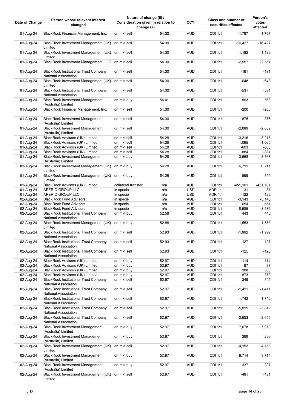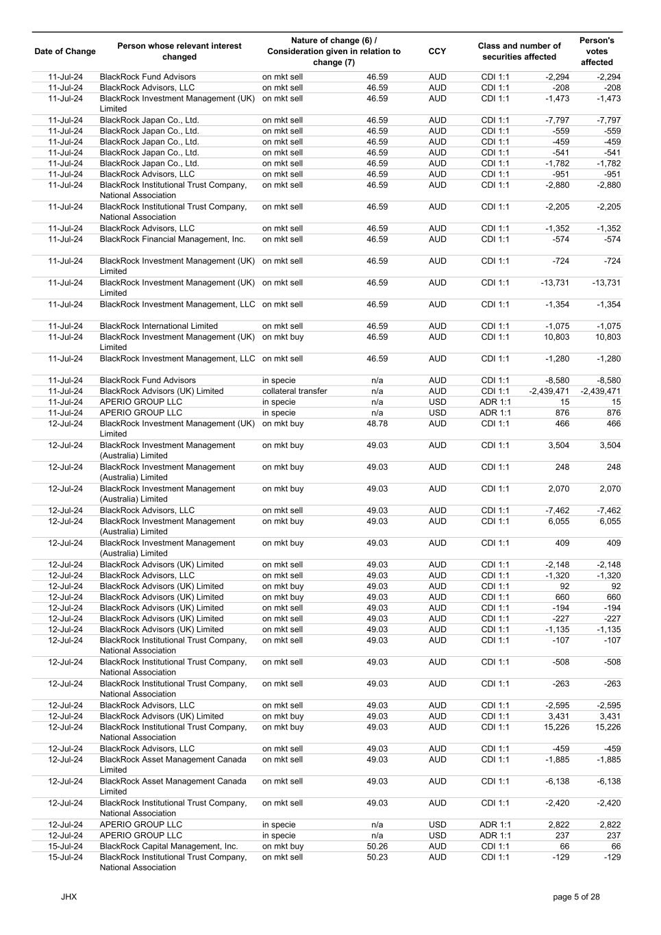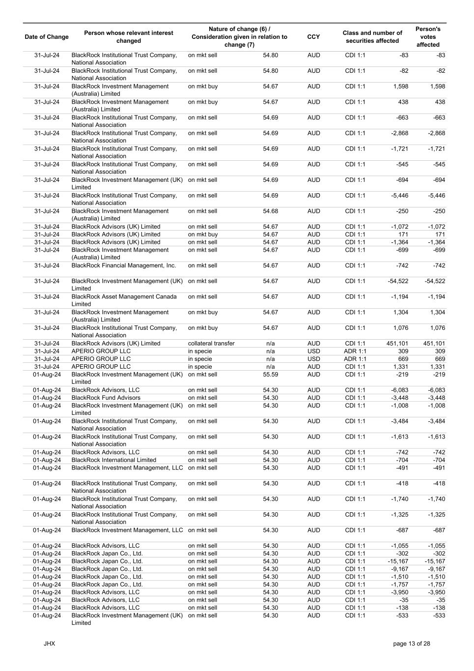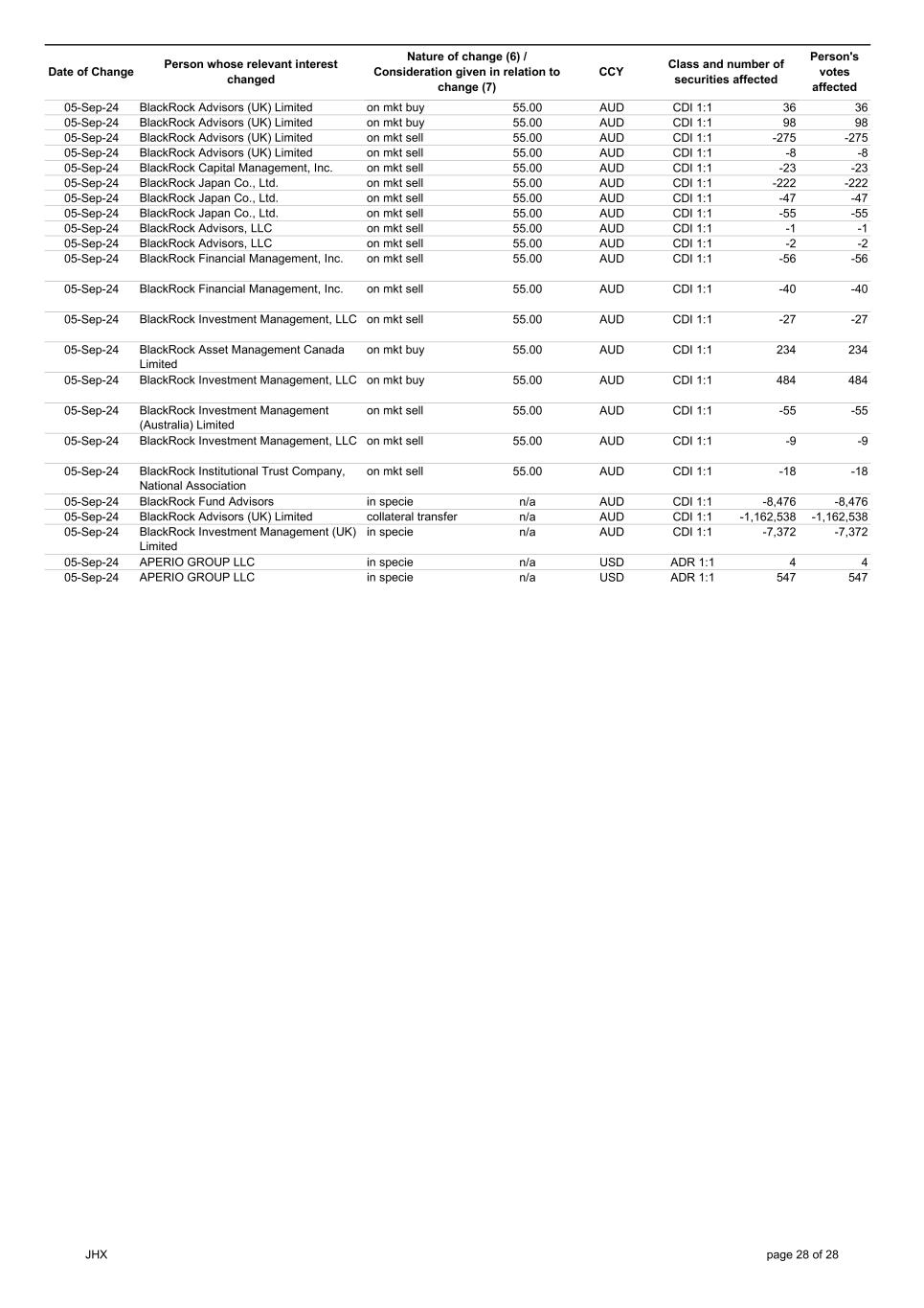 Date of Change Person whose relevant interest changed Nature of change (6) / Consideration given in relation to change (7) Class and number of securities affected Person's votes affected CCY 06-Aug-24 BlackRock Investment Management (Australia) Limited on mkt sell 51.18 AUD CDI 1:1 -49 -49 06-Aug-24 BlackRock Investment Management, LLC on mkt sell 51.18 AUD CDI 1:1 -274 -274 06-Aug-24 BlackRock Institutional Trust Company, National Association on mkt sell 51.37 AUD CDI 1:1 -5,469 -5,469 06-Aug-24 BlackRock Institutional Trust Company, National Association on mkt sell 51.37 AUD CDI 1:1 -1,087 -1,087 06-Aug-24 BlackRock Advisors (UK) Limited on mkt sell 51.37 AUD CDI 1:1 -1,850 -1,850 06-Aug-24 BlackRock Advisors, LLC on mkt sell 51.37 AUD CDI 1:1 -1,175 -1,175 06-Aug-24 BlackRock Japan Co., Ltd. on mkt sell 51.37 AUD CDI 1:1 -17,333 -17,333 06-Aug-24 BlackRock Japan Co., Ltd. on mkt sell 51.37 AUD CDI 1:1 -18,757 -18,757 06-Aug-24 BlackRock Japan Co., Ltd. on mkt sell 51.37 AUD CDI 1:1 -3,931 -3,931 06-Aug-24 BlackRock Japan Co., Ltd. on mkt sell 51.37 AUD CDI 1:1 -4,589 -4,589 06-Aug-24 BlackRock Advisors, LLC on mkt sell 51.37 AUD CDI 1:1 -4,635 -4,635 06-Aug-24 BlackRock Financial Management, Inc. on mkt sell 51.37 AUD CDI 1:1 -1,449 -1,449 06-Aug-24 BlackRock Investment Management (UK) Limited on mkt sell 51.37 AUD CDI 1:1 -27,982 -27,982 06-Aug-24 BlackRock Investment Management (UK) Limited on mkt sell 51.37 AUD CDI 1:1 -2,636 -2,636 06-Aug-24 BlackRock Investment Management, LLC on mkt sell 51.37 AUD CDI 1:1 -1,968 -1,968 06-Aug-24 BlackRock Investment Management (UK) Limited on mkt sell 51.37 AUD CDI 1:1 -1,151 -1,151 06-Aug-24 BlackRock Institutional Trust Company, National Association on mkt sell 51.37 AUD CDI 1:1 -1,222 -1,222 06-Aug-24 BlackRock Institutional Trust Company, National Association on mkt sell 51.37 AUD CDI 1:1 -330 -330 06-Aug-24 BlackRock Institutional Trust Company, National Association on mkt sell 51.37 AUD CDI 1:1 -923 -923 06-Aug-24 BlackRock Advisors, LLC on mkt sell 51.37 AUD CDI 1:1 -51 -51 06-Aug-24 BlackRock Advisors, LLC on mkt sell 51.37 AUD CDI 1:1 -289 -289 06-Aug-24 BlackRock Investment Management (UK) Limited on mkt sell 51.37 AUD CDI 1:1 -118 -118 06-Aug-24 BlackRock Institutional Trust Company, National Association on mkt sell 51.37 AUD CDI 1:1 -334 -334 06-Aug-24 BlackRock Investment Management, LLC on mkt sell 51.37 AUD CDI 1:1 -787 -787 06-Aug-24 BlackRock Institutional Trust Company, National Association on mkt sell 51.37 AUD CDI 1:1 -246 -246 06-Aug-24 BlackRock Investment Management (Australia) Limited on mkt buy 51.45 AUD CDI 1:1 1,598 1,598 06-Aug-24 BlackRock Fund Advisors on mkt sell 51.47 AUD CDI 1:1 -207 -207 06-Aug-24 BlackRock Advisors (UK) Limited on mkt buy 51.45 AUD CDI 1:1 54 54 06-Aug-24 BlackRock Advisors (UK) Limited on mkt buy 51.45 AUD CDI 1:1 306 306 06-Aug-24 BlackRock Advisors (UK) Limited on mkt buy 51.45 AUD CDI 1:1 98 98 06-Aug-24 BlackRock Advisors (UK) Limited on mkt sell 51.45 AUD CDI 1:1 -600 -600 06-Aug-24 BlackRock Advisors (UK) Limited on mkt buy 51.45 AUD CDI 1:1 189 189 06-Aug-24 BlackRock Advisors (UK) Limited on mkt sell 51.45 AUD CDI 1:1 -681 -681 06-Aug-24 BlackRock Investment Management (Australia) Limited on mkt buy 51.45 AUD CDI 1:1 4,150 4,150 06-Aug-24 BlackRock Institutional Trust Company, National Association on mkt buy 51.45 AUD CDI 1:1 3,222 3,222 06-Aug-24 BlackRock Investment Management (Australia) Limited on mkt buy 51.45 AUD CDI 1:1 2,022 2,022 06-Aug-24 APERIO GROUP LLC in specie n/a USD ADR 1:1 388 388 06-Aug-24 APERIO GROUP LLC in specie n/a USD ADR 1:1 3,877 3,877 07-Aug-24 BlackRock Fund Advisors in specie n/a AUD CDI 1:1 -6,868 -6,868 07-Aug-24 BlackRock Fund Advisors in specie n/a AUD CDI 1:1 -438 -438 07-Aug-24 BlackRock Advisors, LLC on mkt sell 50.56 AUD CDI 1:1 -2,178 -2,178 07-Aug-24 BlackRock Institutional Trust Company, National Association on mkt sell 50.56 AUD CDI 1:1 -219 -219 07-Aug-24 BlackRock Advisors, LLC on mkt sell 50.56 AUD CDI 1:1 -25 -25 07-Aug-24 BlackRock Advisors, LLC on mkt sell 50.56 AUD CDI 1:1 -566 -566 07-Aug-24 BlackRock Investment Management, LLC on mkt sell 50.56 AUD CDI 1:1 -375 -375 07-Aug-24 BlackRock (Singapore) Limited on mkt sell 50.56 AUD CDI 1:1 -1,645 -1,645 07-Aug-24 BlackRock Investment Management (Australia) Limited on mkt sell 50.56 AUD CDI 1:1 -47 -47 07-Aug-24 BlackRock Investment Management, LLC on mkt sell 50.56 AUD CDI 1:1 -266 -266 07-Aug-24 BlackRock Advisors (UK) Limited on mkt sell 50.29 AUD CDI 1:1 -396 -396 07-Aug-24 BlackRock Advisors (UK) Limited on mkt sell 50.29 AUD CDI 1:1 -576 -576 07-Aug-24 BlackRock Advisors (UK) Limited on mkt buy 50.29 AUD CDI 1:1 290 290 JHX page 16 of 28
