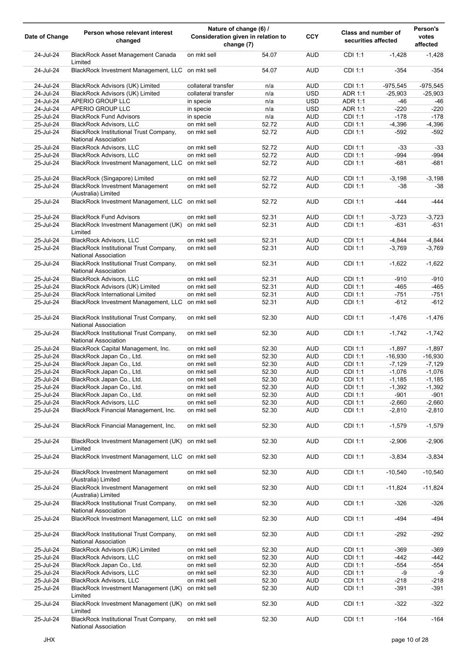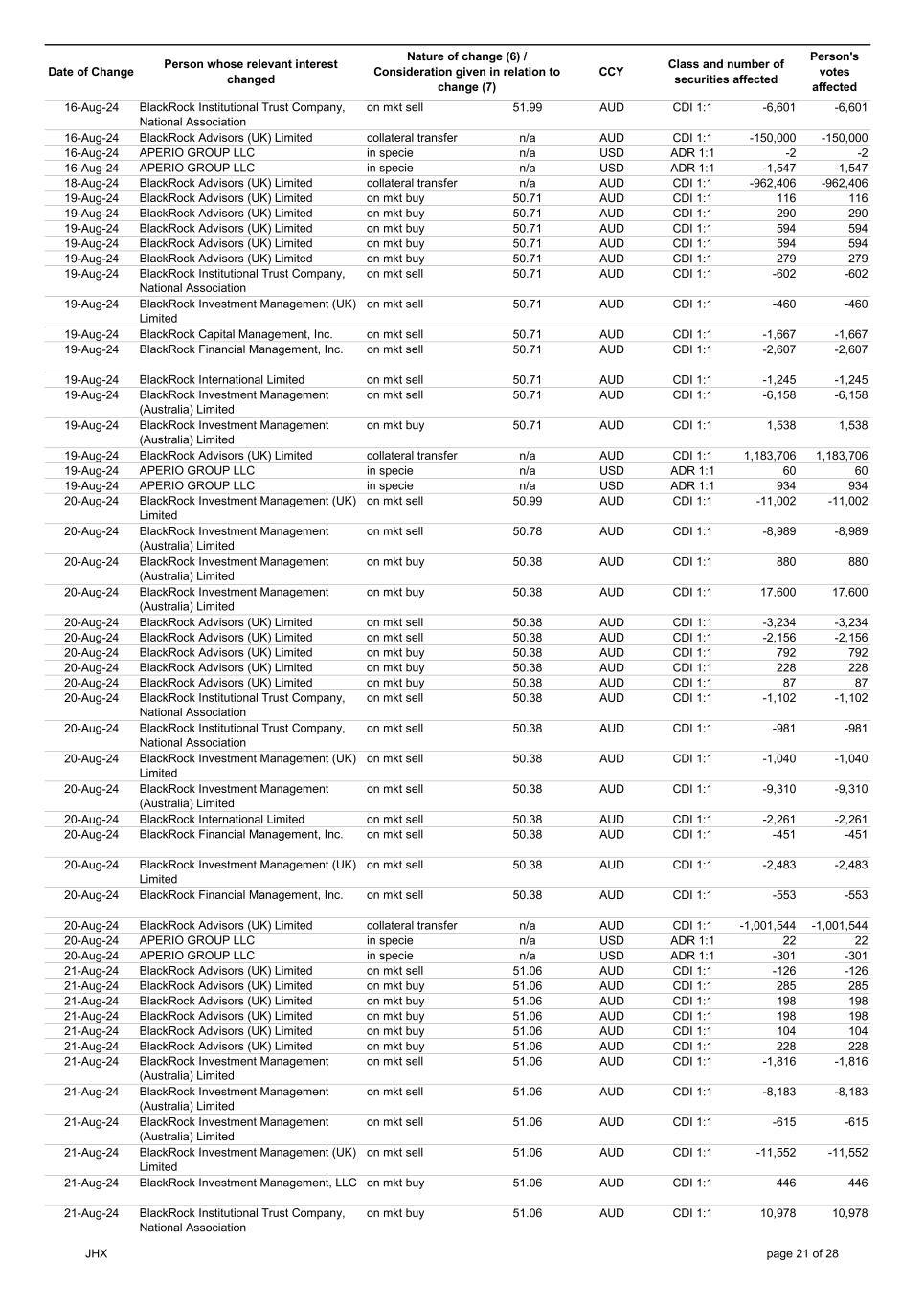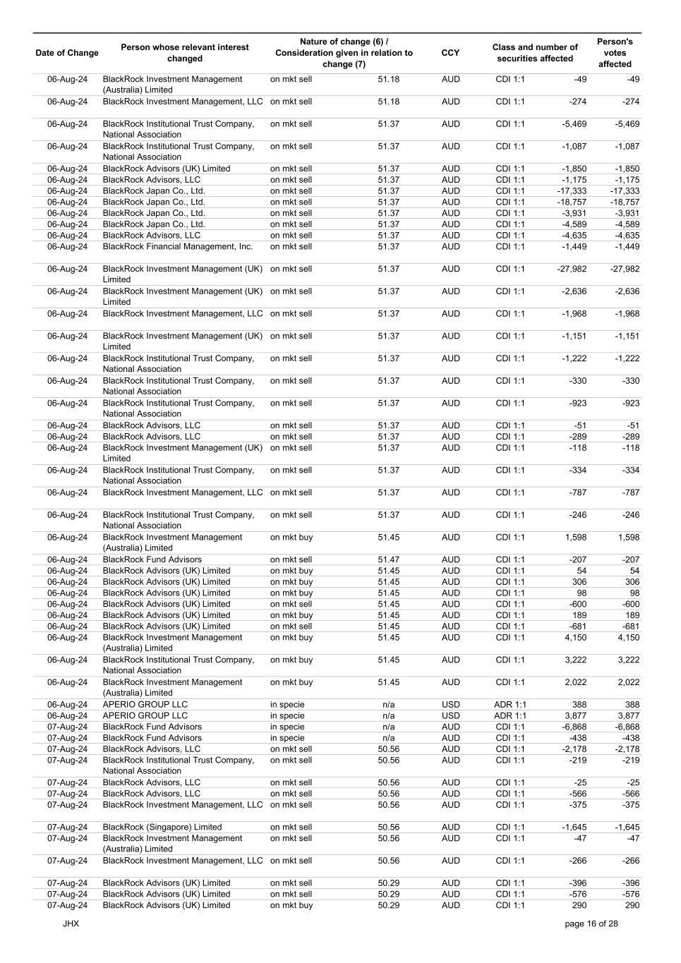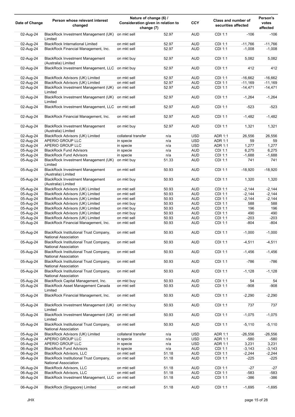 Date of Change Person whose relevant interest changed Nature of change (6) / Consideration given in relation to change (7) Class and number of securities affected Person's votes affected CCY 06-Aug-24 BlackRock Investment Management (Australia) Limited on mkt sell 51.18 AUD CDI 1:1 -49 -49 06-Aug-24 BlackRock Investment Management, LLC on mkt sell 51.18 AUD CDI 1:1 -274 -274 06-Aug-24 BlackRock Institutional Trust Company, National Association on mkt sell 51.37 AUD CDI 1:1 -5,469 -5,469 06-Aug-24 BlackRock Institutional Trust Company, National Association on mkt sell 51.37 AUD CDI 1:1 -1,087 -1,087 06-Aug-24 BlackRock Advisors (UK) Limited on mkt sell 51.37 AUD CDI 1:1 -1,850 -1,850 06-Aug-24 BlackRock Advisors, LLC on mkt sell 51.37 AUD CDI 1:1 -1,175 -1,175 06-Aug-24 BlackRock Japan Co., Ltd. on mkt sell 51.37 AUD CDI 1:1 -17,333 -17,333 06-Aug-24 BlackRock Japan Co., Ltd. on mkt sell 51.37 AUD CDI 1:1 -18,757 -18,757 06-Aug-24 BlackRock Japan Co., Ltd. on mkt sell 51.37 AUD CDI 1:1 -3,931 -3,931 06-Aug-24 BlackRock Japan Co., Ltd. on mkt sell 51.37 AUD CDI 1:1 -4,589 -4,589 06-Aug-24 BlackRock Advisors, LLC on mkt sell 51.37 AUD CDI 1:1 -4,635 -4,635 06-Aug-24 BlackRock Financial Management, Inc. on mkt sell 51.37 AUD CDI 1:1 -1,449 -1,449 06-Aug-24 BlackRock Investment Management (UK) Limited on mkt sell 51.37 AUD CDI 1:1 -27,982 -27,982 06-Aug-24 BlackRock Investment Management (UK) Limited on mkt sell 51.37 AUD CDI 1:1 -2,636 -2,636 06-Aug-24 BlackRock Investment Management, LLC on mkt sell 51.37 AUD CDI 1:1 -1,968 -1,968 06-Aug-24 BlackRock Investment Management (UK) Limited on mkt sell 51.37 AUD CDI 1:1 -1,151 -1,151 06-Aug-24 BlackRock Institutional Trust Company, National Association on mkt sell 51.37 AUD CDI 1:1 -1,222 -1,222 06-Aug-24 BlackRock Institutional Trust Company, National Association on mkt sell 51.37 AUD CDI 1:1 -330 -330 06-Aug-24 BlackRock Institutional Trust Company, National Association on mkt sell 51.37 AUD CDI 1:1 -923 -923 06-Aug-24 BlackRock Advisors, LLC on mkt sell 51.37 AUD CDI 1:1 -51 -51 06-Aug-24 BlackRock Advisors, LLC on mkt sell 51.37 AUD CDI 1:1 -289 -289 06-Aug-24 BlackRock Investment Management (UK) Limited on mkt sell 51.37 AUD CDI 1:1 -118 -118 06-Aug-24 BlackRock Institutional Trust Company, National Association on mkt sell 51.37 AUD CDI 1:1 -334 -334 06-Aug-24 BlackRock Investment Management, LLC on mkt sell 51.37 AUD CDI 1:1 -787 -787 06-Aug-24 BlackRock Institutional Trust Company, National Association on mkt sell 51.37 AUD CDI 1:1 -246 -246 06-Aug-24 BlackRock Investment Management (Australia) Limited on mkt buy 51.45 AUD CDI 1:1 1,598 1,598 06-Aug-24 BlackRock Fund Advisors on mkt sell 51.47 AUD CDI 1:1 -207 -207 06-Aug-24 BlackRock Advisors (UK) Limited on mkt buy 51.45 AUD CDI 1:1 54 54 06-Aug-24 BlackRock Advisors (UK) Limited on mkt buy 51.45 AUD CDI 1:1 306 306 06-Aug-24 BlackRock Advisors (UK) Limited on mkt buy 51.45 AUD CDI 1:1 98 98 06-Aug-24 BlackRock Advisors (UK) Limited on mkt sell 51.45 AUD CDI 1:1 -600 -600 06-Aug-24 BlackRock Advisors (UK) Limited on mkt buy 51.45 AUD CDI 1:1 189 189 06-Aug-24 BlackRock Advisors (UK) Limited on mkt sell 51.45 AUD CDI 1:1 -681 -681 06-Aug-24 BlackRock Investment Management (Australia) Limited on mkt buy 51.45 AUD CDI 1:1 4,150 4,150 06-Aug-24 BlackRock Institutional Trust Company, National Association on mkt buy 51.45 AUD CDI 1:1 3,222 3,222 06-Aug-24 BlackRock Investment Management (Australia) Limited on mkt buy 51.45 AUD CDI 1:1 2,022 2,022 06-Aug-24 APERIO GROUP LLC in specie n/a USD ADR 1:1 388 388 06-Aug-24 APERIO GROUP LLC in specie n/a USD ADR 1:1 3,877 3,877 07-Aug-24 BlackRock Fund Advisors in specie n/a AUD CDI 1:1 -6,868 -6,868 07-Aug-24 BlackRock Fund Advisors in specie n/a AUD CDI 1:1 -438 -438 07-Aug-24 BlackRock Advisors, LLC on mkt sell 50.56 AUD CDI 1:1 -2,178 -2,178 07-Aug-24 BlackRock Institutional Trust Company, National Association on mkt sell 50.56 AUD CDI 1:1 -219 -219 07-Aug-24 BlackRock Advisors, LLC on mkt sell 50.56 AUD CDI 1:1 -25 -25 07-Aug-24 BlackRock Advisors, LLC on mkt sell 50.56 AUD CDI 1:1 -566 -566 07-Aug-24 BlackRock Investment Management, LLC on mkt sell 50.56 AUD CDI 1:1 -375 -375 07-Aug-24 BlackRock (Singapore) Limited on mkt sell 50.56 AUD CDI 1:1 -1,645 -1,645 07-Aug-24 BlackRock Investment Management (Australia) Limited on mkt sell 50.56 AUD CDI 1:1 -47 -47 07-Aug-24 BlackRock Investment Management, LLC on mkt sell 50.56 AUD CDI 1:1 -266 -266 07-Aug-24 BlackRock Advisors (UK) Limited on mkt sell 50.29 AUD CDI 1:1 -396 -396 07-Aug-24 BlackRock Advisors (UK) Limited on mkt sell 50.29 AUD CDI 1:1 -576 -576 07-Aug-24 BlackRock Advisors (UK) Limited on mkt buy 50.29 AUD CDI 1:1 290 290 JHX page 16 of 28