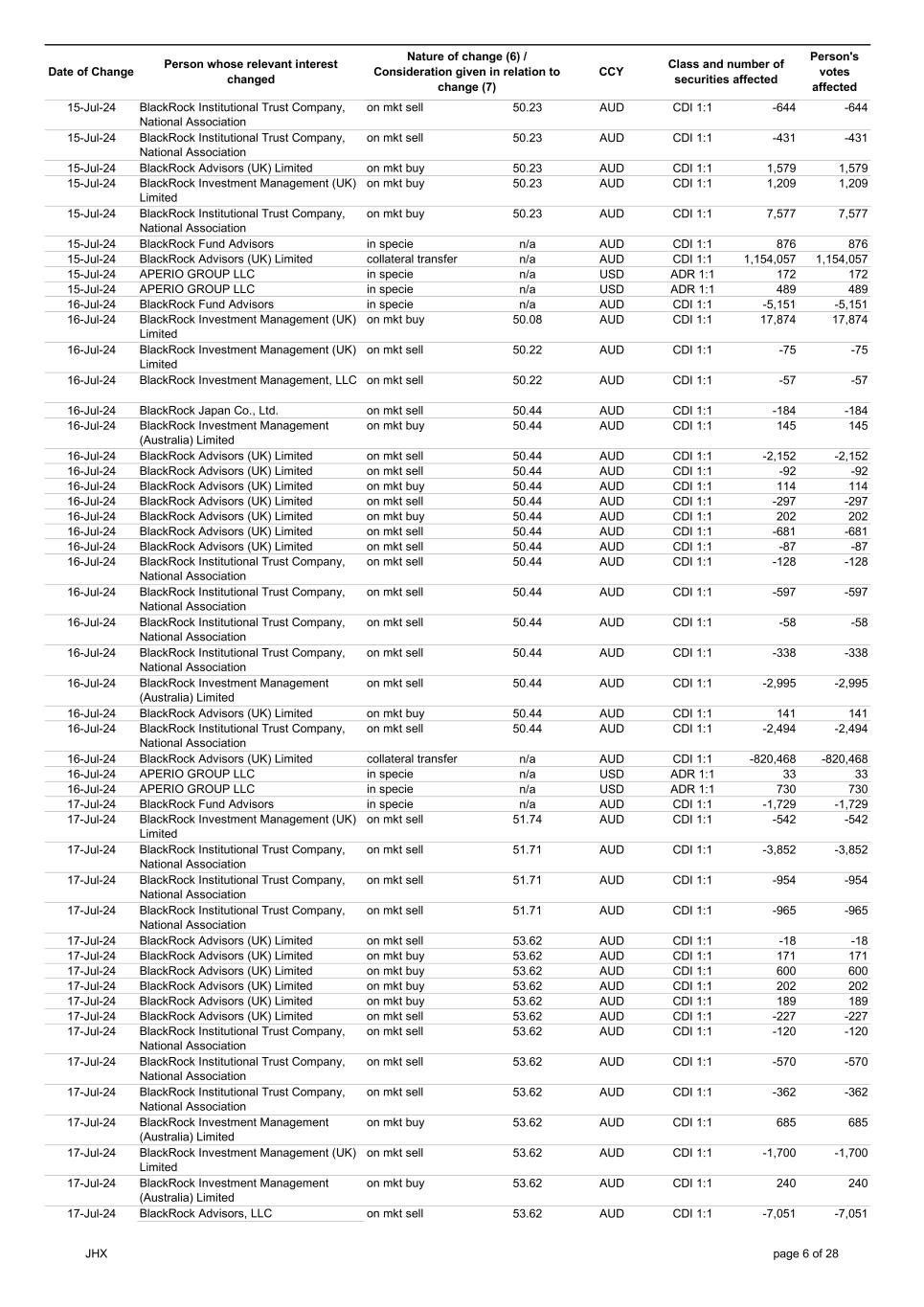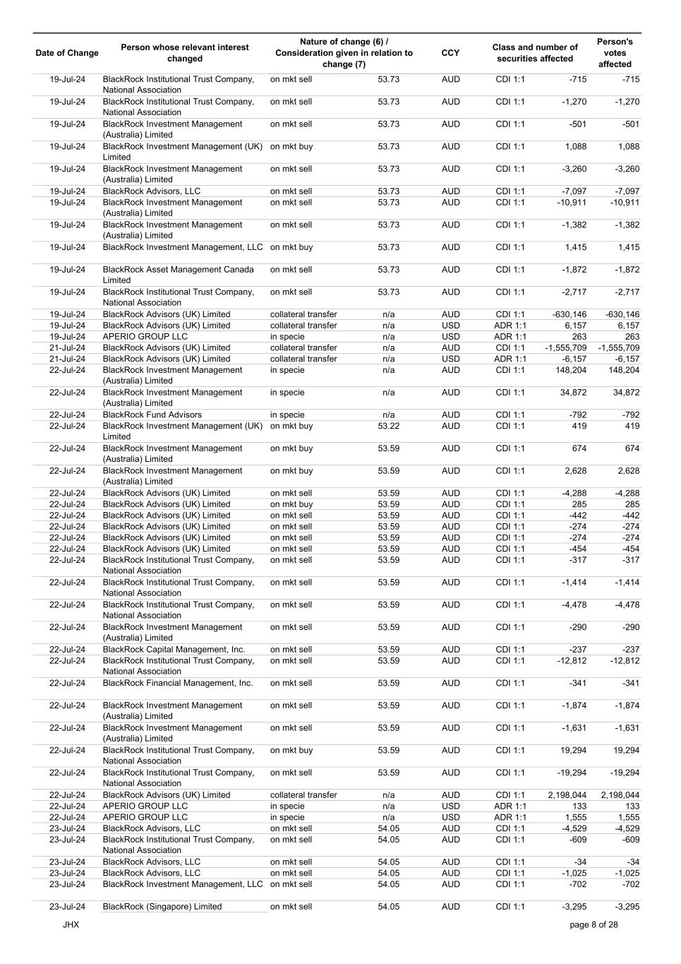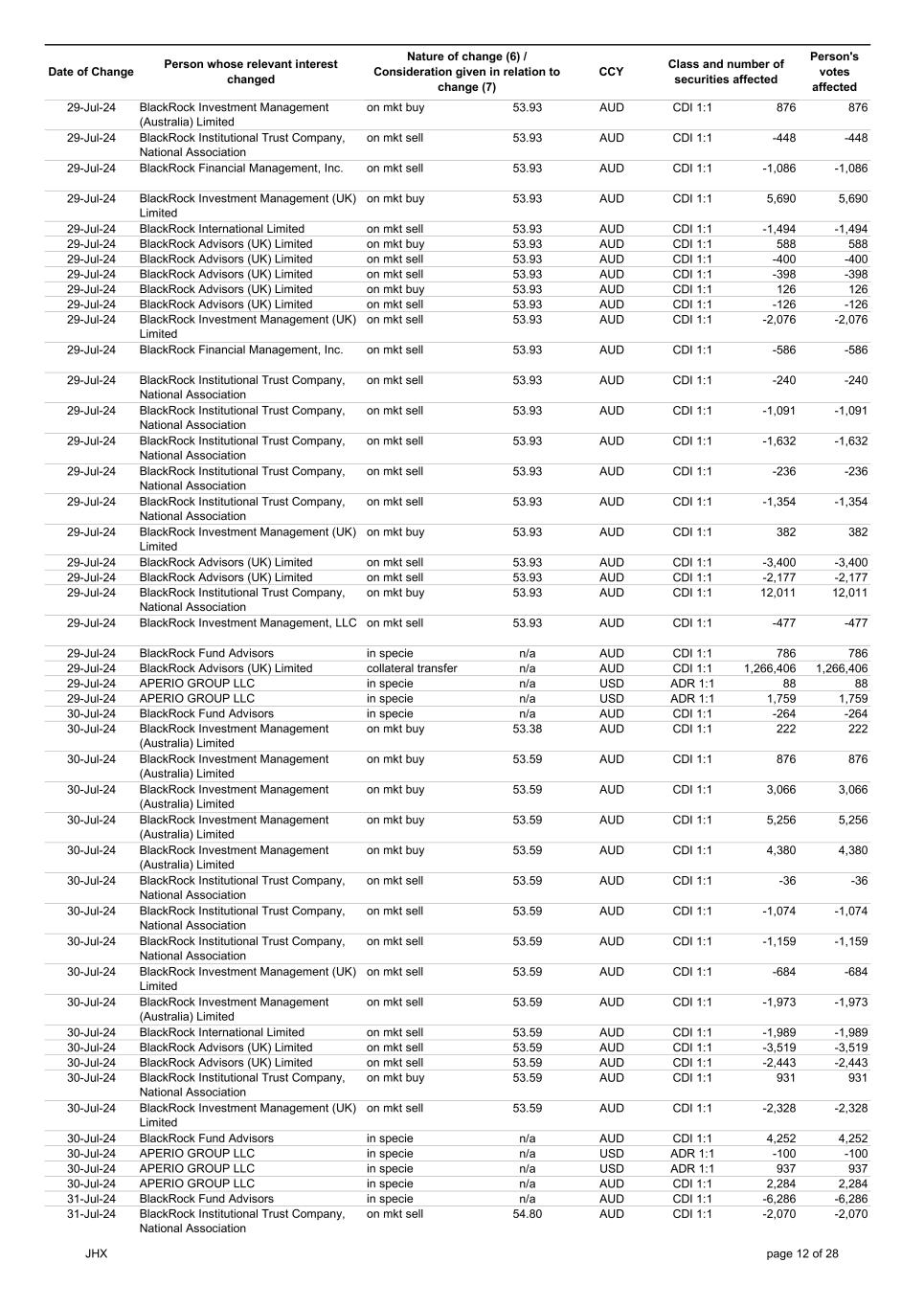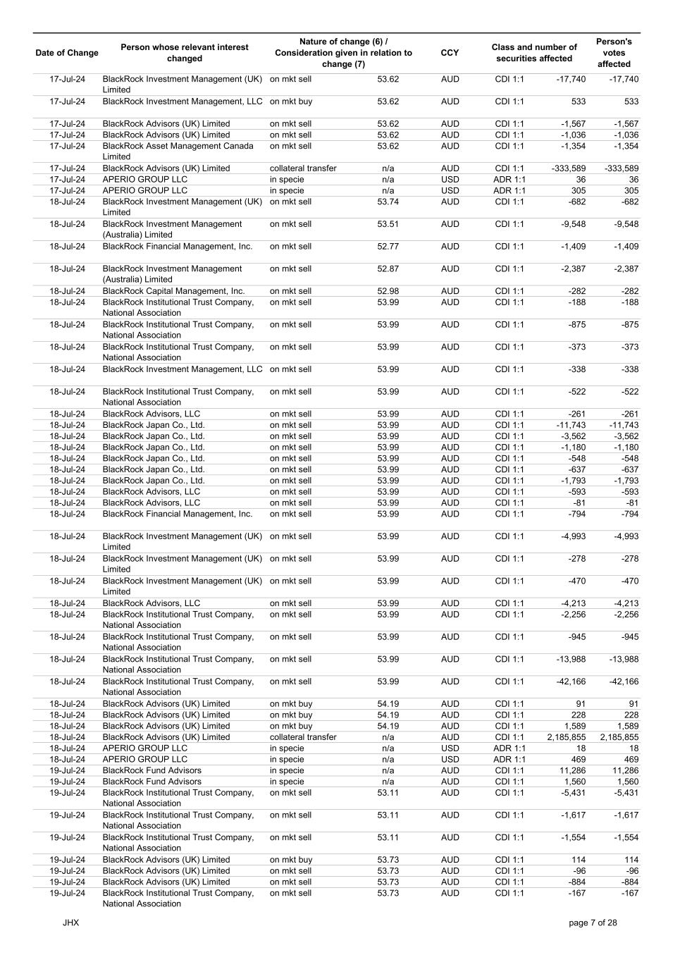 Date of Change Person whose relevant interest changed Nature of change (6) / Consideration given in relation to change (7) Class and number of securities affected Person's votes affected CCY 17-Jul-24 BlackRock Investment Management (UK) Limited on mkt sell 53.62 AUD CDI 1:1 -17,740 -17,740 17-Jul-24 BlackRock Investment Management, LLC on mkt buy 53.62 AUD CDI 1:1 533 533 17-Jul-24 BlackRock Advisors (UK) Limited on mkt sell 53.62 AUD CDI 1:1 -1,567 -1,567 17-Jul-24 BlackRock Advisors (UK) Limited on mkt sell 53.62 AUD CDI 1:1 -1,036 -1,036 17-Jul-24 BlackRock Asset Management Canada Limited on mkt sell 53.62 AUD CDI 1:1 -1,354 -1,354 17-Jul-24 BlackRock Advisors (UK) Limited collateral transfer n/a AUD CDI 1:1 -333,589 -333,589 17-Jul-24 APERIO GROUP LLC in specie n/a USD ADR 1:1 36 36 17-Jul-24 APERIO GROUP LLC in specie n/a USD ADR 1:1 305 305 18-Jul-24 BlackRock Investment Management (UK) Limited on mkt sell 53.74 AUD CDI 1:1 -682 -682 18-Jul-24 BlackRock Investment Management (Australia) Limited on mkt sell 53.51 AUD CDI 1:1 -9,548 -9,548 18-Jul-24 BlackRock Financial Management, Inc. on mkt sell 52.77 AUD CDI 1:1 -1,409 -1,409 18-Jul-24 BlackRock Investment Management (Australia) Limited on mkt sell 52.87 AUD CDI 1:1 -2,387 -2,387 18-Jul-24 BlackRock Capital Management, Inc. on mkt sell 52.98 AUD CDI 1:1 -282 -282 18-Jul-24 BlackRock Institutional Trust Company, National Association on mkt sell 53.99 AUD CDI 1:1 -188 -188 18-Jul-24 BlackRock Institutional Trust Company, National Association on mkt sell 53.99 AUD CDI 1:1 -875 -875 18-Jul-24 BlackRock Institutional Trust Company, National Association on mkt sell 53.99 AUD CDI 1:1 -373 -373 18-Jul-24 BlackRock Investment Management, LLC on mkt sell 53.99 AUD CDI 1:1 -338 -338 18-Jul-24 BlackRock Institutional Trust Company, National Association on mkt sell 53.99 AUD CDI 1:1 -522 -522 18-Jul-24 BlackRock Advisors, LLC on mkt sell 53.99 AUD CDI 1:1 -261 -261 18-Jul-24 BlackRock Japan Co., Ltd. on mkt sell 53.99 AUD CDI 1:1 -11,743 -11,743 18-Jul-24 BlackRock Japan Co., Ltd. on mkt sell 53.99 AUD CDI 1:1 -3,562 -3,562 18-Jul-24 BlackRock Japan Co., Ltd. on mkt sell 53.99 AUD CDI 1:1 -1,180 -1,180 18-Jul-24 BlackRock Japan Co., Ltd. on mkt sell 53.99 AUD CDI 1:1 -548 -548 18-Jul-24 BlackRock Japan Co., Ltd. on mkt sell 53.99 AUD CDI 1:1 -637 -637 18-Jul-24 BlackRock Japan Co., Ltd. on mkt sell 53.99 AUD CDI 1:1 -1,793 -1,793 18-Jul-24 BlackRock Advisors, LLC on mkt sell 53.99 AUD CDI 1:1 -593 -593 18-Jul-24 BlackRock Advisors, LLC on mkt sell 53.99 AUD CDI 1:1 -81 -81 18-Jul-24 BlackRock Financial Management, Inc. on mkt sell 53.99 AUD CDI 1:1 -794 -794 18-Jul-24 BlackRock Investment Management (UK) Limited on mkt sell 53.99 AUD CDI 1:1 -4,993 -4,993 18-Jul-24 BlackRock Investment Management (UK) Limited on mkt sell 53.99 AUD CDI 1:1 -278 -278 18-Jul-24 BlackRock Investment Management (UK) Limited on mkt sell 53.99 AUD CDI 1:1 -470 -470 18-Jul-24 BlackRock Advisors, LLC on mkt sell 53.99 AUD CDI 1:1 -4,213 -4,213 18-Jul-24 BlackRock Institutional Trust Company, National Association on mkt sell 53.99 AUD CDI 1:1 -2,256 -2,256 18-Jul-24 BlackRock Institutional Trust Company, National Association on mkt sell 53.99 AUD CDI 1:1 -945 -945 18-Jul-24 BlackRock Institutional Trust Company, National Association on mkt sell 53.99 AUD CDI 1:1 -13,988 -13,988 18-Jul-24 BlackRock Institutional Trust Company, National Association on mkt sell 53.99 AUD CDI 1:1 -42,166 -42,166 18-Jul-24 BlackRock Advisors (UK) Limited on mkt buy 54.19 AUD CDI 1:1 91 91 18-Jul-24 BlackRock Advisors (UK) Limited on mkt buy 54.19 AUD CDI 1:1 228 228 18-Jul-24 BlackRock Advisors (UK) Limited on mkt buy 54.19 AUD CDI 1:1 1,589 1,589 18-Jul-24 BlackRock Advisors (UK) Limited collateral transfer n/a AUD CDI 1:1 2,185,855 2,185,855 18-Jul-24 APERIO GROUP LLC in specie n/a USD ADR 1:1 18 18 18-Jul-24 APERIO GROUP LLC in specie n/a USD ADR 1:1 469 469 19-Jul-24 BlackRock Fund Advisors in specie n/a AUD CDI 1:1 11,286 11,286 19-Jul-24 BlackRock Fund Advisors in specie n/a AUD CDI 1:1 1,560 1,560 19-Jul-24 BlackRock Institutional Trust Company, National Association on mkt sell 53.11 AUD CDI 1:1 -5,431 -5,431 19-Jul-24 BlackRock Institutional Trust Company, National Association on mkt sell 53.11 AUD CDI 1:1 -1,617 -1,617 19-Jul-24 BlackRock Institutional Trust Company, National Association on mkt sell 53.11 AUD CDI 1:1 -1,554 -1,554 19-Jul-24 BlackRock Advisors (UK) Limited on mkt buy 53.73 AUD CDI 1:1 114 114 19-Jul-24 BlackRock Advisors (UK) Limited on mkt sell 53.73 AUD CDI 1:1 -96 -96 19-Jul-24 BlackRock Advisors (UK) Limited on mkt sell 53.73 AUD CDI 1:1 -884 -884 19-Jul-24 BlackRock Institutional Trust Company, National Association on mkt sell 53.73 AUD CDI 1:1 -167 -167 JHX page 7 of 28