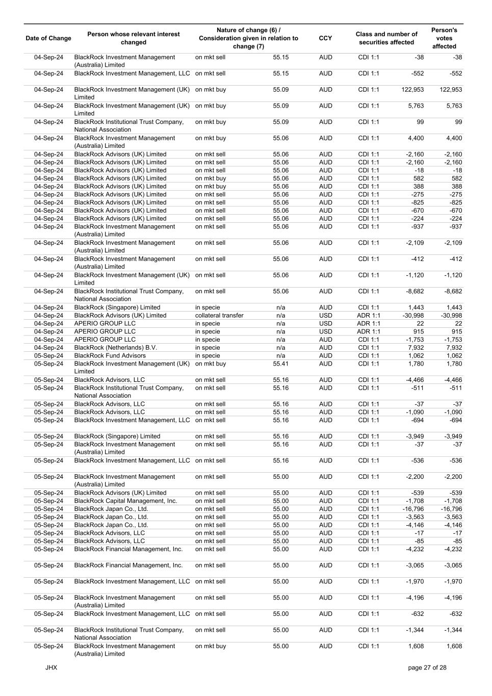 Date of Change Person whose relevant interest changed Nature of change (6) / Consideration given in relation to change (7) Class and number of securities affected Person's votes affected CCY 05-Sep-24 BlackRock Advisors (UK) Limited on mkt buy 55.00 AUD CDI 1:1 36 36 05-Sep-24 BlackRock Advisors (UK) Limited on mkt buy 55.00 AUD CDI 1:1 98 98 05-Sep-24 BlackRock Advisors (UK) Limited on mkt sell 55.00 AUD CDI 1:1 -275 -275 05-Sep-24 BlackRock Advisors (UK) Limited on mkt sell 55.00 AUD CDI 1:1 -8 -8 05-Sep-24 BlackRock Capital Management, Inc. on mkt sell 55.00 AUD CDI 1:1 -23 -23 05-Sep-24 BlackRock Japan Co., Ltd. on mkt sell 55.00 AUD CDI 1:1 -222 -222 05-Sep-24 BlackRock Japan Co., Ltd. on mkt sell 55.00 AUD CDI 1:1 -47 -47 05-Sep-24 BlackRock Japan Co., Ltd. on mkt sell 55.00 AUD CDI 1:1 -55 -55 05-Sep-24 BlackRock Advisors, LLC on mkt sell 55.00 AUD CDI 1:1 -1 -1 05-Sep-24 BlackRock Advisors, LLC on mkt sell 55.00 AUD CDI 1:1 -2 -2 05-Sep-24 BlackRock Financial Management, Inc. on mkt sell 55.00 AUD CDI 1:1 -56 -56 05-Sep-24 BlackRock Financial Management, Inc. on mkt sell 55.00 AUD CDI 1:1 -40 -40 05-Sep-24 BlackRock Investment Management, LLC on mkt sell 55.00 AUD CDI 1:1 -27 -27 05-Sep-24 BlackRock Asset Management Canada Limited on mkt buy 55.00 AUD CDI 1:1 234 234 05-Sep-24 BlackRock Investment Management, LLC on mkt buy 55.00 AUD CDI 1:1 484 484 05-Sep-24 BlackRock Investment Management (Australia) Limited on mkt sell 55.00 AUD CDI 1:1 -55 -55 05-Sep-24 BlackRock Investment Management, LLC on mkt sell 55.00 AUD CDI 1:1 -9 -9 05-Sep-24 BlackRock Institutional Trust Company, National Association on mkt sell 55.00 AUD CDI 1:1 -18 -18 05-Sep-24 BlackRock Fund Advisors in specie n/a AUD CDI 1:1 -8,476 -8,476 05-Sep-24 BlackRock Advisors (UK) Limited collateral transfer n/a AUD CDI 1:1 -1,162,538 -1,162,538 05-Sep-24 BlackRock Investment Management (UK) Limited in specie n/a AUD CDI 1:1 -7,372 -7,372 05-Sep-24 APERIO GROUP LLC in specie n/a USD ADR 1:1 4 4 05-Sep-24 APERIO GROUP LLC in specie n/a USD ADR 1:1 547 547 JHX page 28 of 28