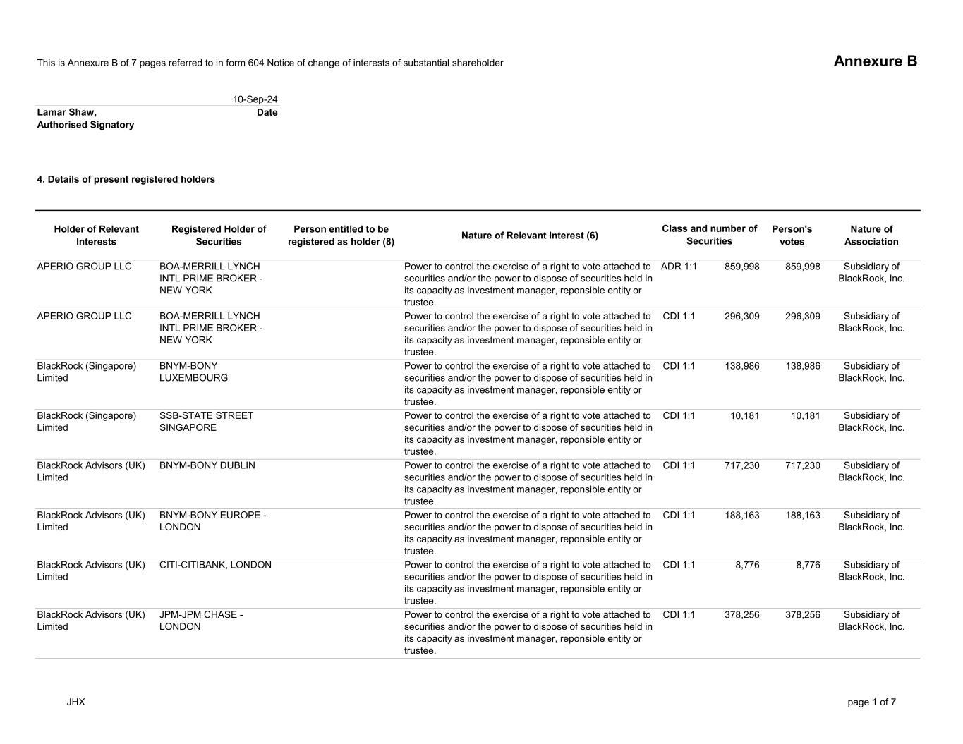This is Annexure B of 7 pages referred to in form 604 Notice of change of interests of substantial shareholder Annexure B 10-Sep-24 Lamar Shaw, Authorised Signatory Date 4. Details of present registered holders Holder of Relevant Interests Registered Holder of Securities Person entitled to be registered as holder (8) Nature of Relevant Interest (6) Person's votes Nature of Association APERIO GROUP LLC BOA-MERRILL LYNCH INTL PRIME BROKER - NEW YORK Power to control the exercise of a right to vote attached to securities and/or the power to dispose of securities held in its capacity as investment manager, reponsible entity or trustee. ADR 1:1 859,998 859,998 Subsidiary of BlackRock, Inc. APERIO GROUP LLC BOA-MERRILL LYNCH INTL PRIME BROKER - NEW YORK Power to control the exercise of a right to vote attached to securities and/or the power to dispose of securities held in its capacity as investment manager, reponsible entity or trustee. CDI 1:1 296,309 296,309 Subsidiary of BlackRock, Inc. BlackRock (Singapore) Limited BNYM-BONY LUXEMBOURG Power to control the exercise of a right to vote attached to securities and/or the power to dispose of securities held in its capacity as investment manager, reponsible entity or trustee. CDI 1:1 138,986 138,986 Subsidiary of BlackRock, Inc. BlackRock (Singapore) Limited SSB-STATE STREET SINGAPORE Power to control the exercise of a right to vote attached to securities and/or the power to dispose of securities held in its capacity as investment manager, reponsible entity or trustee. CDI 1:1 10,181 10,181 Subsidiary of BlackRock, Inc. BlackRock Advisors (UK) Limited BNYM-BONY DUBLIN Power to control the exercise of a right to vote attached to securities and/or the power to dispose of securities held in its capacity as investment manager, reponsible entity or trustee. CDI 1:1 717,230 717,230 Subsidiary of BlackRock, Inc. BlackRock Advisors (UK) Limited BNYM-BONY EUROPE - LONDON Power to control the exercise of a right to vote attached to securities and/or the power to dispose of securities held in its capacity as investment manager, reponsible entity or trustee. CDI 1:1 188,163 188,163 Subsidiary of BlackRock, Inc. BlackRock Advisors (UK) Limited CITI-CITIBANK, LONDON Power to control the exercise of a right to vote attached to securities and/or the power to dispose of securities held in its capacity as investment manager, reponsible entity or trustee. CDI 1:1 8,776 8,776 Subsidiary of BlackRock, Inc. BlackRock Advisors (UK) Limited JPM-JPM CHASE - LONDON Power to control the exercise of a right to vote attached to securities and/or the power to dispose of securities held in its capacity as investment manager, reponsible entity or trustee. CDI 1:1 378,256 378,256 Subsidiary of BlackRock, Inc. Class and number of Securities JHX page 1 of 7