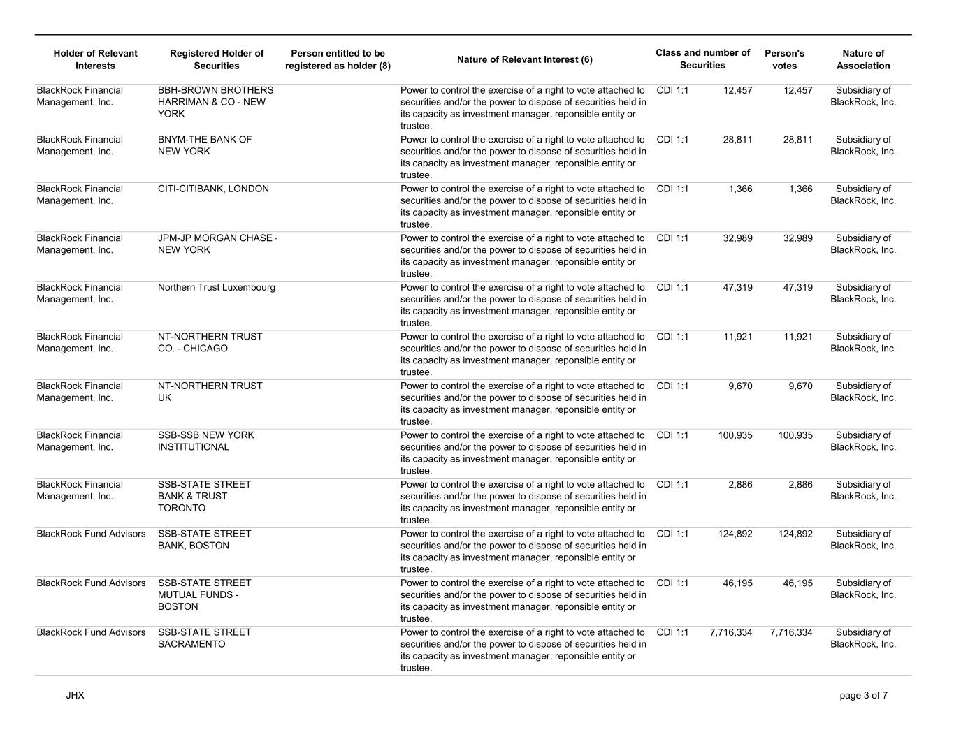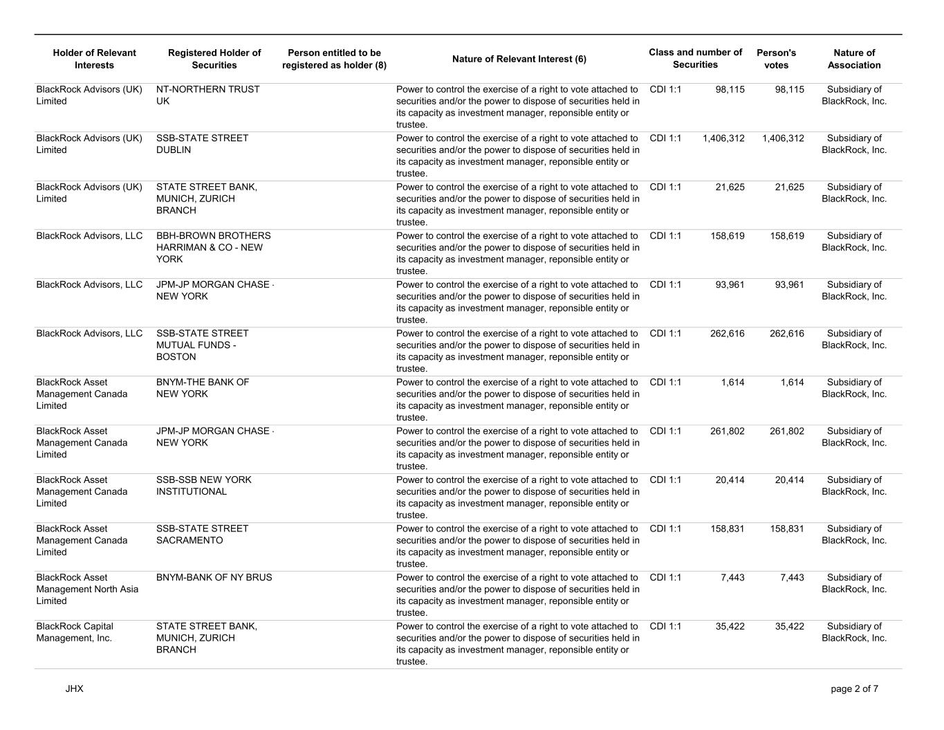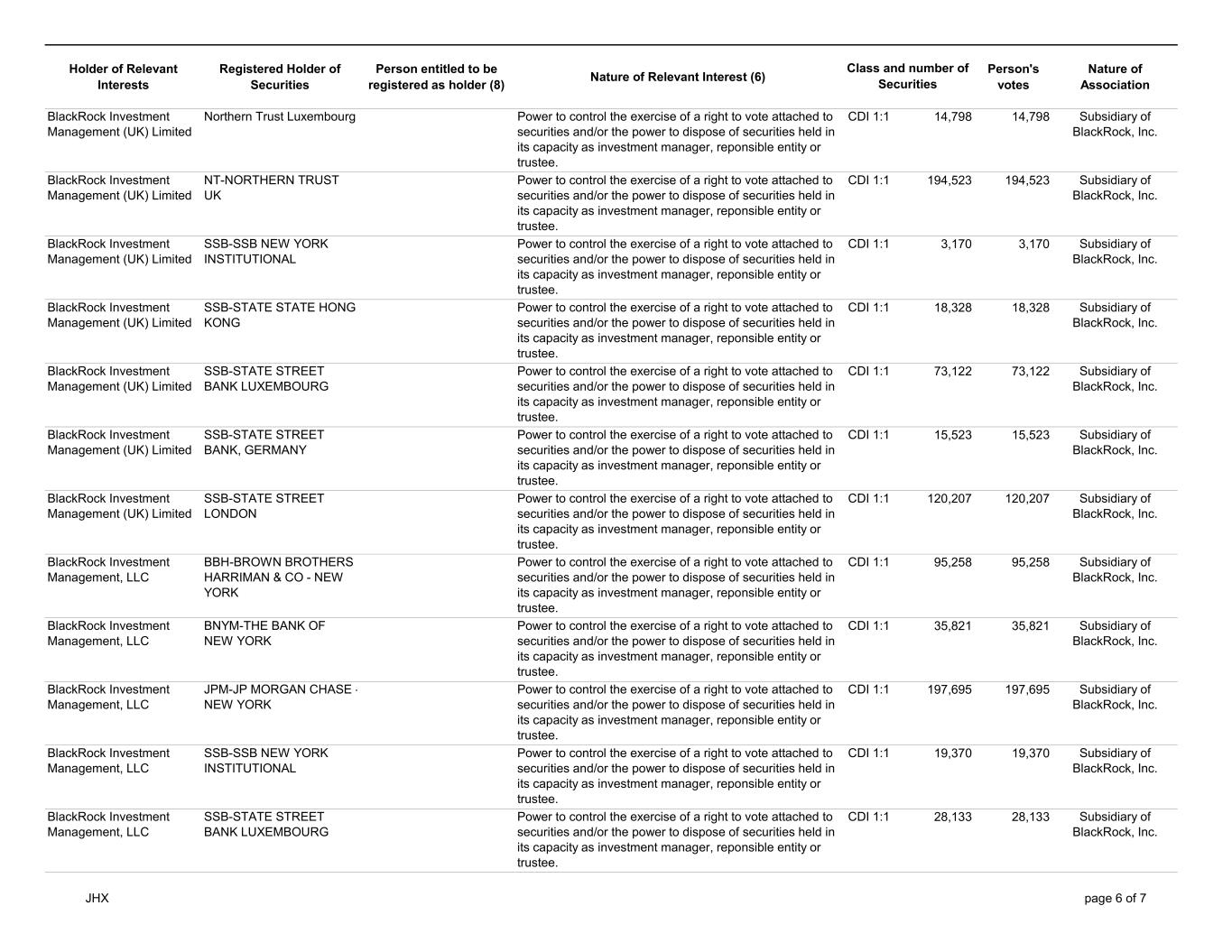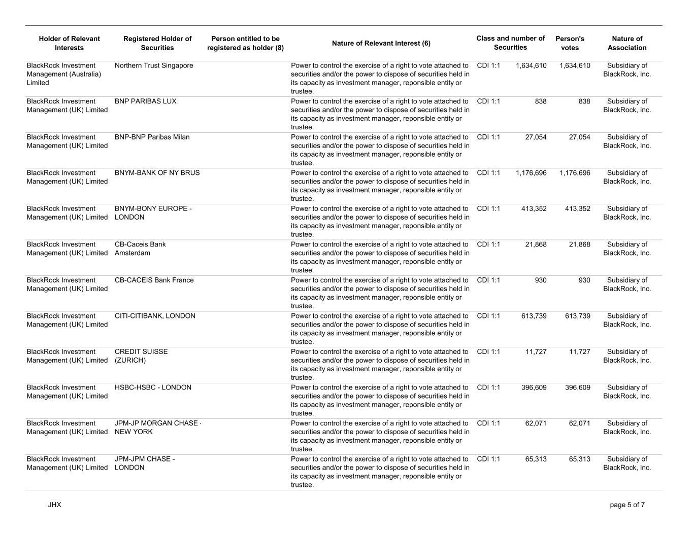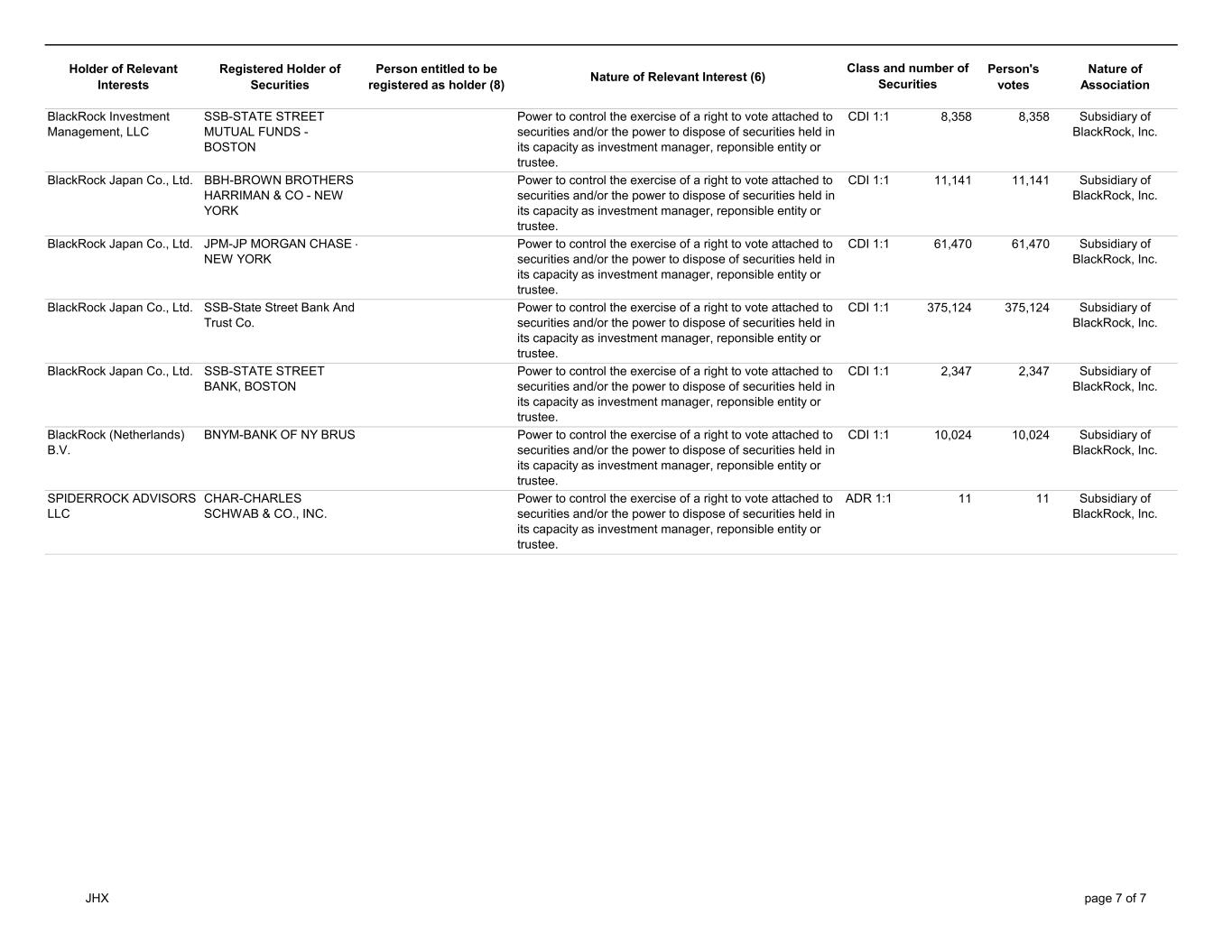 Holder of Relevant Interests Registered Holder of Securities Person entitled to be registered as holder (8) Nature of Relevant Interest (6) Person's votes Nature of Association Class and number of Securities BlackRock Investment Management (UK) Limited Northern Trust Luxembourg Power to control the exercise of a right to vote attached to securities and/or the power to dispose of securities held in its capacity as investment manager, reponsible entity or trustee. CDI 1:1 14,798 14,798 Subsidiary of BlackRock, Inc. BlackRock Investment Management (UK) Limited NT-NORTHERN TRUST UK Power to control the exercise of a right to vote attached to securities and/or the power to dispose of securities held in its capacity as investment manager, reponsible entity or trustee. CDI 1:1 194,523 194,523 Subsidiary of BlackRock, Inc. BlackRock Investment Management (UK) Limited SSB-SSB NEW YORK INSTITUTIONAL Power to control the exercise of a right to vote attached to securities and/or the power to dispose of securities held in its capacity as investment manager, reponsible entity or trustee. CDI 1:1 3,170 3,170 Subsidiary of BlackRock, Inc. BlackRock Investment Management (UK) Limited SSB-STATE STATE HONG KONG Power to control the exercise of a right to vote attached to securities and/or the power to dispose of securities held in its capacity as investment manager, reponsible entity or trustee. CDI 1:1 18,328 18,328 Subsidiary of BlackRock, Inc. BlackRock Investment Management (UK) Limited SSB-STATE STREET BANK LUXEMBOURG Power to control the exercise of a right to vote attached to securities and/or the power to dispose of securities held in its capacity as investment manager, reponsible entity or trustee. CDI 1:1 73,122 73,122 Subsidiary of BlackRock, Inc. BlackRock Investment Management (UK) Limited SSB-STATE STREET BANK, GERMANY Power to control the exercise of a right to vote attached to securities and/or the power to dispose of securities held in its capacity as investment manager, reponsible entity or trustee. CDI 1:1 15,523 15,523 Subsidiary of BlackRock, Inc. BlackRock Investment Management (UK) Limited SSB-STATE STREET LONDON Power to control the exercise of a right to vote attached to securities and/or the power to dispose of securities held in its capacity as investment manager, reponsible entity or trustee. CDI 1:1 120,207 120,207 Subsidiary of BlackRock, Inc. BlackRock Investment Management, LLC BBH-BROWN BROTHERS HARRIMAN & CO - NEW YORK Power to control the exercise of a right to vote attached to securities and/or the power to dispose of securities held in its capacity as investment manager, reponsible entity or trustee. CDI 1:1 95,258 95,258 Subsidiary of BlackRock, Inc. BlackRock Investment Management, LLC BNYM-THE BANK OF NEW YORK Power to control the exercise of a right to vote attached to securities and/or the power to dispose of securities held in its capacity as investment manager, reponsible entity or trustee. CDI 1:1 35,821 35,821 Subsidiary of BlackRock, Inc. BlackRock Investment Management, LLC JPM-JP MORGAN CHASE - NEW YORK Power to control the exercise of a right to vote attached to securities and/or the power to dispose of securities held in its capacity as investment manager, reponsible entity or trustee. CDI 1:1 197,695 197,695 Subsidiary of BlackRock, Inc. BlackRock Investment Management, LLC SSB-SSB NEW YORK INSTITUTIONAL Power to control the exercise of a right to vote attached to securities and/or the power to dispose of securities held in its capacity as investment manager, reponsible entity or trustee. CDI 1:1 19,370 19,370 Subsidiary of BlackRock, Inc. BlackRock Investment Management, LLC SSB-STATE STREET BANK LUXEMBOURG Power to control the exercise of a right to vote attached to securities and/or the power to dispose of securities held in its capacity as investment manager, reponsible entity or trustee. CDI 1:1 28,133 28,133 Subsidiary of BlackRock, Inc. JHX page 6 of 7