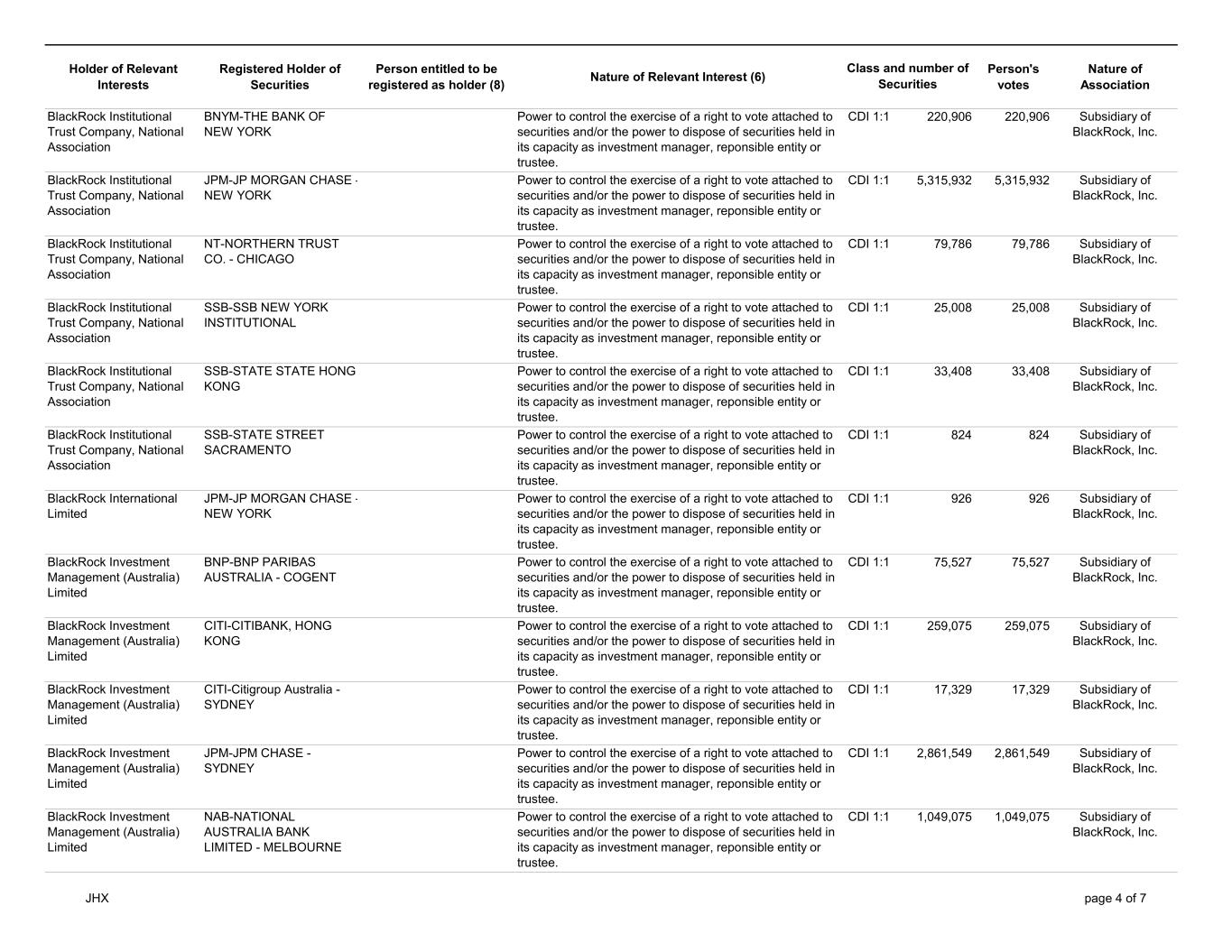 Holder of Relevant Interests Registered Holder of Securities Person entitled to be registered as holder (8) Nature of Relevant Interest (6) Person's votes Nature of Association Class and number of Securities BlackRock Institutional Trust Company, National Association BNYM-THE BANK OF NEW YORK Power to control the exercise of a right to vote attached to securities and/or the power to dispose of securities held in its capacity as investment manager, reponsible entity or trustee. CDI 1:1 220,906 220,906 Subsidiary of BlackRock, Inc. BlackRock Institutional Trust Company, National Association JPM-JP MORGAN CHASE - NEW YORK Power to control the exercise of a right to vote attached to securities and/or the power to dispose of securities held in its capacity as investment manager, reponsible entity or trustee. CDI 1:1 5,315,932 5,315,932 Subsidiary of BlackRock, Inc. BlackRock Institutional Trust Company, National Association NT-NORTHERN TRUST CO. - CHICAGO Power to control the exercise of a right to vote attached to securities and/or the power to dispose of securities held in its capacity as investment manager, reponsible entity or trustee. CDI 1:1 79,786 79,786 Subsidiary of BlackRock, Inc. BlackRock Institutional Trust Company, National Association SSB-SSB NEW YORK INSTITUTIONAL Power to control the exercise of a right to vote attached to securities and/or the power to dispose of securities held in its capacity as investment manager, reponsible entity or trustee. CDI 1:1 25,008 25,008 Subsidiary of BlackRock, Inc. BlackRock Institutional Trust Company, National Association SSB-STATE STATE HONG KONG Power to control the exercise of a right to vote attached to securities and/or the power to dispose of securities held in its capacity as investment manager, reponsible entity or trustee. CDI 1:1 33,408 33,408 Subsidiary of BlackRock, Inc. BlackRock Institutional Trust Company, National Association SSB-STATE STREET SACRAMENTO Power to control the exercise of a right to vote attached to securities and/or the power to dispose of securities held in its capacity as investment manager, reponsible entity or trustee. CDI 1:1 824 824 Subsidiary of BlackRock, Inc. BlackRock International Limited JPM-JP MORGAN CHASE - NEW YORK Power to control the exercise of a right to vote attached to securities and/or the power to dispose of securities held in its capacity as investment manager, reponsible entity or trustee. CDI 1:1 926 926 Subsidiary of BlackRock, Inc. BlackRock Investment Management (Australia) Limited BNP-BNP PARIBAS AUSTRALIA - COGENT Power to control the exercise of a right to vote attached to securities and/or the power to dispose of securities held in its capacity as investment manager, reponsible entity or trustee. CDI 1:1 75,527 75,527 Subsidiary of BlackRock, Inc. BlackRock Investment Management (Australia) Limited CITI-CITIBANK, HONG KONG Power to control the exercise of a right to vote attached to securities and/or the power to dispose of securities held in its capacity as investment manager, reponsible entity or trustee. CDI 1:1 259,075 259,075 Subsidiary of BlackRock, Inc. BlackRock Investment Management (Australia) Limited CITI-Citigroup Australia - SYDNEY Power to control the exercise of a right to vote attached to securities and/or the power to dispose of securities held in its capacity as investment manager, reponsible entity or trustee. CDI 1:1 17,329 17,329 Subsidiary of BlackRock, Inc. BlackRock Investment Management (Australia) Limited JPM-JPM CHASE - SYDNEY Power to control the exercise of a right to vote attached to securities and/or the power to dispose of securities held in its capacity as investment manager, reponsible entity or trustee. CDI 1:1 2,861,549 2,861,549 Subsidiary of BlackRock, Inc. BlackRock Investment Management (Australia) Limited NAB-NATIONAL AUSTRALIA BANK LIMITED - MELBOURNE Power to control the exercise of a right to vote attached to securities and/or the power to dispose of securities held in its capacity as investment manager, reponsible entity or trustee. CDI 1:1 1,049,075 1,049,075 Subsidiary of BlackRock, Inc. JHX page 4 of 7