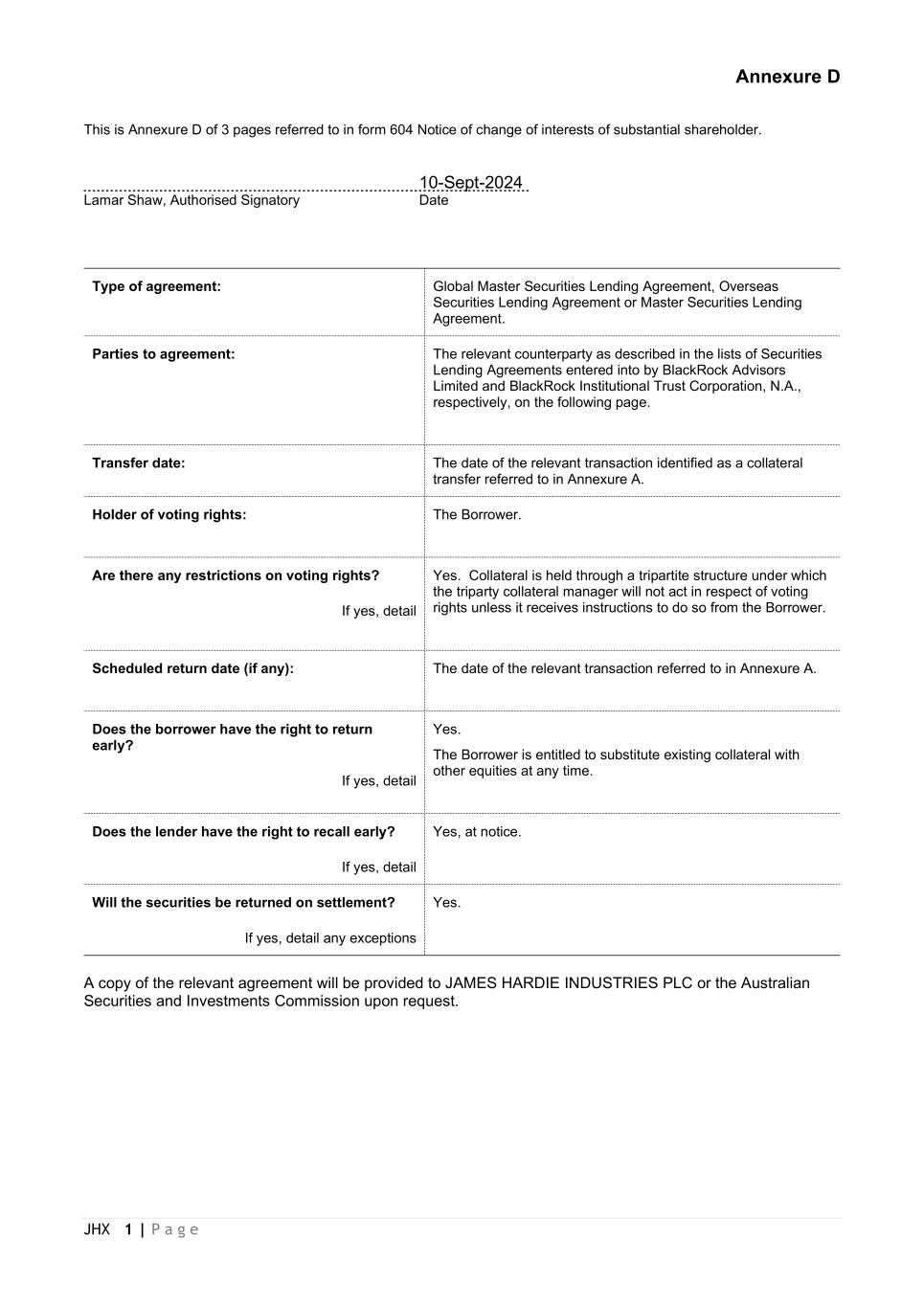 JHX 1 | P a g e Annexure D This is Annexure D of 3 pages referred to in form 604 Notice of change of interests of substantial shareholder. 10-Sept-2024 Lamar Shaw, Authorised Signatory Date Type of agreement: Global Master Securities Lending Agreement, Overseas Securities Lending Agreement or Master Securities Lending Agreement. Parties to agreement: The relevant counterparty as described in the lists of Securities Lending Agreements entered into by BlackRock Advisors Limited and BlackRock Institutional Trust Corporation, N.A., respectively, on the following page. Transfer date: The date of the relevant transaction identified as a collateral transfer referred to in Annexure A. Holder of voting rights: The Borrower. Are there any restrictions on voting rights? Yes. Collateral is held through a tripartite structure under which the triparty collateral manager will not act in respect of voting rights unless it receives instructions to do so from the Borrower. If yes, detail Scheduled return date (if any): The date of the relevant transaction referred to in Annexure A. Does the borrower have the right to return early? Yes. The Borrower is entitled to substitute existing collateral with other equities at any time. If yes, detail Does the lender have the right to recall early? Yes, at notice. If yes, detail Will the securities be returned on settlement? Yes. If yes, detail any exceptions A copy of the relevant agreement will be provided to JAMES HARDIE INDUSTRIES PLC or the Australian Securities and Investments Commission upon request.