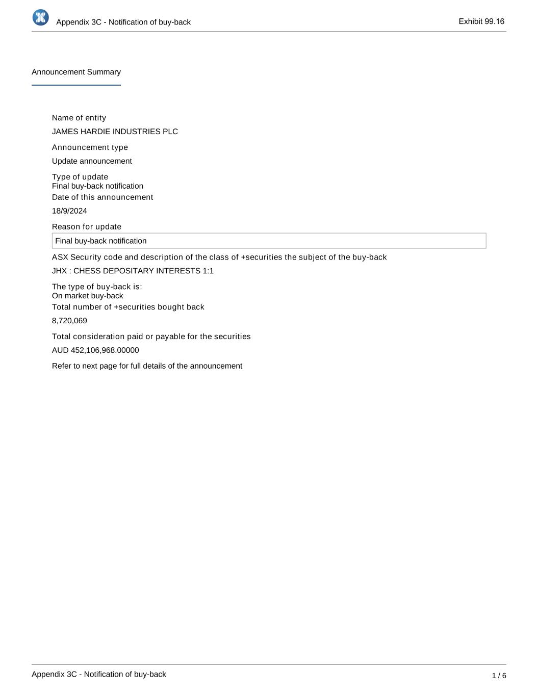 Appendix 3C - Notification of buy-back Appendix 3C - Notification of buy-back 1 / 6 Announcement Summary Name of entity JAMES HARDIE INDUSTRIES PLC Announcement type Update announcement Type of update Date of this announcement 18/9/2024 Reason for update Final buy-back notification ASX Security code and description of the class of +securities the subject of the buy-back JHX : CHESS DEPOSITARY INTERESTS 1:1 The type of buy-back is: Total number of +securities bought back 8,720,069 Total consideration paid or payable for the securities AUD 452,106,968.00000 Refer to next page for full details of the announcement On market buy-back Final buy-back notification Exhibit 99.16