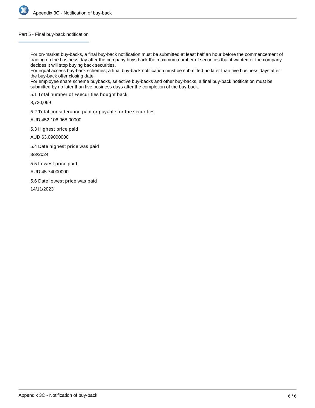 Appendix 3C - Notification of buy-back Appendix 3C - Notification of buy-back 6 / 6 Part 5 - Final buy-back notification For on-market buy-backs, a final buy-back notification must be submitted at least half an hour before the commencement of trading on the business day after the company buys back the maximum number of securities that it wanted or the company decides it will stop buying back securities. For equal access buy-back schemes, a final buy-back notification must be submitted no later than five business days after the buy-back offer closing date. For employee share scheme buybacks, selective buy-backs and other buy-backs, a final buy-back notification must be submitted by no later than five business days after the completion of the buy-back. 5.1 Total number of +securities bought back 8,720,069 5.2 Total consideration paid or payable for the securities AUD 452,106,968.00000 5.3 Highest price paid AUD 63.09000000 5.4 Date highest price was paid 8/3/2024 5.5 Lowest price paid AUD 45.74000000 5.6 Date lowest price was paid 14/11/2023