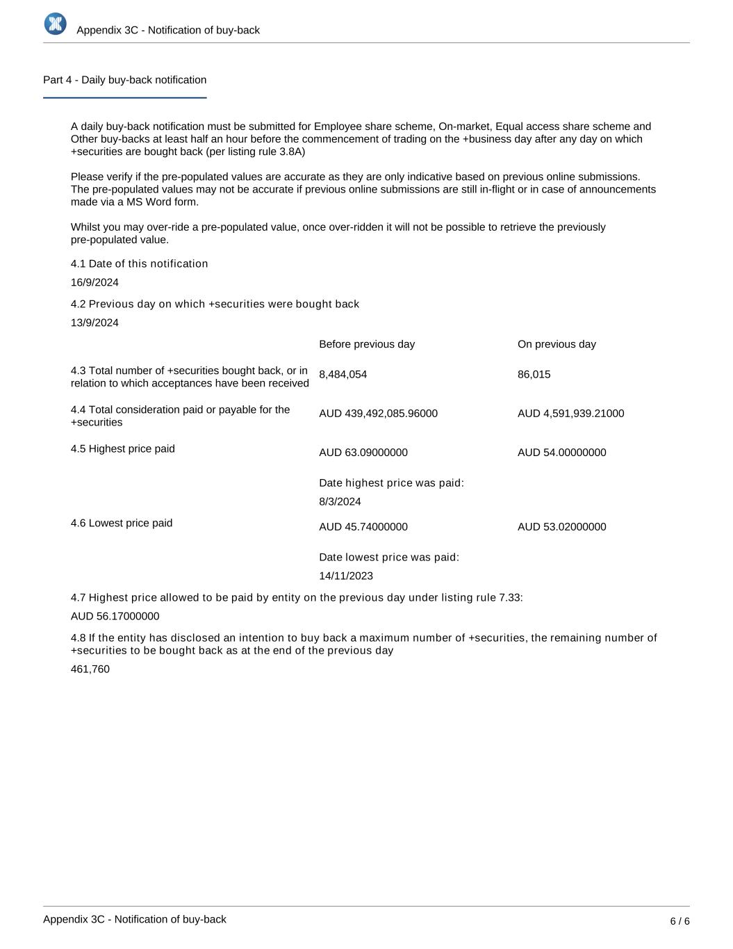 Appendix 3C - Notification of buy-back Appendix 3C - Notification of buy-back 6 / 6 Part 4 - Daily buy-back notification A daily buy-back notification must be submitted for Employee share scheme, On-market, Equal access share scheme and Other buy-backs at least half an hour before the commencement of trading on the +business day after any day on which +securities are bought back (per listing rule 3.8A)   Please verify if the pre-populated values are accurate as they are only indicative based on previous online submissions. The pre-populated values may not be accurate if previous online submissions are still in-flight or in case of announcements made via a MS Word form.   Whilst you may over-ride a pre-populated value, once over-ridden it will not be possible to retrieve the previously pre-populated value. 4.1 Date of this notification 16/9/2024 4.2 Previous day on which +securities were bought back 13/9/2024 Before previous day On previous day 4.3 Total number of +securities bought back, or in relation to which acceptances have been received 8,484,054 86,015 4.4 Total consideration paid or payable for the +securities AUD 439,492,085.96000 AUD 4,591,939.21000 4.5 Highest price paid AUD 63.09000000 AUD 54.00000000 Date highest price was paid: 8/3/2024 4.6 Lowest price paid AUD 45.74000000 AUD 53.02000000 Date lowest price was paid: 14/11/2023 4.7 Highest price allowed to be paid by entity on the previous day under listing rule 7.33: AUD 56.17000000 4.8 If the entity has disclosed an intention to buy back a maximum number of +securities, the remaining number of +securities to be bought back as at the end of the previous day 461,760