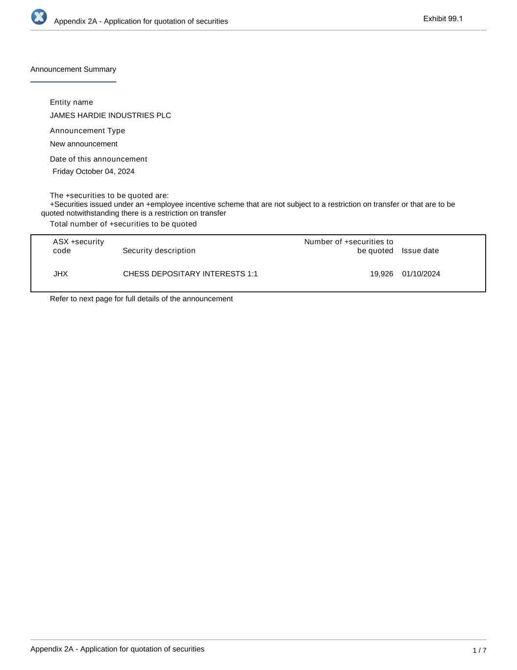 Appendix 2A - Application for quotation of securities Appendix 2A - Application for quotation of securities 1 / 7 Announcement Summary Entity name JAMES HARDIE INDUSTRIES PLC Announcement Type New announcement Date of this announcement Friday October 04, 2024 The +securities to be quoted are: Total number of +securities to be quoted ASX +security code Security description Number of +securities to be quoted Issue date JHX CHESS DEPOSITARY INTERESTS 1:1 19,926 01/10/2024 Refer to next page for full details of the announcement +Securities issued under an +employee incentive scheme that are not subject to a restriction on transfer or that are to be quoted notwithstanding there is a restriction on transfer Exhibit 99.1
