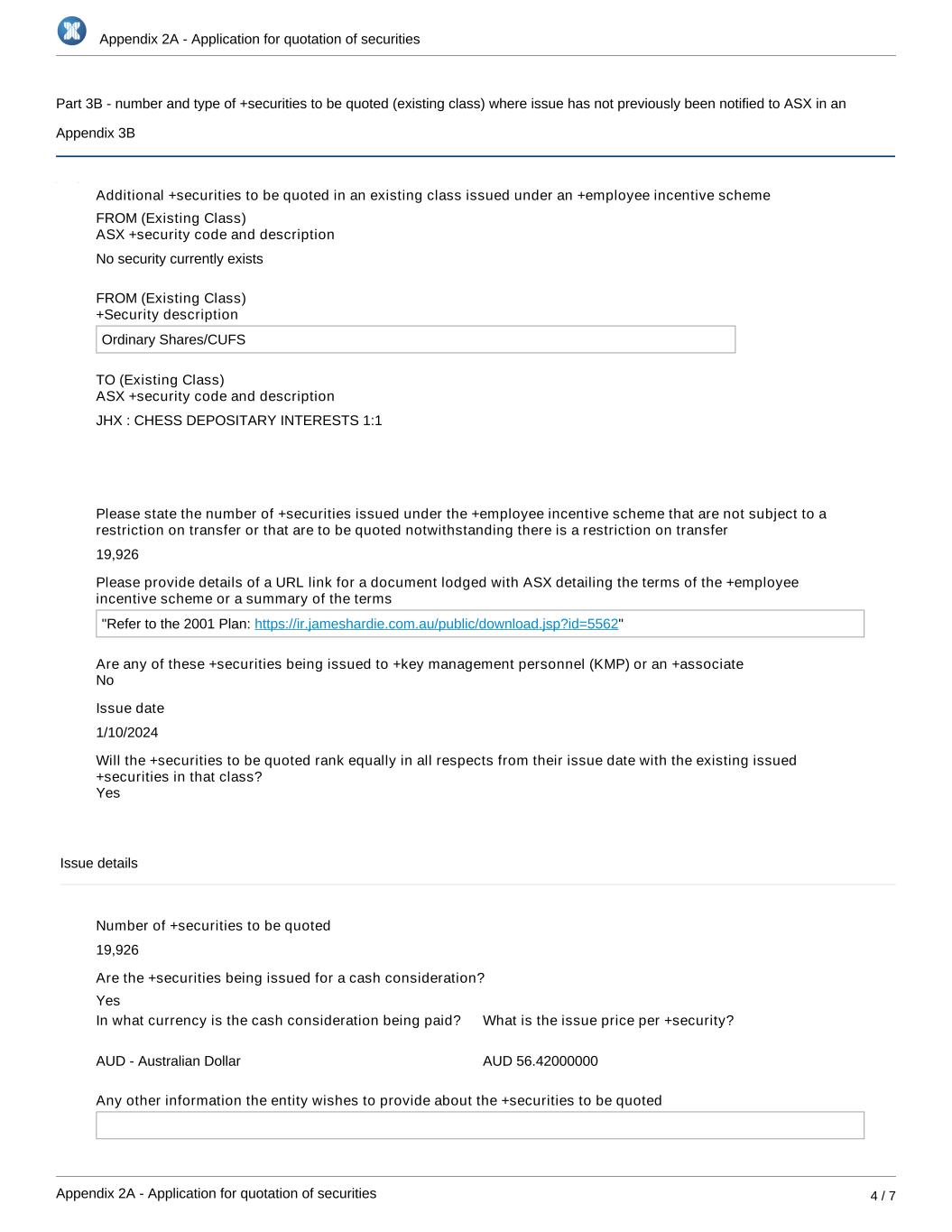 Appendix 2A - Application for quotation of securities Appendix 2A - Application for quotation of securities 4 / 7 Part 3B - number and type of +securities to be quoted (existing class) where issue has not previously been notified to ASX in an Appendix 3B Additional +securities to be quoted in an existing class issued under an +employee incentive scheme FROM (Existing Class) ASX +security code and description No security currently exists FROM (Existing Class) +Security description Ordinary Shares/CUFS TO (Existing Class) ASX +security code and description JHX : CHESS DEPOSITARY INTERESTS 1:1 Please state the number of +securities issued under the +employee incentive scheme that are not subject to a restriction on transfer or that are to be quoted notwithstanding there is a restriction on transfer 19,926 Please provide details of a URL link for a document lodged with ASX detailing the terms of the +employee incentive scheme or a summary of the terms "Refer to the 2001 Plan: "https://ir.jameshardie.com.au/public/download.jsp?id=5562 Are any of these +securities being issued to +key management personnel (KMP) or an +associate Issue date 1/10/2024 Will the +securities to be quoted rank equally in all respects from their issue date with the existing issued +securities in that class? Issue details Number of +securities to be quoted 19,926 Are the +securities being issued for a cash consideration? In what currency is the cash consideration being paid? AUD - Australian Dollar What is the issue price per +security? AUD 56.42000000 Any other information the entity wishes to provide about the +securities to be quoted Yes Yes No
