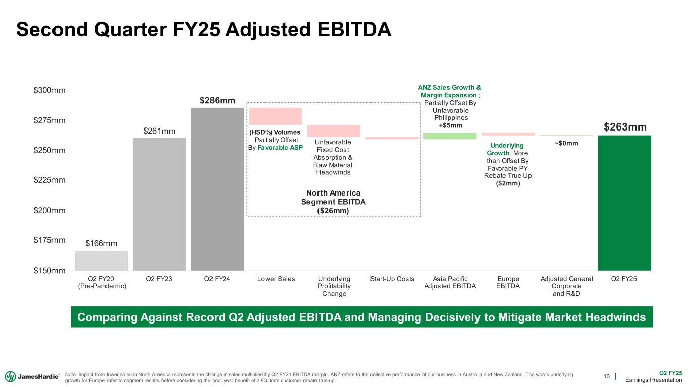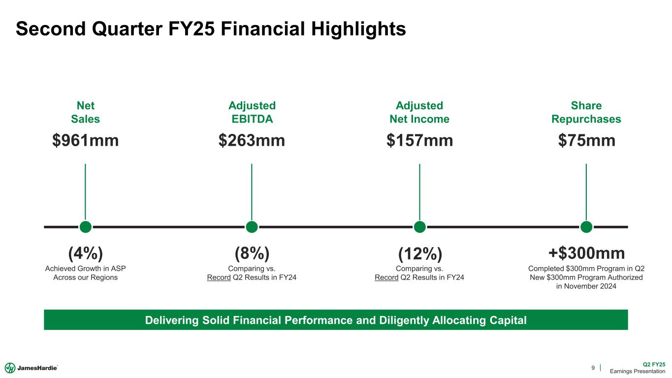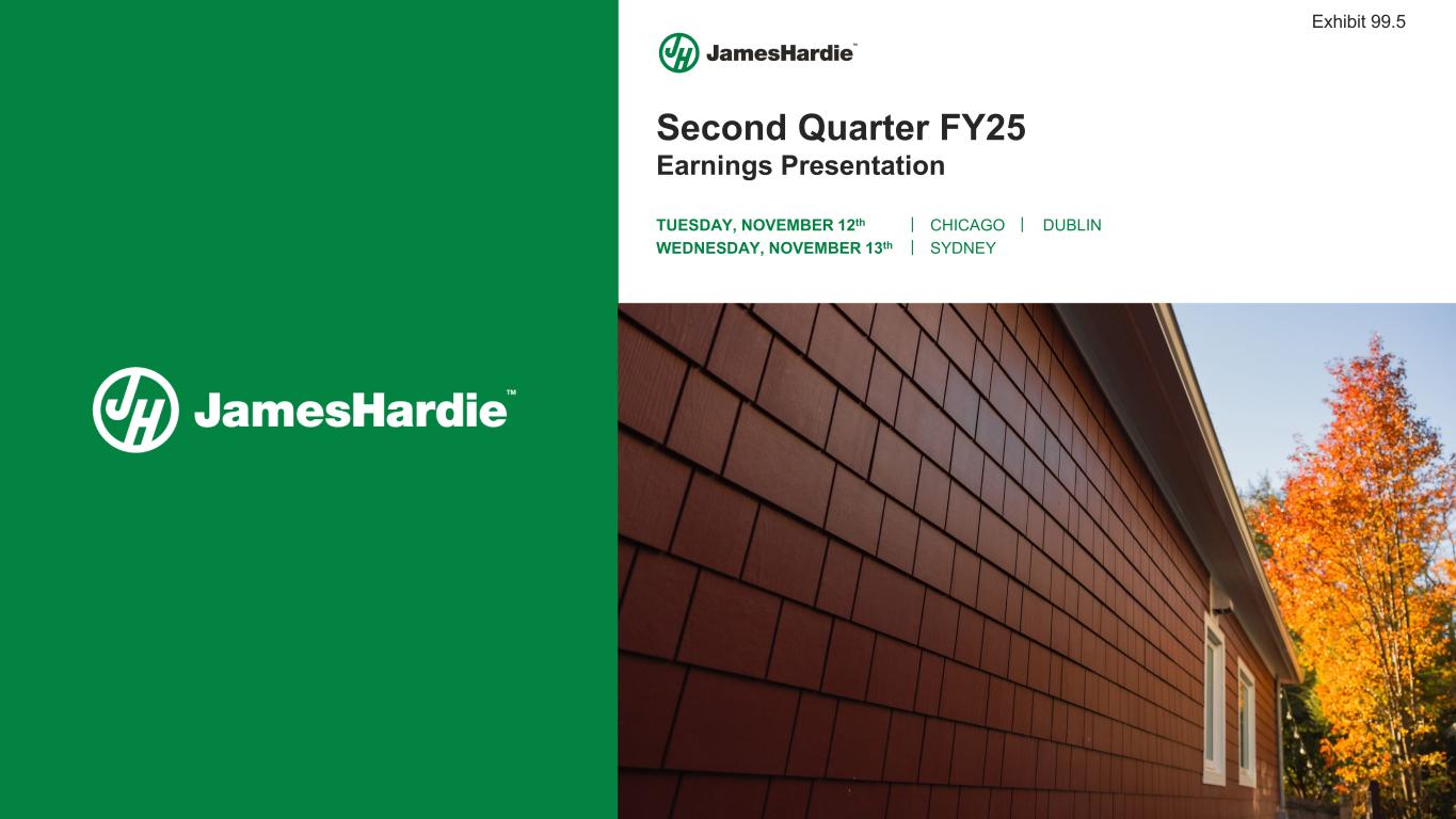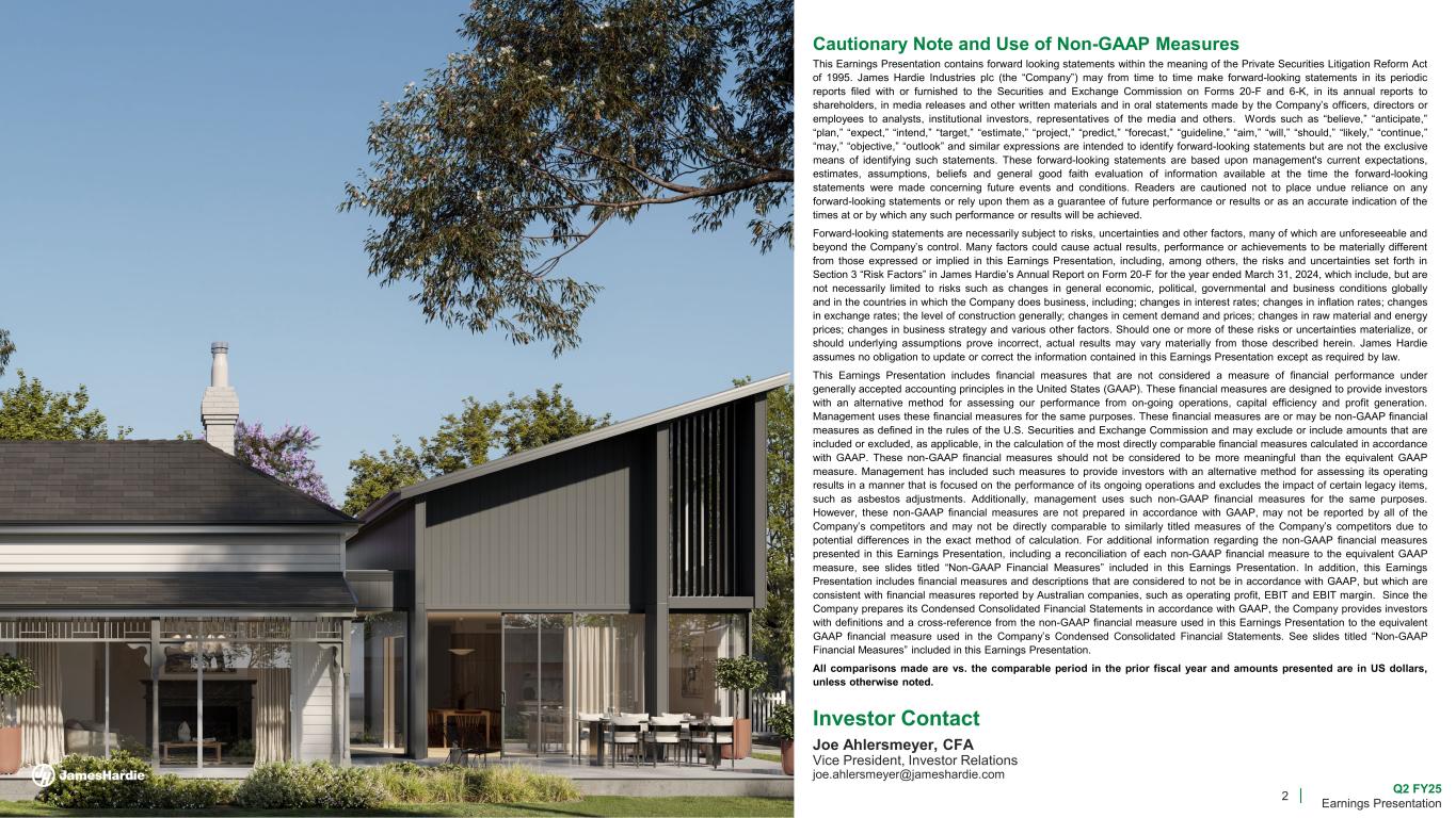 2 Q2 FY25 Earnings Presentation Cautionary Note and Use of Non-GAAP Measures This Earnings Presentation contains forward looking statements within the meaning of the Private Securities Litigation Reform Act of 1995. James Hardie Industries plc (the “Company”) may from time to time make forward-looking statements in its periodic reports filed with or furnished to the Securities and Exchange Commission on Forms 20-F and 6-K, in its annual reports to shareholders, in media releases and other written materials and in oral statements made by the Company’s officers, directors or employees to analysts, institutional investors, representatives of the media and others. Words such as “believe,” “anticipate,” “plan,” “expect,” “intend,” “target,” “estimate,” “project,” “predict,” “forecast,” “guideline,” “aim,” “will,” “should,” “likely,” “continue,” “may,” “objective,” “outlook” and similar expressions are intended to identify forward-looking statements but are not the exclusive means of identifying such statements. These forward-looking statements are based upon management's current expectations, estimates, assumptions, beliefs and general good faith evaluation of information available at the time the forward-looking statements were made concerning future events and conditions. Readers are cautioned not to place undue reliance on any forward-looking statements or rely upon them as a guarantee of future performance or results or as an accurate indication of the times at or by which any such performance or results will be achieved. Forward-looking statements are necessarily subject to risks, uncertainties and other factors, many of which are unforeseeable and beyond the Company’s control. Many factors could cause actual results, performance or achievements to be materially different from those expressed or implied in this Earnings Presentation, including, among others, the risks and uncertainties set forth in Section 3 “Risk Factors” in James Hardie’s Annual Report on Form 20-F for the year ended March 31, 2024, which include, but are not necessarily limited to risks such as changes in general economic, political, governmental and business conditions globally and in the countries in which the Company does business, including; changes in interest rates; changes in inflation rates; changes in exchange rates; the level of construction generally; changes in cement demand and prices; changes in raw material and energy prices; changes in business strategy and various other factors. Should one or more of these risks or uncertainties materialize, or should underlying assumptions prove incorrect, actual results may vary materially from those described herein. James Hardie assumes no obligation to update or correct the information contained in this Earnings Presentation except as required by law. This Earnings Presentation includes financial measures that are not considered a measure of financial performance under generally accepted accounting principles in the United States (GAAP). These financial measures are designed to provide investors with an alternative method for assessing our performance from on-going operations, capital efficiency and profit generation. Management uses these financial measures for the same purposes. These financial measures are or may be non-GAAP financial measures as defined in the rules of the U.S. Securities and Exchange Commission and may exclude or include amounts that are included or excluded, as applicable, in the calculation of the most directly comparable financial measures calculated in accordance with GAAP. These non-GAAP financial measures should not be considered to be more meaningful than the equivalent GAAP measure. Management has included such measures to provide investors with an alternative method for assessing its operating results in a manner that is focused on the performance of its ongoing operations and excludes the impact of certain legacy items, such as asbestos adjustments. Additionally, management uses such non-GAAP financial measures for the same purposes. However, these non-GAAP financial measures are not prepared in accordance with GAAP, may not be reported by all of the Company’s competitors and may not be directly comparable to similarly titled measures of the Company’s competitors due to potential differences in the exact method of calculation. For additional information regarding the non-GAAP financial measures presented in this Earnings Presentation, including a reconciliation of each non-GAAP financial measure to the equivalent GAAP measure, see slides titled “Non-GAAP Financial Measures” included in this Earnings Presentation. In addition, this Earnings Presentation includes financial measures and descriptions that are considered to not be in accordance with GAAP, but which are consistent with financial measures reported by Australian companies, such as operating profit, EBIT and EBIT margin. Since the Company prepares its Condensed Consolidated Financial Statements in accordance with GAAP, the Company provides investors with definitions and a cross-reference from the non-GAAP financial measure used in this Earnings Presentation to the equivalent GAAP financial measure used in the Company’s Condensed Consolidated Financial Statements. See slides titled “Non-GAAP Financial Measures” included in this Earnings Presentation. All comparisons made are vs. the comparable period in the prior fiscal year and amounts presented are in US dollars, unless otherwise noted. Investor Contact Joe Ahlersmeyer, CFA Vice President, Investor Relations joe.ahlersmeyer@jameshardie.com