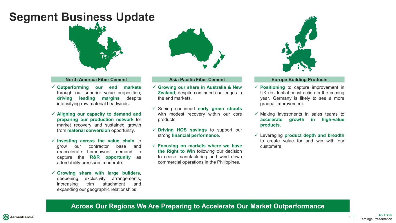 4 Q2 FY25 Earnings Presentation Delivering on Our Commitments Managing Decisively Investing for Future Growth Executing Our Strategy Key Messages Our Operational Focus Achieved Our Q2 Guidance Outperforming the Market Keeping Our Commitments Consistent Results Delivery  717 mmsft North America Volume  29.0% North America EBIT Margin  $157mm Total Adjusted Net Income Delivering On Our Commitments Through A Challenging Market Delivering Value for Our Customers