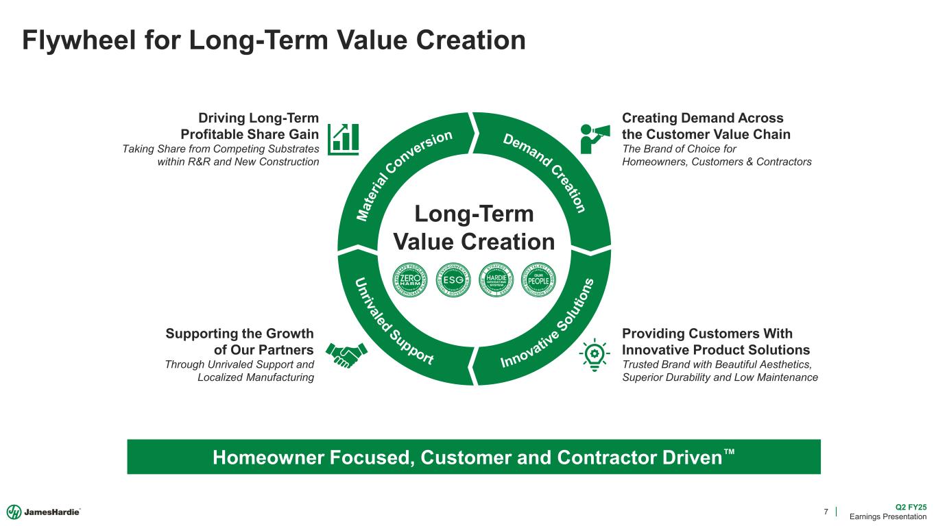 6 Q2 FY25 Earnings Presentation 1 2 3Profitably grow and take share where we have the right to win Bring our customers high valued, differentiated solutions Connect and influence all the participants in the customer value chain Our Strategy Spans the Value Chain Homeowner Focused, Customer and Contractor Driven Innovative Solutions Brand of Choice Strategic Initiatives Supported By Our Foundational Imperatives Enabled By Customer Integration Capacity Expansion
