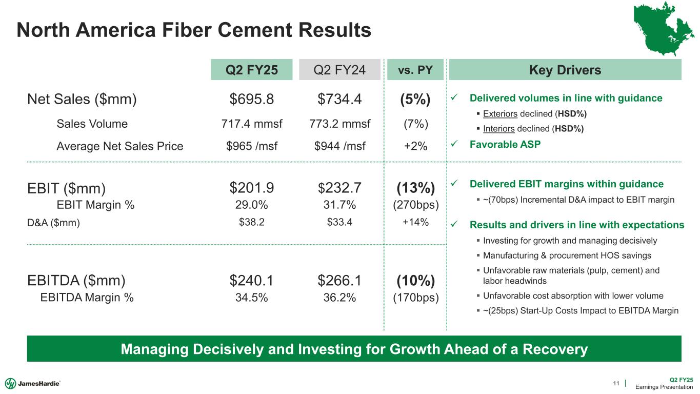 10 Q2 FY25 Earnings Presentation Second Quarter FY25 Adjusted EBITDA Note: Impact from lower sales in North America represents the change in sales multiplied by Q2 FY24 EBITDA margin. ANZ refers to the collective performance of our business in Australia and New Zealand. The words underlying growth for Europe refer to segment results before considering the prior year benefit of a €3.3mm customer rebate true-up. Comparing Against Record Q2 Adjusted EBITDA and Managing Decisively to Mitigate Market Headwinds $166mm $261mm $286mm North America Segment EBITDA ($26mm) $263mm(HSD%) Volumes Partially Offset By Favorable ASP Unfavorable Fixed Cost Absorption & Raw Material Headwinds ANZ Sales Growth & Margin Expansion ; Partially Offset By Unfavorable Philippines +$5mm Underlying Growth, More than Offset By Favorable PY Rebate True-Up ($2mm) ~$0mm $150mm $175mm $200mm $225mm $250mm $275mm $300mm Q2 FY20 (Pre-Pandemic) Q2 FY23 Q2 FY24 Lower Sales Underlying Profitability Change Start-Up Costs Asia Pacific Adjusted EBITDA Europe EBITDA Adjusted General Corporate and R&D Q2 FY25