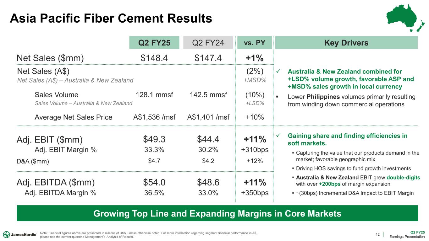 11 Q2 FY25 Earnings Presentation North America Fiber Cement Results Net Sales ($mm) EBIT ($mm) EBITDA ($mm) EBITDA Margin % EBIT Margin % Average Net Sales Price Sales Volume Q2 FY25 Q2 FY24 vs. PY $695.8 $734.4 (5%) Managing Decisively and Investing for Growth Ahead of a Recovery 717.4 mmsf 773.2 mmsf (7%) $965 /msf $944 /msf +2% $201.9 $232.7 (13%) 29.0% 31.7% (270bps) Key Drivers  Delivered volumes in line with guidance  Exteriors declined (HSD%)  Interiors declined (HSD%)  Favorable ASP  Delivered EBIT margins within guidance  ~(70bps) Incremental D&A impact to EBIT margin $240.1 $266.1 (10%) 34.5% 36.2% (170bps) D&A ($mm) $38.2 $33.4 +14%  Results and drivers in line with expectations  Investing for growth and managing decisively  Manufacturing & procurement HOS savings  Unfavorable raw materials (pulp, cement) and labor headwinds  Unfavorable cost absorption with lower volume  ~(25bps) Start-Up Costs Impact to EBITDA Margin