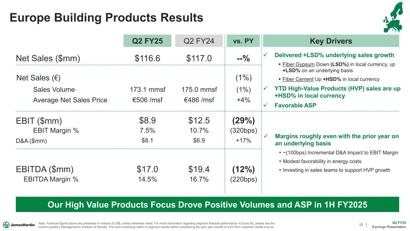 12 Q2 FY25 Earnings Presentation Asia Pacific Fiber Cement Results Net Sales ($mm) Adj. EBIT ($mm) Adj. EBITDA ($mm) Adj. EBITDA Margin % Adj. EBIT Margin % Sales Volume – Australia & New Zealand Sales Volume Q2 FY25 Q2 FY24 vs. PY $148.4 $147.4 +1% Growing Top Line and Expanding Margins in Core Markets 128.1 mmsf 142.5 mmsf (10%) +LSD% $49.3 $44.4 +11% 33.3% 30.2% +310bps Key Drivers $54.0 $48.6 +11% 36.5% 33.0% +350bps D&A ($mm) $4.7 $4.2 +12% Note: Financial figures above are presented in millions of US$, unless otherwise noted. For more information regarding segment financial performance in A$, please see the current quarter’s Management’s Analysis of Results. Net Sales (A$) (2%)  Australia & New Zealand combined for +LSD% volume growth, favorable ASP and +MSD% sales growth in local currency  Lower Philippines volumes primarily resulting from winding down commercial operations  Gaining share and finding efficiencies in soft markets.  Capturing the value that our products demand in the market; favorable geographic mix  Driving HOS savings to fund growth investments  Australia & New Zealand EBIT grew double-digits with over +200bps of margin expansion  ~(30bps) Incremental D&A Impact to EBIT Margin Average Net Sales Price A$1,536 /msf A$1,401 /msf +10% Net Sales (A$) – Australia & New Zealand +MSD%