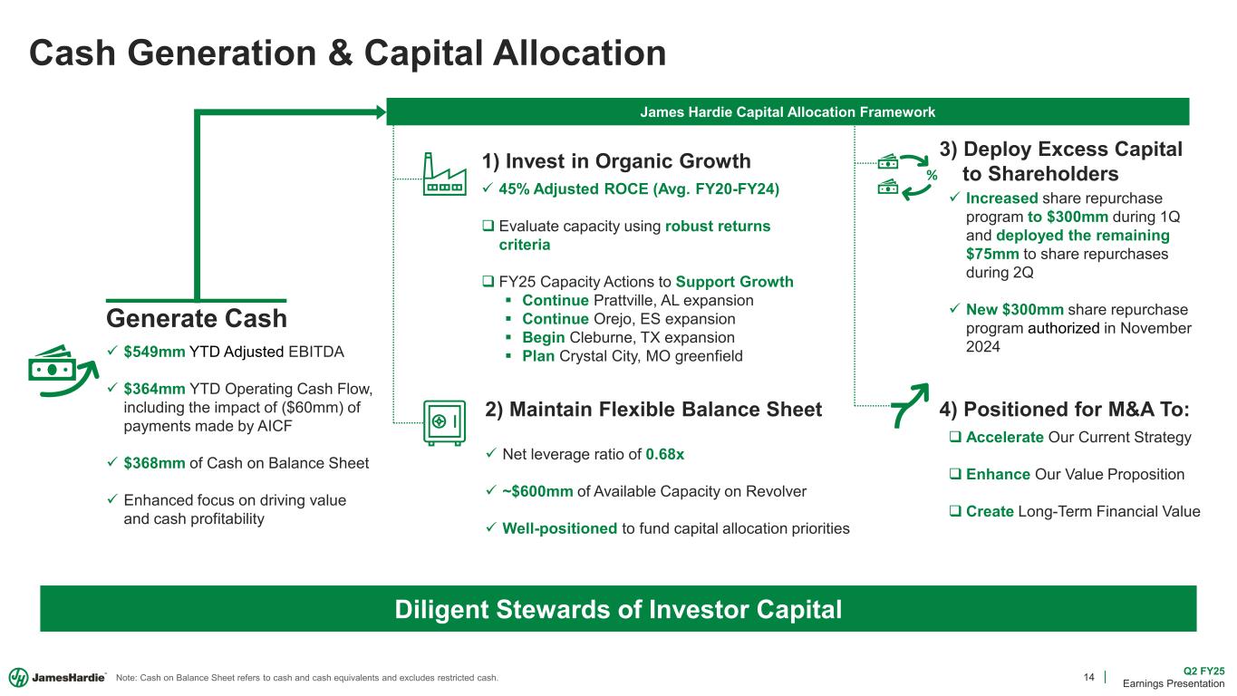 13 Q2 FY25 Earnings Presentation Europe Building Products Results Net Sales ($mm) EBIT ($mm) EBITDA ($mm) EBITDA Margin % EBIT Margin % Average Net Sales Price Sales Volume Q2 FY25 Q2 FY24 vs. PY $116.6 $117.0 --% Our High Value Products Focus Drove Positive Volumes and ASP in 1H FY2025 173.1 mmsf 175.0 mmsf (1%) €506 /msf €486 /msf +4% $8.9 $12.5 (29%) 7.5% 10.7% (320bps) Key Drivers $17.0 $19.4 (12%) 14.5% 16.7% (220bps) D&A ($mm) $8.1 $6.9 +17% Net Sales (€) (1%) Note: Financial figures above are presented in millions of US$, unless otherwise noted. For more information regarding segment financial performance in Euros (€), please see the current quarter’s Management’s Analysis of Results. The word underlying refers to segment results before considering the prior year benefit of a €3.3mm customer rebate true-up.  Delivered +LSD% underlying sales growth  Fiber Gypsum Down (LSD%) in local currency, up +LSD% on an underlying basis.  Fiber Cement Up +HSD% in local currency  YTD High-Value Products (HVP) sales are up +HSD% in local currency  Favorable ASP  Margins roughly even with the prior year on an underlying basis  ~(100bps) Incremental D&A Impact to EBIT Margin  Modest favorability in energy costs  Investing in sales teams to support HVP growth