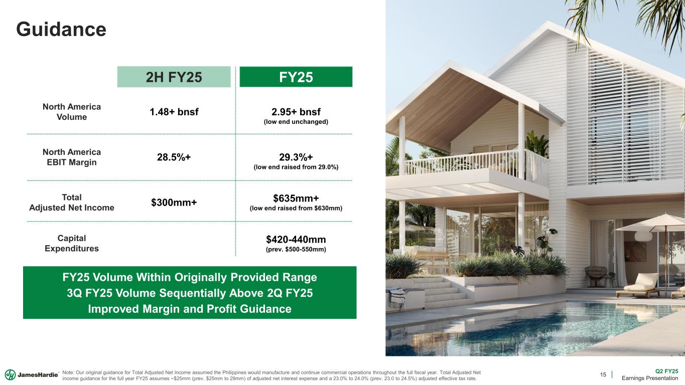 14 Q2 FY25 Earnings Presentation Cash Generation & Capital Allocation  $549mm YTD Adjusted EBITDA  $364mm YTD Operating Cash Flow, including the impact of ($60mm) of payments made by AICF  $368mm of Cash on Balance Sheet  Enhanced focus on driving value and cash profitability  Net leverage ratio of 0.68x  ~$600mm of Available Capacity on Revolver  Well-positioned to fund capital allocation priorities  45% Adjusted ROCE (Avg. FY20-FY24)  Evaluate capacity using robust returns criteria  FY25 Capacity Actions to Support Growth  Continue Prattville, AL expansion  Continue Orejo, ES expansion  Begin Cleburne, TX expansion  Plan Crystal City, MO greenfield Generate Cash 2) Maintain Flexible Balance Sheet 1) Invest in Organic Growth  Increased share repurchase program to $300mm during 1Q and deployed the remaining $75mm to share repurchases during 2Q  New $300mm share repurchase program authorized in November 2024 3) Deploy Excess Capital to Shareholders%  Accelerate Our Current Strategy  Enhance Our Value Proposition  Create Long-Term Financial Value 4) Positioned for M&A To: Diligent Stewards of Investor Capital James Hardie Capital Allocation Framework Note: Cash on Balance Sheet refers to cash and cash equivalents and excludes restricted cash.