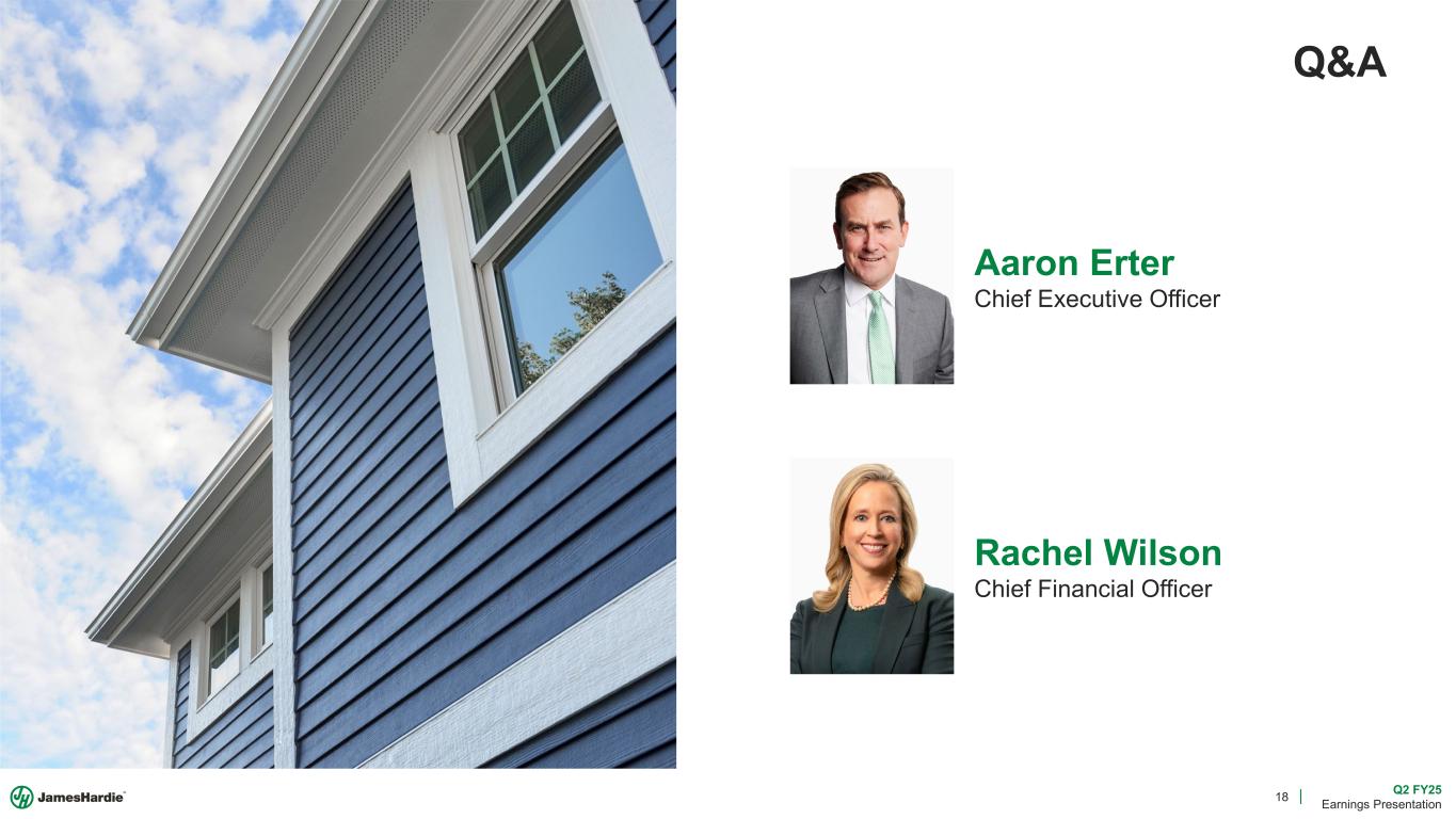 17 Q2 FY25 Earnings Presentation We Are Positioned to Accelerate Growth Long-Term Shareholder Value Creation We Have the Right Strategy We Aspire to Deliver Profitable Growth We Are Anchoring on Bold Ambitions Long-Term Value Creation Homeowner Focused, Customer and Contractor Driven +DD% +500bps $ $ $ $$ 3x Revenue Adj. EBITDA Margin Returns North America Adjusted EBITDA Note: “Homes” refers to the conceptual number of cumulative homes with Hardie® siding in North America based on total sales volumes and housing intensity of 2,600 sqft of siding per home. Double-Digit North America revenue growth includes an assumption for low single-digit % market growth, +4pp of market outperformance, and mid-single digit contribution from growth in average sale price per unit. References to increases in North America adjusted EBITDA and adjusted EBITDA margin expansion are vs. FY24. Increasing North America adjusted EBITDA by 3x incorporates management estimates for double-digit sales growth supported by capacity additions and underlying profitability improvements.