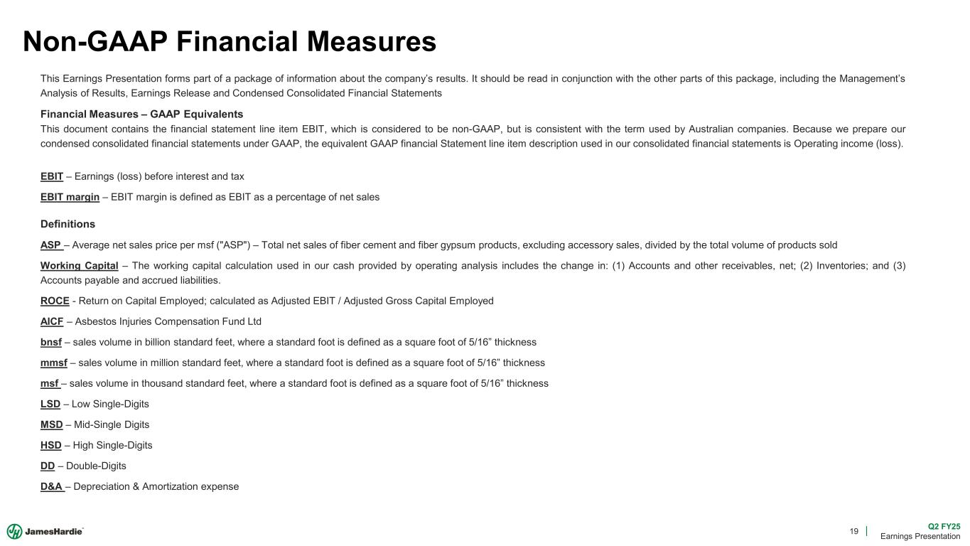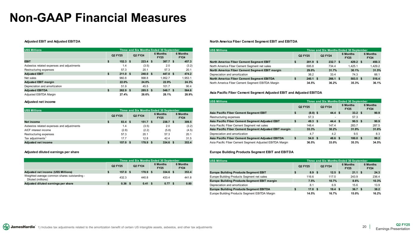 19 Q2 FY25 Earnings Presentation Non-GAAP Financial Measures This Earnings Presentation forms part of a package of information about the company’s results. It should be read in conjunction with the other parts of this package, including the Management’s Analysis of Results, Earnings Release and Condensed Consolidated Financial Statements Financial Measures – GAAP Equivalents This document contains the financial statement line item EBIT, which is considered to be non-GAAP, but is consistent with the term used by Australian companies. Because we prepare our condensed consolidated financial statements under GAAP, the equivalent GAAP financial Statement line item description used in our consolidated financial statements is Operating income (loss). EBIT – Earnings (loss) before interest and tax EBIT margin – EBIT margin is defined as EBIT as a percentage of net sales Definitions ASP – Average net sales price per msf ("ASP") – Total net sales of fiber cement and fiber gypsum products, excluding accessory sales, divided by the total volume of products sold Working Capital – The working capital calculation used in our cash provided by operating analysis includes the change in: (1) Accounts and other receivables, net; (2) Inventories; and (3) Accounts payable and accrued liabilities. ROCE - Return on Capital Employed; calculated as Adjusted EBIT / Adjusted Gross Capital Employed AICF – Asbestos Injuries Compensation Fund Ltd bnsf – sales volume in billion standard feet, where a standard foot is defined as a square foot of 5/16” thickness mmsf – sales volume in million standard feet, where a standard foot is defined as a square foot of 5/16” thickness msf – sales volume in thousand standard feet, where a standard foot is defined as a square foot of 5/16” thickness LSD – Low Single-Digits MSD – Mid-Single Digits HSD – High Single-Digits DD – Double-Digits D&A – Depreciation & Amortization expense
