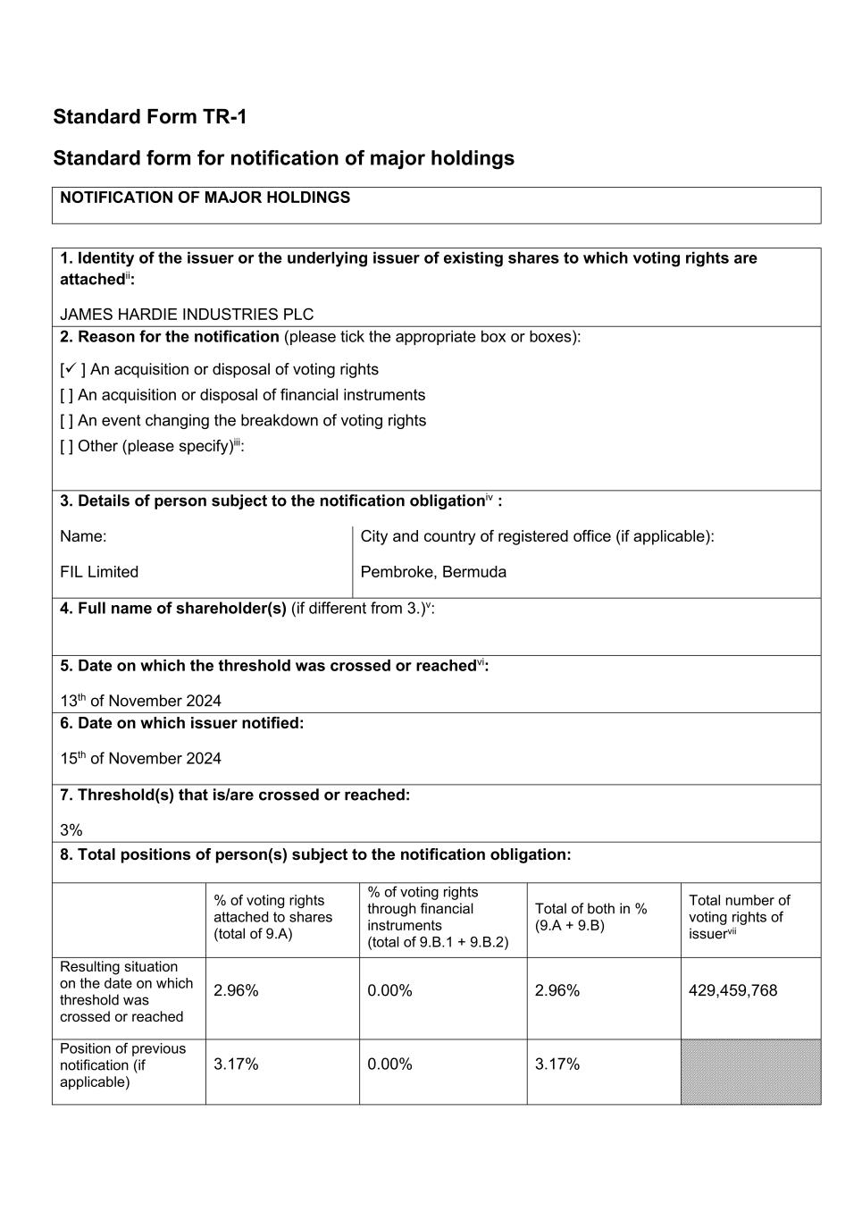 Standard Form TR-1 Standard form for notification of major holdings NOTIFICATION OF MAJOR HOLDINGS 1. Identity of the issuer or the underlying issuer of existing shares to which voting rights are attachedii: JAMES HARDIE INDUSTRIES PLC 2. Reason for the notification (please tick the appropriate box or boxes): [ ] An acquisition or disposal of voting rights [ ] An acquisition or disposal of financial instruments [ ] An event changing the breakdown of voting rights [ ] Other (please specify)iii: 3. Details of person subject to the notification obligationiv : Name: FIL Limited City and country of registered office (if applicable): Pembroke, Bermuda 4. Full name of shareholder(s) (if different from 3.)v: 5. Date on which the threshold was crossed or reachedvi: 13th of November 2024 6. Date on which issuer notified: 15th of November 2024 7. Threshold(s) that is/are crossed or reached: 3% 8. Total positions of person(s) subject to the notification obligation: % of voting rights attached to shares (total of 9.A) % of voting rights through financial instruments (total of 9.B.1 + 9.B.2) Total of both in % (9.A + 9.B) Total number of voting rights of issuervii Resulting situation on the date on which threshold was crossed or reached 2.96% 0.00% 2.96% 429,459,768 Position of previous notification (if applicable) 3.17% 0.00% 3.17%
