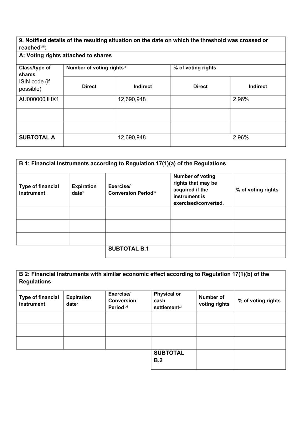 9. Notified details of the resulting situation on the date on which the threshold was crossed or reachedviii: A: Voting rights attached to shares Class/type of shares ISIN code (if possible) Number of voting rightsix % of voting rights Direct Indirect Direct Indirect AU000000JHX1 12,690,948 2.96% SUBTOTAL A 12,690,948 2.96% B 1: Financial Instruments according to Regulation 17(1)(a) of the Regulations Type of financial instrument Expiration datex Exercise/ Conversion Periodxi Number of voting rights that may be acquired if the instrument is exercised/converted. % of voting rights SUBTOTAL B.1 B 2: Financial Instruments with similar economic effect according to Regulation 17(1)(b) of the Regulations Type of financial instrument Expiration datex Exercise/ Conversion Period xi Physical or cash settlementxii Number of voting rights % of voting rights SUBTOTAL B.2