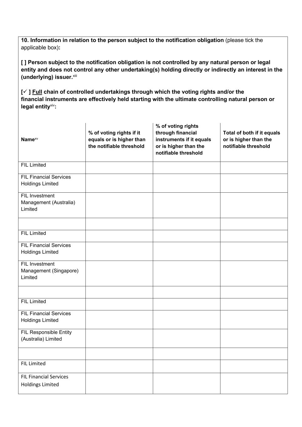 10. Information in relation to the person subject to the notification obligation (please tick the applicable box): [ ] Person subject to the notification obligation is not controlled by any natural person or legal entity and does not control any other undertaking(s) holding directly or indirectly an interest in the (underlying) issuer.xiii [ ] Full chain of controlled undertakings through which the voting rights and/or the financial instruments are effectively held starting with the ultimate controlling natural person or legal entityxiv: Namexv % of voting rights if it equals or is higher than the notifiable threshold % of voting rights through financial instruments if it equals or is higher than the notifiable threshold Total of both if it equals or is higher than the notifiable threshold FIL Limited FIL Financial Services Holdings Limited FIL Investment Management (Australia) Limited FIL Limited FIL Financial Services Holdings Limited FIL Investment Management (Singapore) Limited FIL Limited FIL Financial Services Holdings Limited FIL Responsible Entity (Australia) Limited FIL Limited FIL Financial Services Holdings Limited