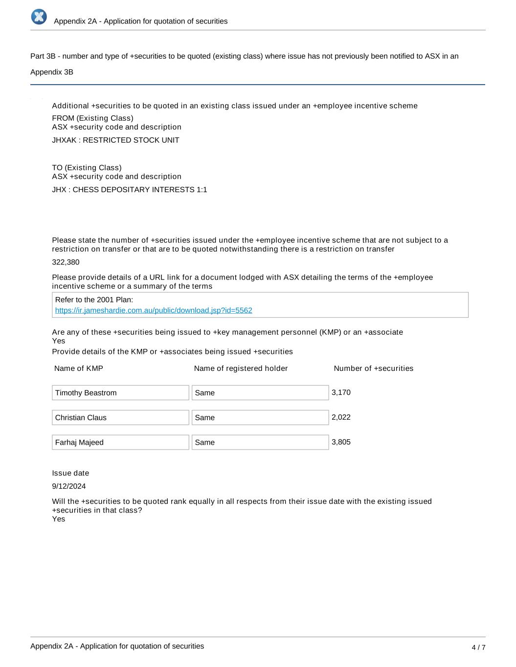 Appendix 2A - Application for quotation of securities Appendix 2A - Application for quotation of securities 4 / 7 Part 3B - number and type of +securities to be quoted (existing class) where issue has not previously been notified to ASX in an Appendix 3B Additional +securities to be quoted in an existing class issued under an +employee incentive scheme FROM (Existing Class) ASX +security code and description JHXAK : RESTRICTED STOCK UNIT TO (Existing Class) ASX +security code and description JHX : CHESS DEPOSITARY INTERESTS 1:1 Please state the number of +securities issued under the +employee incentive scheme that are not subject to a restriction on transfer or that are to be quoted notwithstanding there is a restriction on transfer 322,380 Please provide details of a URL link for a document lodged with ASX detailing the terms of the +employee incentive scheme or a summary of the terms Refer to the 2001 Plan: https://ir.jameshardie.com.au/public/download.jsp?id=5562 Are any of these +securities being issued to +key management personnel (KMP) or an +associate Provide details of the KMP or +associates being issued +securities Name of KMP Name of registered holder Number of +securities Timothy Beastrom Same 3,170 Christian Claus Same 2,022 Farhaj Majeed Same 3,805 Issue date 9/12/2024 Will the +securities to be quoted rank equally in all respects from their issue date with the existing issued +securities in that class? Yes Yes