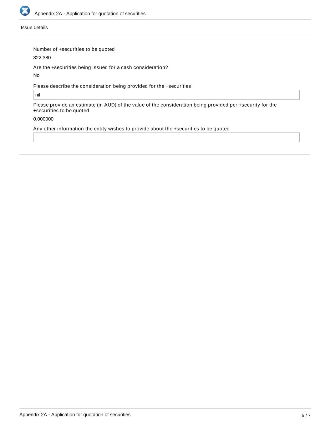 Appendix 2A - Application for quotation of securities Appendix 2A - Application for quotation of securities 5 / 7 Issue details Number of +securities to be quoted 322,380 Are the +securities being issued for a cash consideration? Please describe the consideration being provided for the +securities nil Please provide an estimate (in AUD) of the value of the consideration being provided per +security for the +securities to be quoted 0.000000 Any other information the entity wishes to provide about the +securities to be quoted No