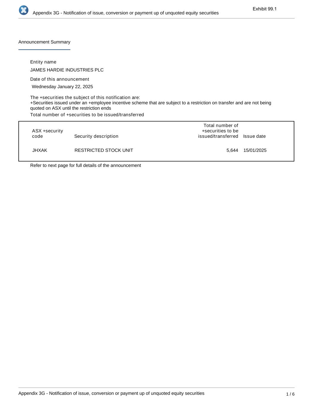 Appendix 3G - Notification of issue, conversion or payment up of unquoted equity securities Appendix 3G - Notification of issue, conversion or payment up of unquoted equity securities 1 / 6 Announcement Summary Entity name JAMES HARDIE INDUSTRIES PLC Date of this announcement Wednesday January 22, 2025 The +securities the subject of this notification are: Total number of +securities to be issued/transferred ASX +security code Security description Total number of +securities to be issued/transferred Issue date JHXAK RESTRICTED STOCK UNIT 5,644 15/01/2025 Refer to next page for full details of the announcement +Securities issued under an +employee incentive scheme that are subject to a restriction on transfer and are not being quoted on ASX until the restriction ends Exhibit 99.1