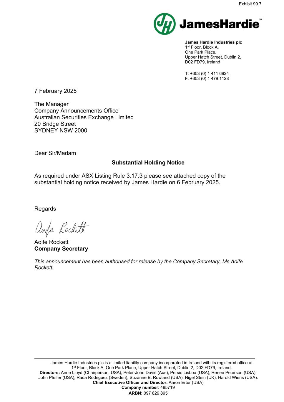 James Hardie Industries plc 1st Floor, Block A, One Park Place, Upper Hatch Street, Dublin 2, D02 FD79, Ireland T: +353 (0) 1 411 6924 F: +353 (0) 1 479 1128 James Hardie Industries plc is a limited liability company incorporated in Ireland with its registered office at 1st Floor, Block A, One Park Place, Upper Hatch Street, Dublin 2, D02 FD79, Ireland. Directors: Anne Lloyd (Chairperson, USA), Peter-John Davis (Aus), Persio Lisboa (USA), Renee Peterson (USA), John Pfeifer (USA), Rada Rodriguez (Sweden), Suzanne B. Rowland (USA), Nigel Stein (UK), Harold Wiens (USA). Chief Executive Officer and Director: Aaron Erter (USA) Company number: 485719 ARBN: 097 829 895 7 February 2025 The Manager Company Announcements Office Australian Securities Exchange Limited 20 Bridge Street SYDNEY NSW 2000 Dear Sir/Madam Substantial Holding Notice As required under ASX Listing Rule 3.17.3 please see attached copy of the substantial holding notice received by James Hardie on 6 February 2025. Regards Aoife Rockett Company Secretary This announcement has been authorised for release by the Company Secretary, Ms Aoife Rockett. Exhibit 99.7