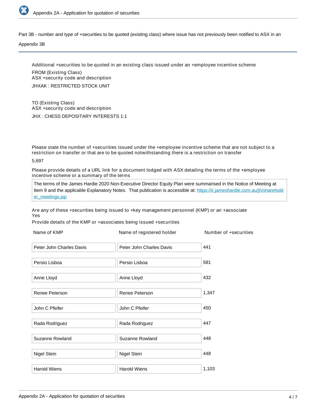 Appendix 2A - Application for quotation of securities Appendix 2A - Application for quotation of securities 4 / 7 Part 3B - number and type of +securities to be quoted (existing class) where issue has not previously been notified to ASX in an Appendix 3B Additional +securities to be quoted in an existing class issued under an +employee incentive scheme FROM (Existing Class) ASX +security code and description JHXAK : RESTRICTED STOCK UNIT TO (Existing Class) ASX +security code and description JHX : CHESS DEPOSITARY INTERESTS 1:1 Please state the number of +securities issued under the +employee incentive scheme that are not subject to a restriction on transfer or that are to be quoted notwithstanding there is a restriction on transfer 5,697 Please provide details of a URL link for a document lodged with ASX detailing the terms of the +employee incentive scheme or a summary of the terms The terms of the James Hardie 2020 Non-Executive Director Equity Plan were summarised in the Notice of Meeting at Item 9 and the applicable Explanatory Notes. That publication is accessible at: https://ir.jameshardie.com.au/jh/sharehold er_meetings.jsp Are any of these +securities being issued to +key management personnel (KMP) or an +associate Provide details of the KMP or +associates being issued +securities Name of KMP Name of registered holder Number of +securities Peter John Charles Davis Peter John Charles Davis 441 Persio Lisboa Persio Lisboa 581 Anne Lloyd Anne Lloyd 432 Renee Peterson Renee Peterson 1,347 John C Pfeifer John C Pfeifer 450 Rada Rodriguez Rada Rodriguez 447 Suzanne Rowland Suzanne Rowland 448 Nigel Stein Nigel Stein 448 Harold Wiens Harold Wiens 1,103 Issue date Yes