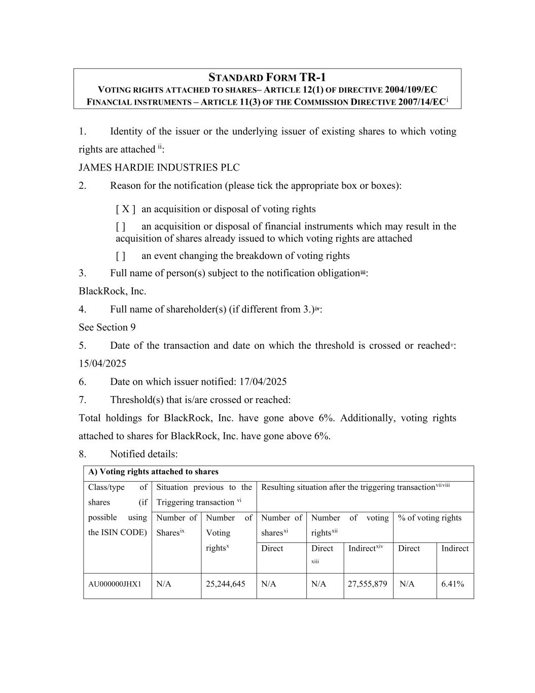 STANDARD FORM TR-1 VOTING RIGHTS ATTACHED TO SHARES– ARTICLE 12(1) OF DIRECTIVE 2004/109/EC FINANCIAL INSTRUMENTS – ARTICLE 11(3) OF THE COMMISSION DIRECTIVE 2007/14/ECi 1. Identity of the issuer or the underlying issuer of existing shares to which voting rights are attached ii: JAMES HARDIE INDUSTRIES PLC 2. Reason for the notification (please tick the appropriate box or boxes): [ X ] an acquisition or disposal of voting rights [ ] an acquisition or disposal of financial instruments which may result in the acquisition of shares already issued to which voting rights are attached [ ] an event changing the breakdown of voting rights 3. Full name of person(s) subject to the notification obligationiii: BlackRock, Inc. 4. Full name of shareholder(s) (if different from 3.) iv: See Section 9 5. Date of the transaction and date on which the threshold is crossed or reachedv: 15/04/2025 6. Date on which issuer notified: 17/04/2025 7. Threshold(s) that is/are crossed or reached: Total holdings for BlackRock, Inc. have gone above 6%. Additionally, voting rights attached to shares for BlackRock, Inc. have gone above 6%. 8. Notified details: A) Voting rights attached to shares Class/type of shares (if possible using the ISIN CODE) Situation previous to the Triggering transaction vi Resulting situation after the triggering transactionviiviii Number of Sharesix Number of Voting rightsx Number of sharesxi Number of voting rightsxii % of voting rights Direct Direct xiii Indirectxiv Direct Indirect AU000000JHX1 N/A 25,244,645 N/A N/A 27,555,879 N/A 6.41%