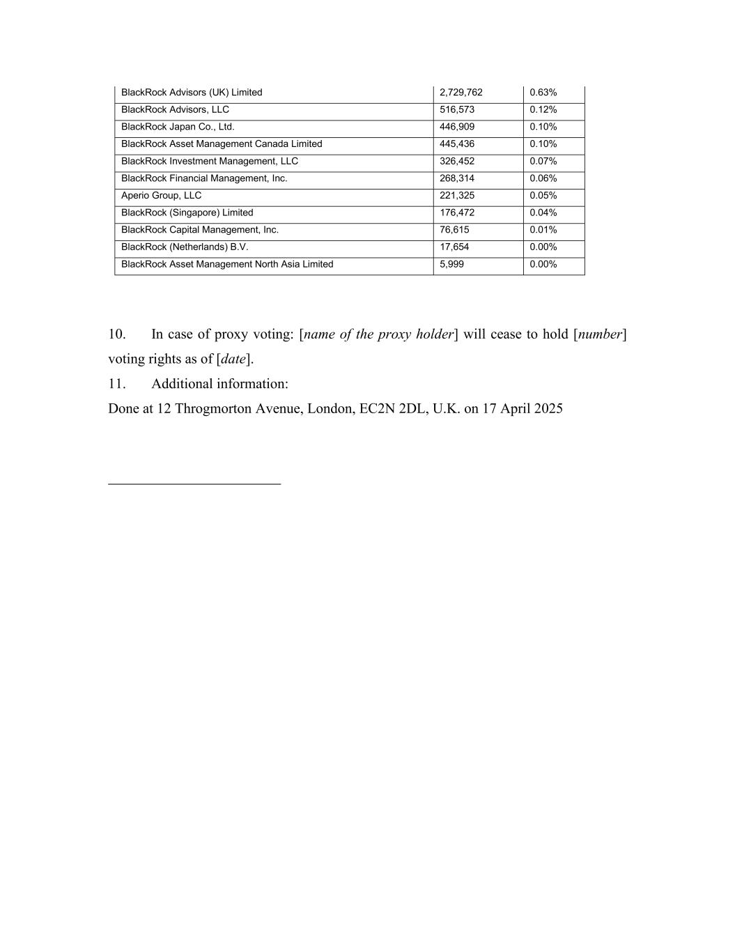 BlackRock Advisors (UK) Limited 2,729,762 0.63% BlackRock Advisors, LLC 516,573 0.12% BlackRock Japan Co., Ltd. 446,909 0.10% BlackRock Asset Management Canada Limited 445,436 0.10% BlackRock Investment Management, LLC 326,452 0.07% BlackRock Financial Management, Inc. 268,314 0.06% Aperio Group, LLC 221,325 0.05% BlackRock (Singapore) Limited 176,472 0.04% BlackRock Capital Management, Inc. 76,615 0.01% BlackRock (Netherlands) B.V. 17,654 0.00% BlackRock Asset Management North Asia Limited 5,999 0.00% 10. In case of proxy voting: [name of the proxy holder] will cease to hold [number] voting rights as of [date]. 11. Additional information: Done at 12 Throgmorton Avenue, London, EC2N 2DL, U.K. on 17 April 2025