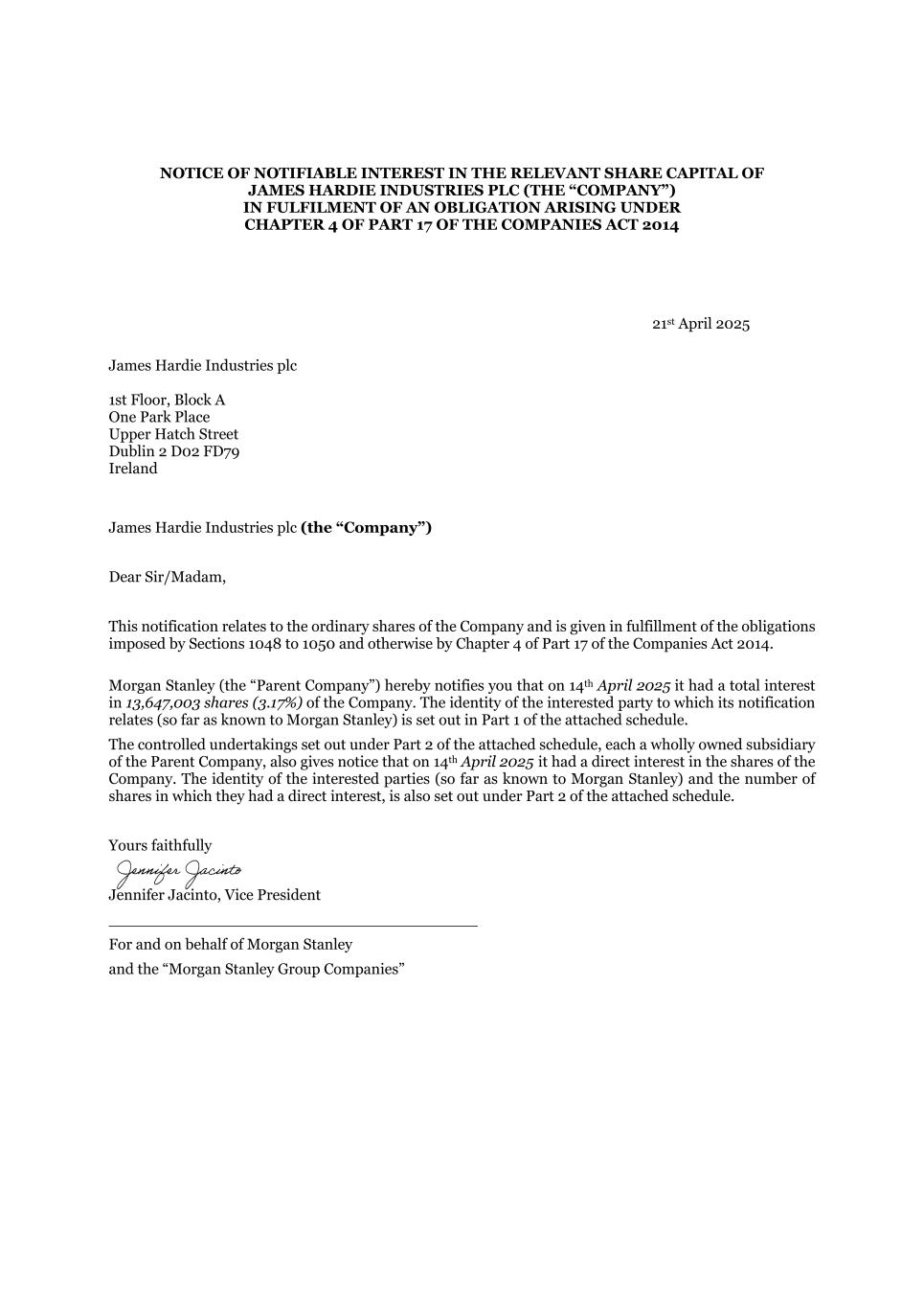 NOTICE OF NOTIFIABLE INTEREST IN THE RELEVANT SHARE CAPITAL OF JAMES HARDIE INDUSTRIES PLC (THE “COMPANY”) IN FULFILMENT OF AN OBLIGATION ARISING UNDER CHAPTER 4 OF PART 17 OF THE COMPANIES ACT 2014 21st April 2025 James Hardie Industries plc 1st Floor, Block A One Park Place Upper Hatch Street Dublin 2 D02 FD79 Ireland James Hardie Industries plc (the “Company”) Dear Sir/Madam, This notification relates to the ordinary shares of the Company and is given in fulfillment of the obligations imposed by Sections 1048 to 1050 and otherwise by Chapter 4 of Part 17 of the Companies Act 2014. Morgan Stanley (the “Parent Company”) hereby notifies you that on 14th April 2025 it had a total interest in 13,647,003 shares (3.17%) of the Company. The identity of the interested party to which its notification relates (so far as known to Morgan Stanley) is set out in Part 1 of the attached schedule. The controlled undertakings set out under Part 2 of the attached schedule, each a wholly owned subsidiary of the Parent Company, also gives notice that on 14th April 2025 it had a direct interest in the shares of the Company. The identity of the interested parties (so far as known to Morgan Stanley) and the number of shares in which they had a direct interest, is also set out under Part 2 of the attached schedule. Yours faithfully Jennifer Jacinto, Vice President ______________________________________ For and on behalf of Morgan Stanley and the “Morgan Stanley Group Companies”