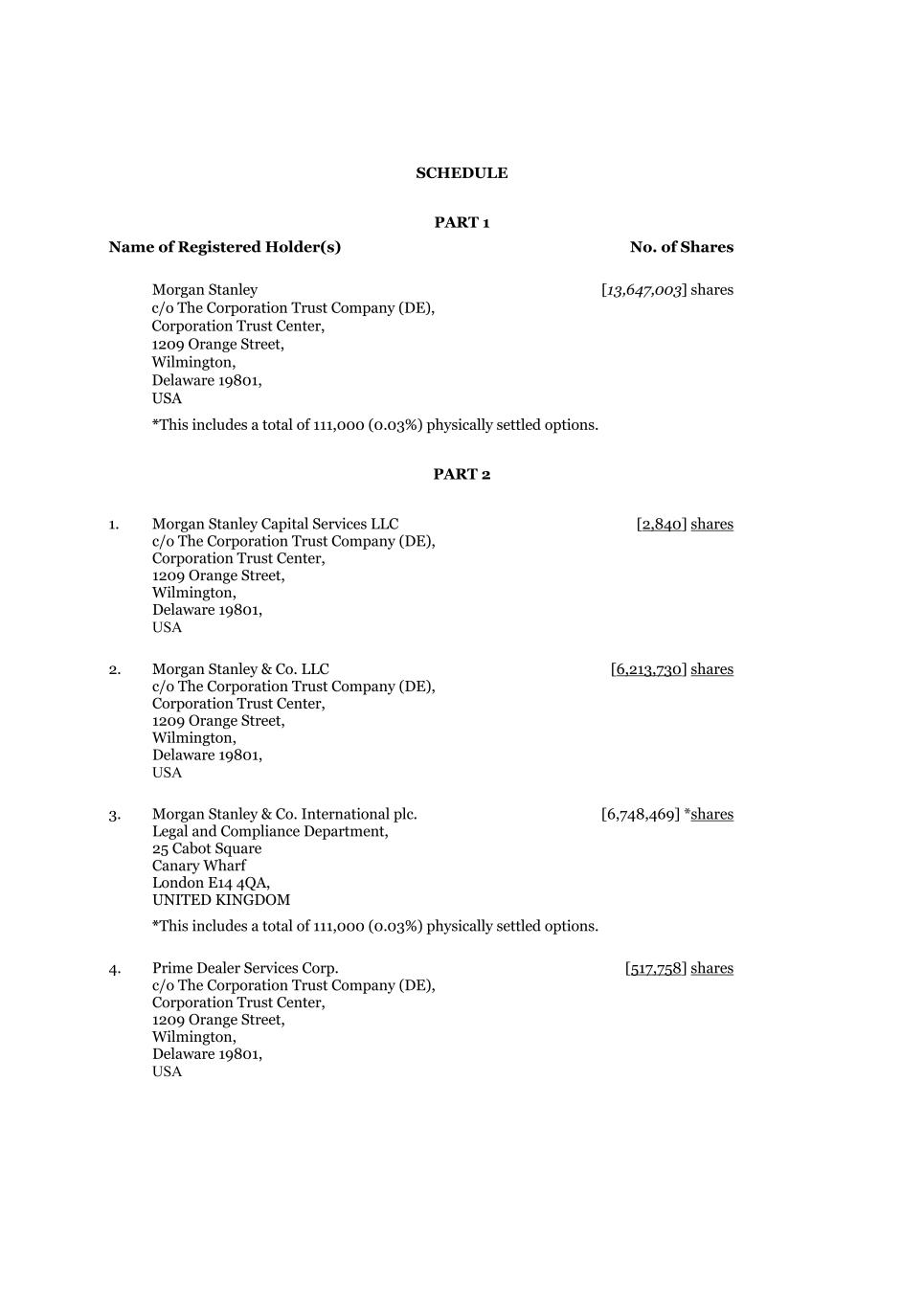 SCHEDULE PART 1 Name of Registered Holder(s) No. of Shares Morgan Stanley [13,647,003] shares c/o The Corporation Trust Company (DE), Corporation Trust Center, 1209 Orange Street, Wilmington, Delaware 19801, USA *This includes a total of 111,000 (0.03%) physically settled options. PART 2 1. Morgan Stanley Capital Services LLC [2,840] shares c/o The Corporation Trust Company (DE), Corporation Trust Center, 1209 Orange Street, Wilmington, Delaware 19801, USA 2. Morgan Stanley & Co. LLC [6,213,730] shares c/o The Corporation Trust Company (DE), Corporation Trust Center, 1209 Orange Street, Wilmington, Delaware 19801, USA 3. Morgan Stanley & Co. International plc. [6,748,469] *shares Legal and Compliance Department, 25 Cabot Square Canary Wharf London E14 4QA, UNITED KINGDOM *This includes a total of 111,000 (0.03%) physically settled options. 4. Prime Dealer Services Corp. [517,758] shares c/o The Corporation Trust Company (DE), Corporation Trust Center, 1209 Orange Street, Wilmington, Delaware 19801, USA