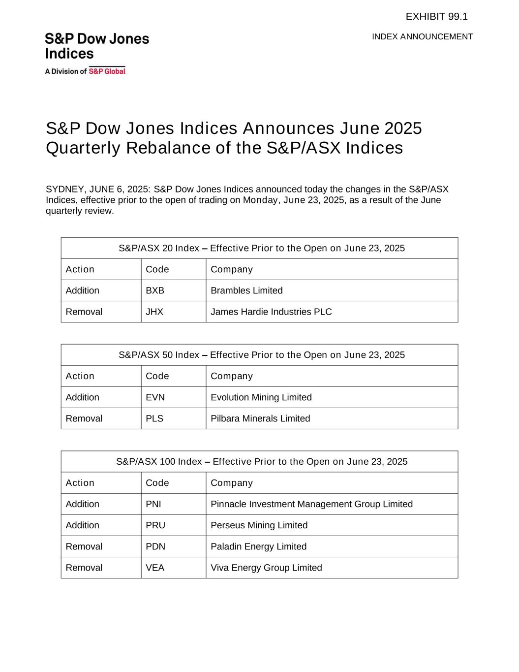 INDEX ANNOUNCEMENT S&P Dow Jones Indices Announces June 2025 Quarterly Rebalance of the S&P/ASX Indices SYDNEY, JUNE 6, 2025: S&P Dow Jones Indices announced today the changes in the S&P/ASX Indices, effective prior to the open of trading on Monday, June 23, 2025, as a result of the June quarterly review. S&P/ASX 20 Index – Effective Prior to the Open on June 23, 2025 Action Code Company Addition BXB Brambles Limited Removal JHX James Hardie Industries PLC S&P/ASX 50 Index – Effective Prior to the Open on June 23, 2025 Action Code Company Addition EVN Evolution Mining Limited Removal PLS Pilbara Minerals Limited S&P/ASX 100 Index – Effective Prior to the Open on June 23, 2025 Action Code Company Addition PNI Pinnacle Investment Management Group Limited Addition PRU Perseus Mining Limited Removal PDN Paladin Energy Limited Removal VEA Viva Energy Group Limited